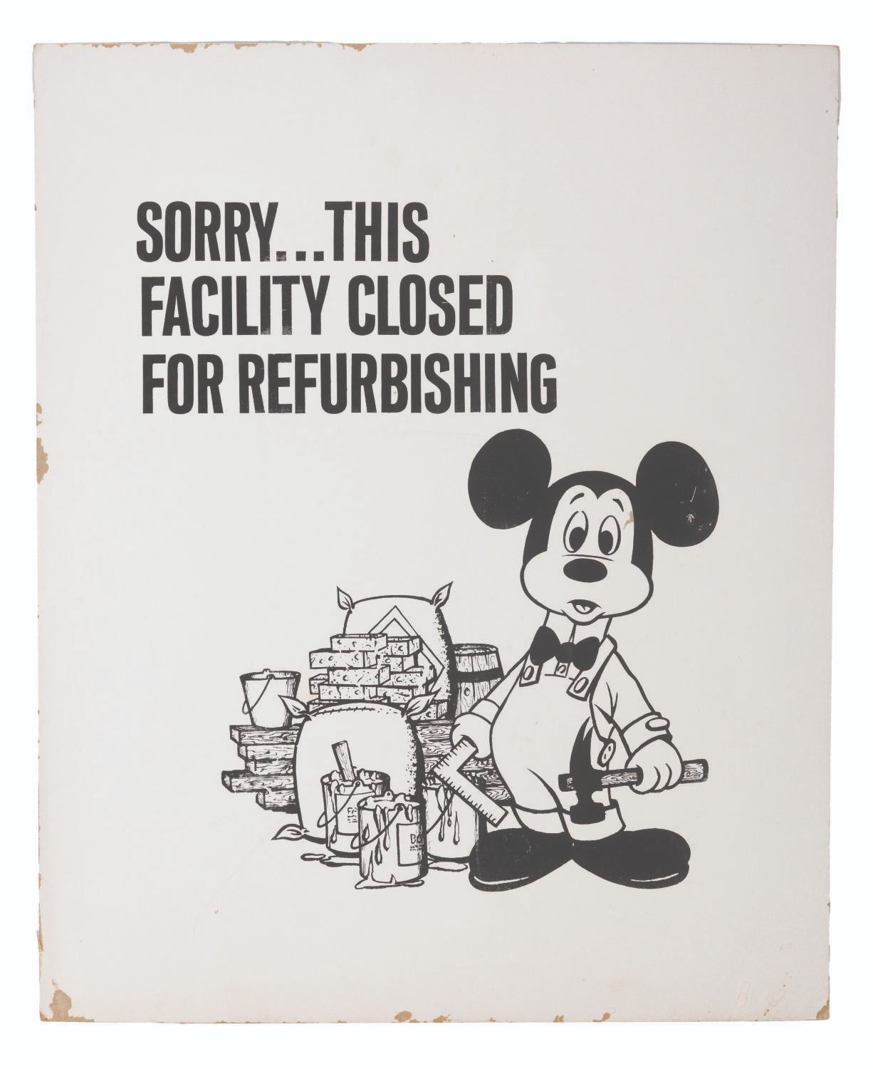 (Disneyland, 1960s-70s) A very rare"Sorry...This Facility is Closed for Refurbishing" sign featuring Mickey Mouse and used in Disneyland Park. Measuring 18" x 22", the artboard sign displays in good condition with typical wear from Park use, including edge wear and light soiling overall.