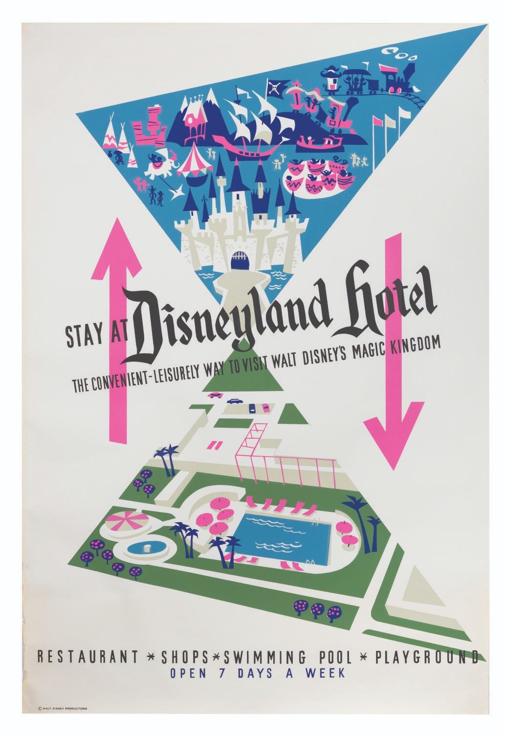 (Disneyland, 1956) An original hand-silkscreened attraction poster for the Disneyland Hotel. Designed by Bjorn Aronson, the poster cleverly cross-promotes the Park and Hotel attractions including the Gourmet restaurant, shops, swimming pool, and the children's playground. Measuring 36” x 54”, this gorgeous poster displays in very good condition with heavy edge wear, light creases, and discoloration from age.