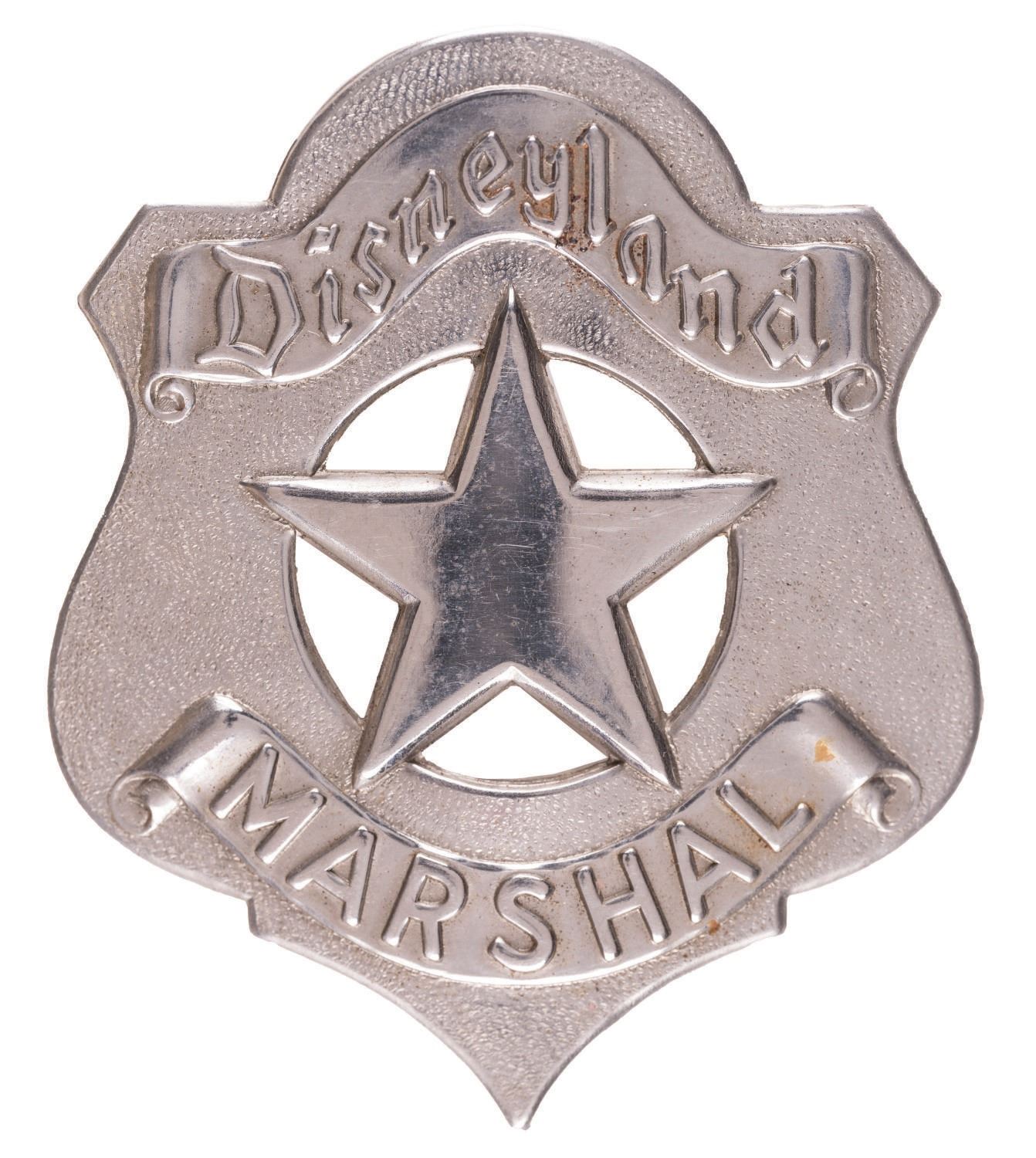 (Disneyland, 1960s) A rare costume badge worn by Frontierland area Cast Members portraying the Disneyland Marshall. Only a handful of Cast Members were selected to wear a badge of this style and portray a Marshall in Frontierland. Measuring 2"x2.5", the metal badge is in very good condition with scuffs and wear from park use and features a small Walt Disney Productions copyright note on reverse.