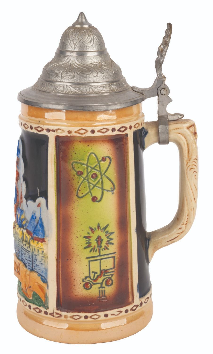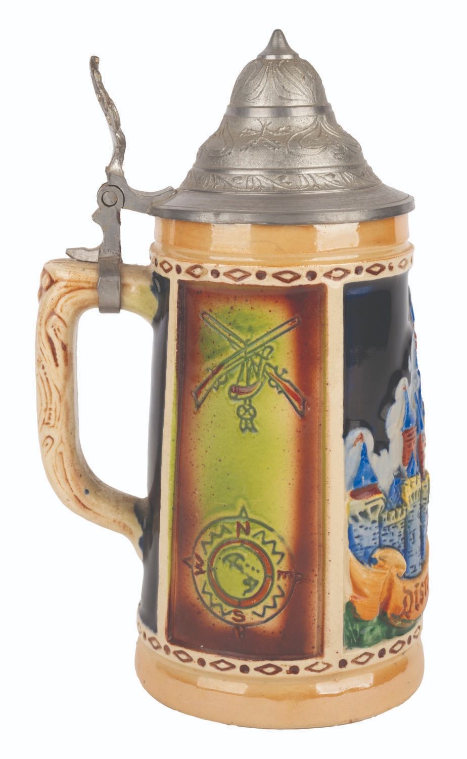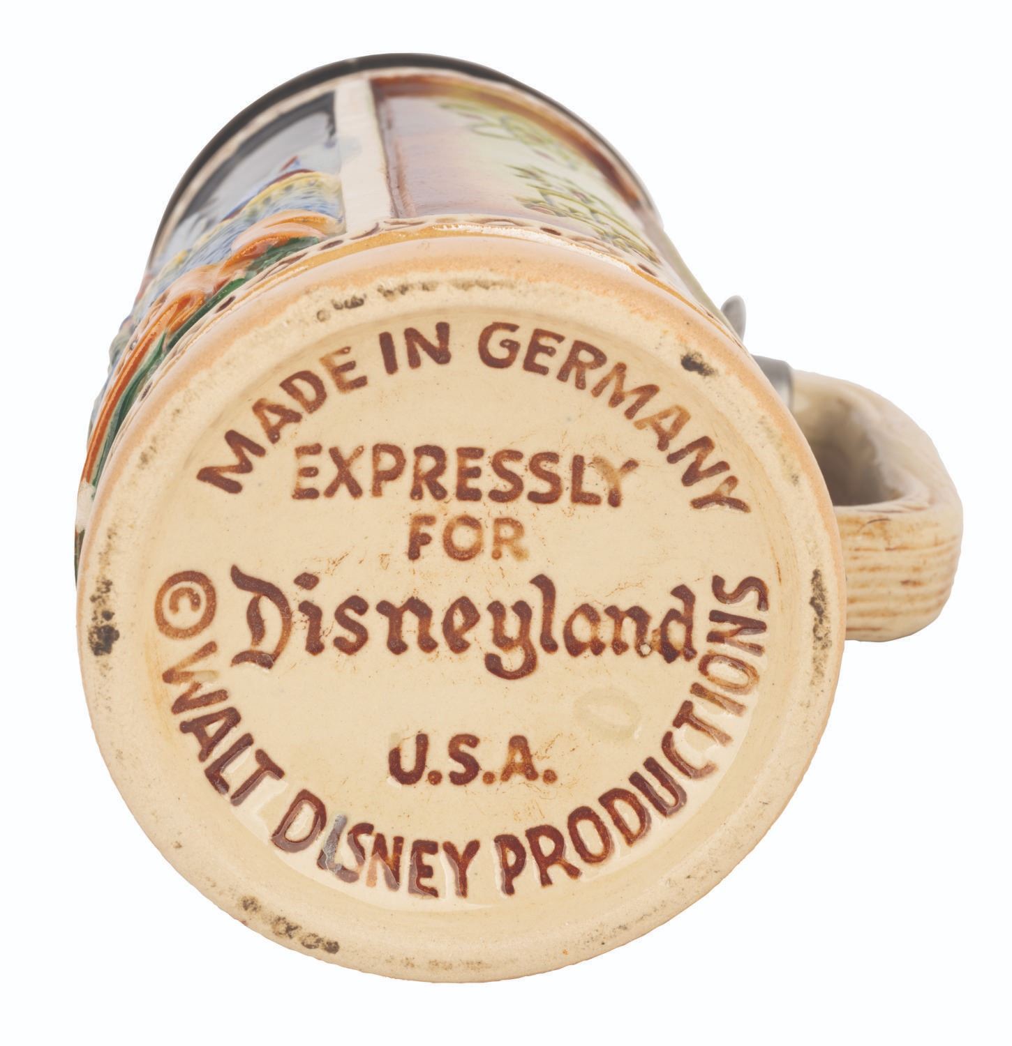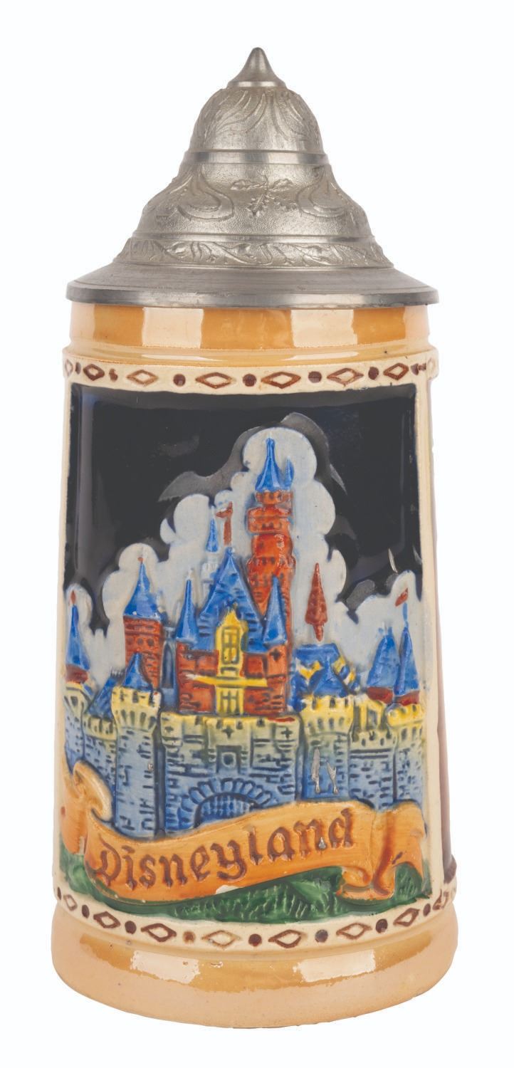 (Disneyland, 1956) A rare decorative souvenir ceramic stein featuring imagery of Sleeping Beauty Castle and symbols of Disneyland’s cardinal lands. This version of the Disneyland souvenir is “colorfully painted” and had a higher price point than the “two-color” edition offered for sale through the “Gifts From Disneyland” catalog. This piece was manufactured in Germany and comes complete with its original hinged pewter lid. Measuring 4.25” at its widest, 7.5" tall, this piece is in very good condition with a few small chips to the base and relief.