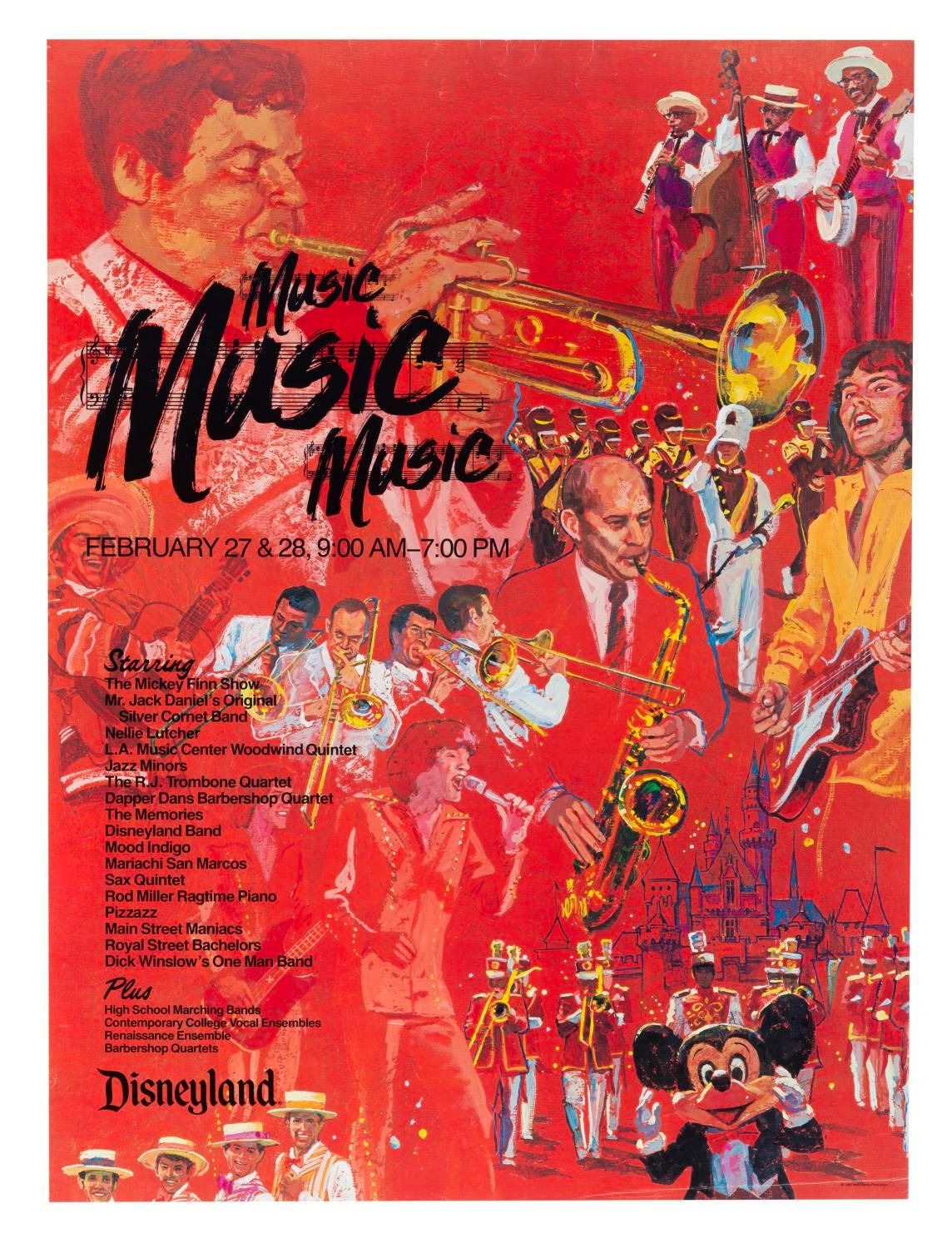 (Disneyland, 1982 ) A poster for the Music Music Music event at the Park, featuring the Dapper Dans, the Disneyland Band, the Mickey Finn Show, and more. Measuring 17.5" x 23.5", the poster is in very good condition with light wear throughout including slight creasing.