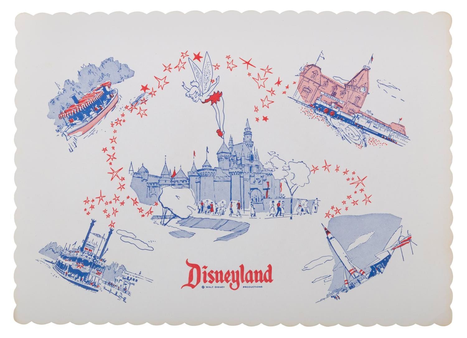 (Disneyland, 1960s) A rare Disneyland restaurant placemat. Paper placemats were rarely preserved in such good condition, and this rare piece is additionally devoid of corporate Participant Sponsor branding, instead highlighting the different lands of Disneyland. Measuring 14"x10.25", this rare piece of Disneyland ephemera is in very good condition with very slight wear to its scalloped edges.