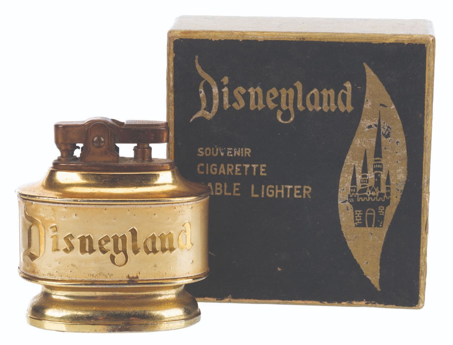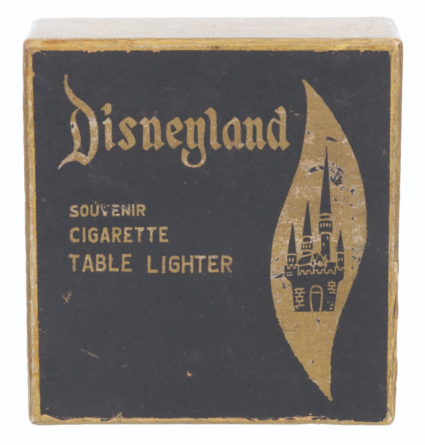 (Disneyland, 1950s-60s) A very rare souvenir Disneyland table lighter with the original box. The lighter features a relief image of Sleeping Beauty Castle on one side, and the Disneyland name on the other. Measuring 2.5" x 1.25" x 2.5" high, the lighter is in very good condition with spots of wear, tarnish, and soiling from age, requiring fluid and possibly service to function. The 3.5" x 3.25" x 1.25" box is in good condition with wear overall.