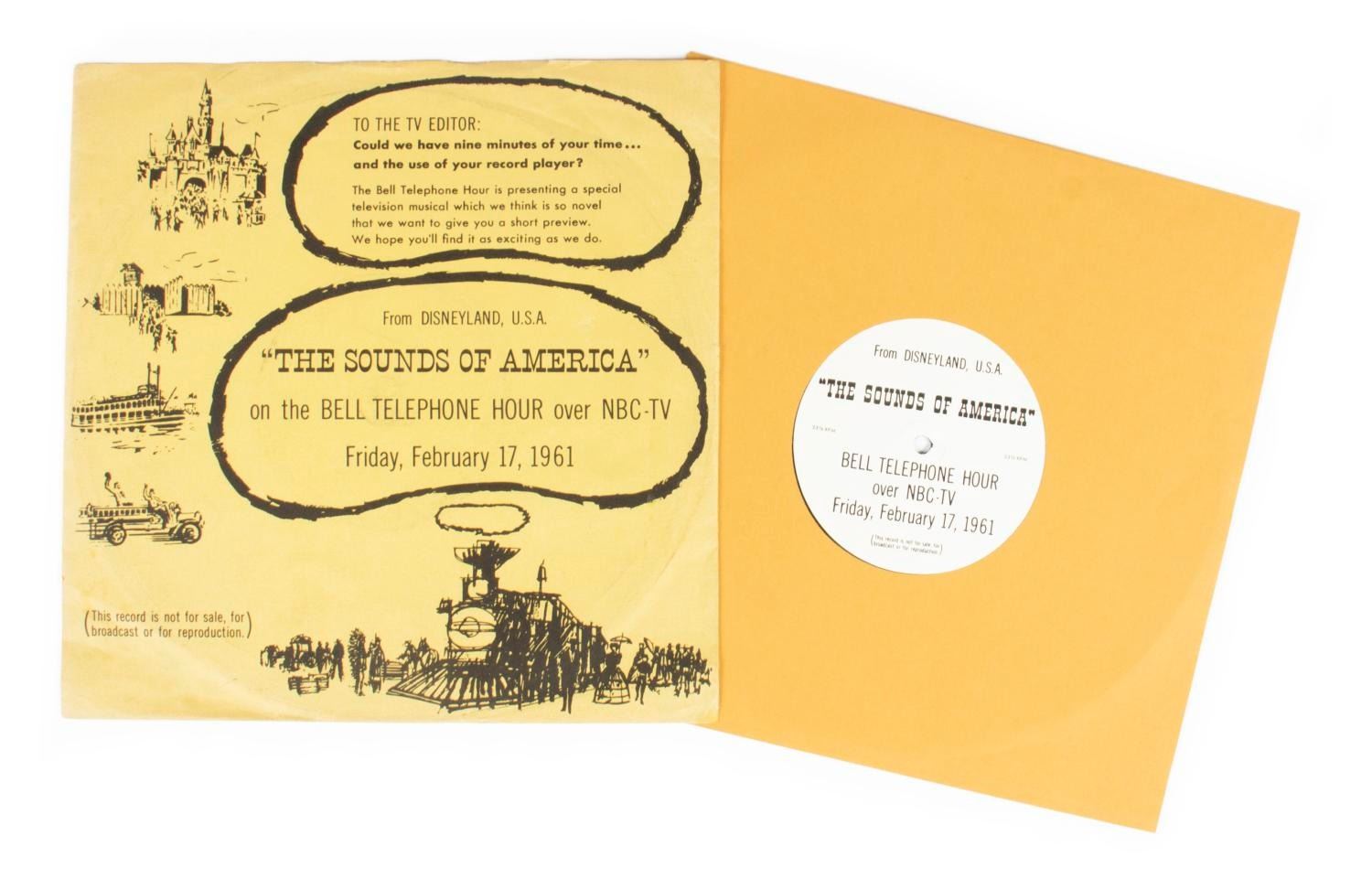 (Disneyland, 1961) An incredibly rare preview record for "The Sounds of America," a Bell Telephone Hour special that aired on NBC, live from Disneyland on February 17th, 1961. The LP record holds a promotional preview of the hour-long television special that would "capture the sounds that mean America," through music and song, in the most exciting setting ever built - Disneyland. Measuring 10.25” x 10.25”, the album is in very good condition with creases, ink smudges, and wear, while the 10” in diameter record is in very good condition with light scratches.