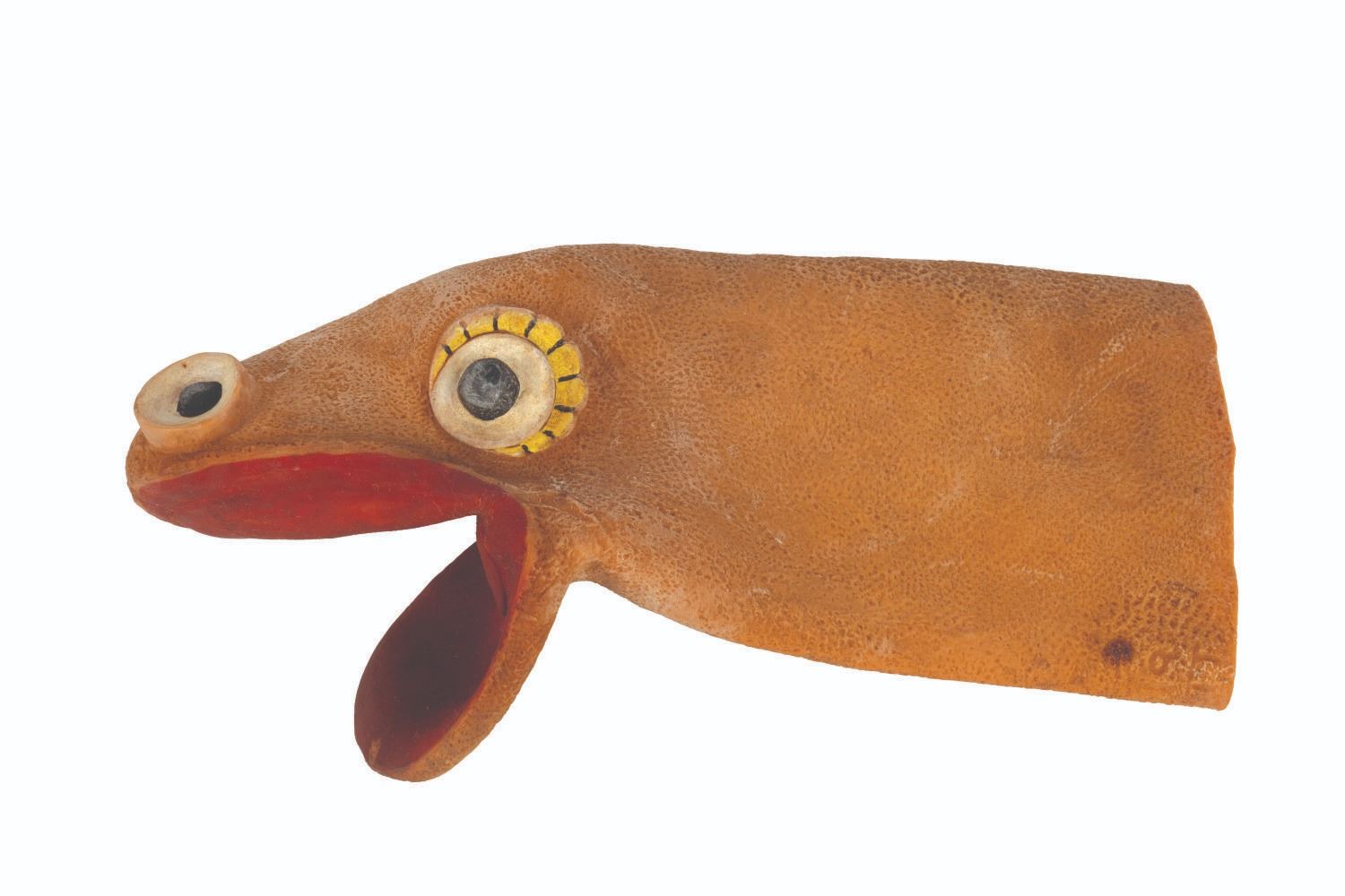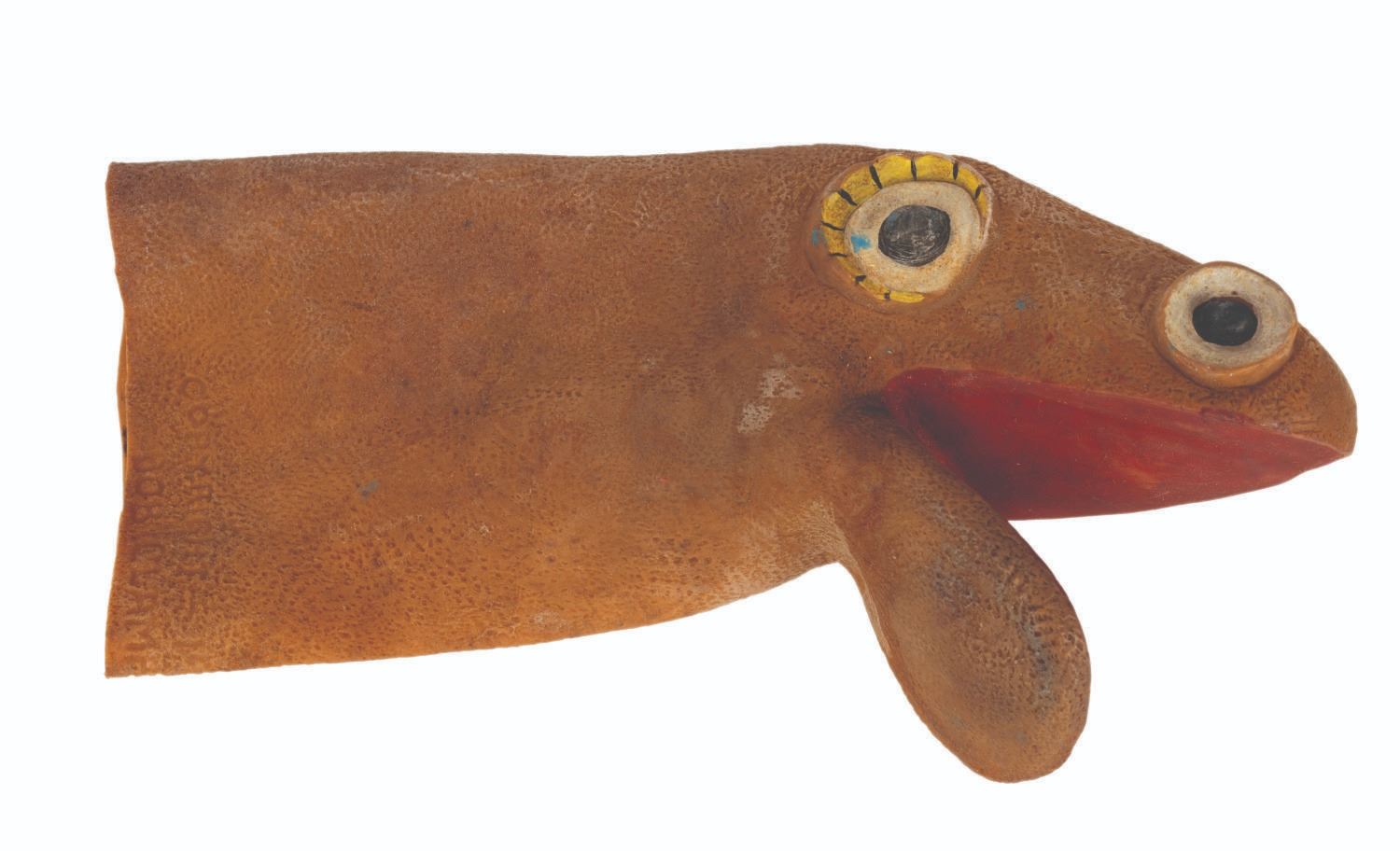 (Chemi-Plastic, 1949) A rare early Cecil hand puppet by Chemi-Plastic with “Copyright 1949 Bob Clampett” near the hand opening. Measuring 9” long and 3” in diameter, the vinyl hand puppet displays in good condition with light stains, wear, and discoloration from age, possibly painted brown by a previous owner.