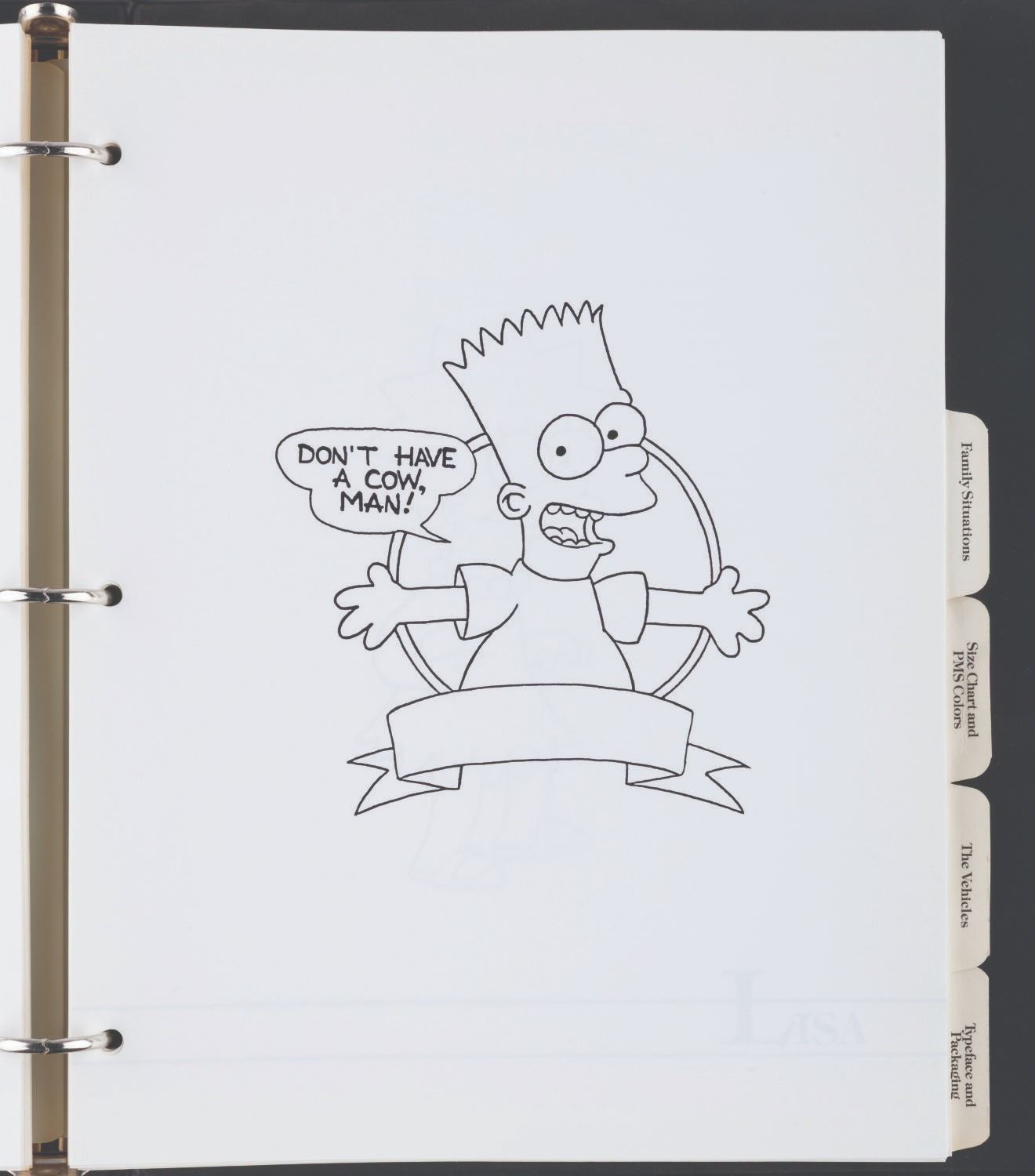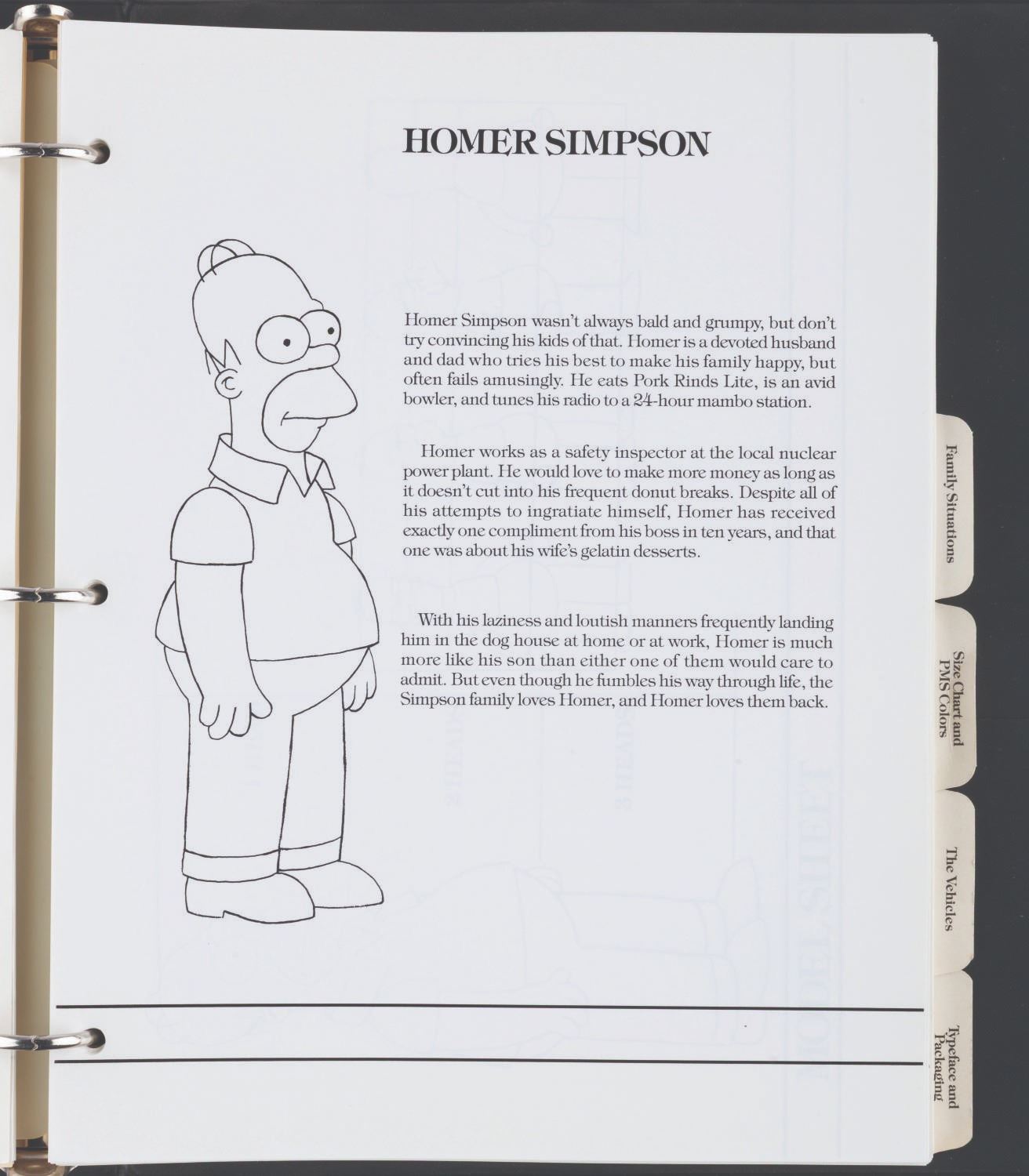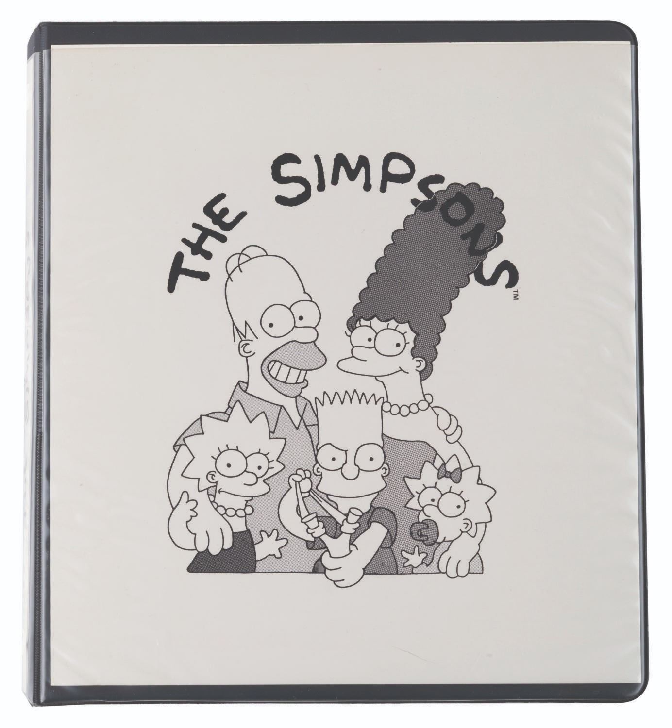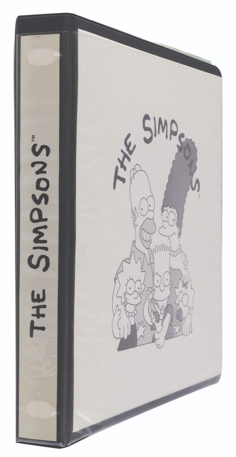 (20th Century Fox, 1989) An original style guide for"The Simpsons." Already a favorite interstitial animated segment in"The Tracy Ullman Show,""The Simpsons" debuted in their own half-hour-long animated series on December 17, 1989, with the holiday episode"Simpsons Roasting on an Open Fire." The series became the longest-running animated series and sitcom in history, with over 800 episodes to date and more to come. This style guide is a window into the unique moment when The Simpsons were not yet the huge part of American culture they became. The only characters included are Homer, Marge, Bart, Lisa, and Maggie; with no mention of Apu, Ned Flanders, Mr. Burns, or any of the hundreds of supporting characters who would become important parts of Springfield and The Simpsons. The three-ring binder includes character art, quotes, fonts, and packaging guidelines for merchandise. Measuring 11.75" x 10.25" x 1.75", the style guide is in very good condition with very light wear from use and age.