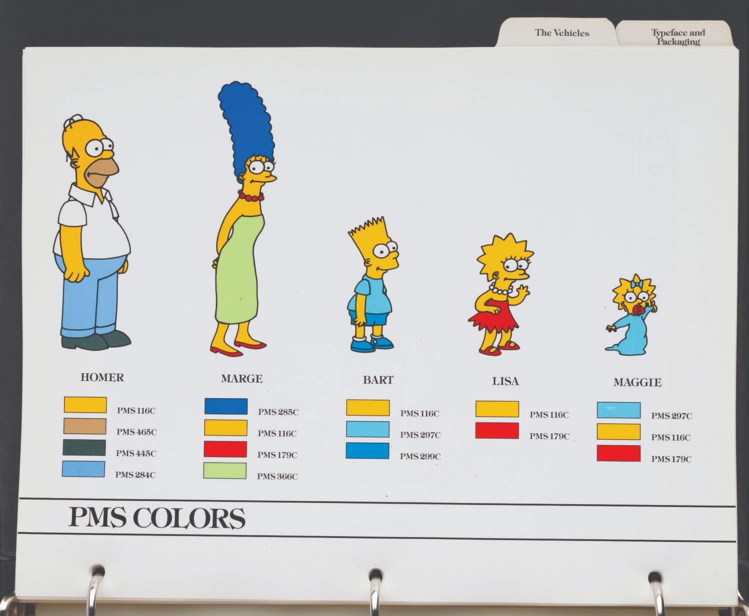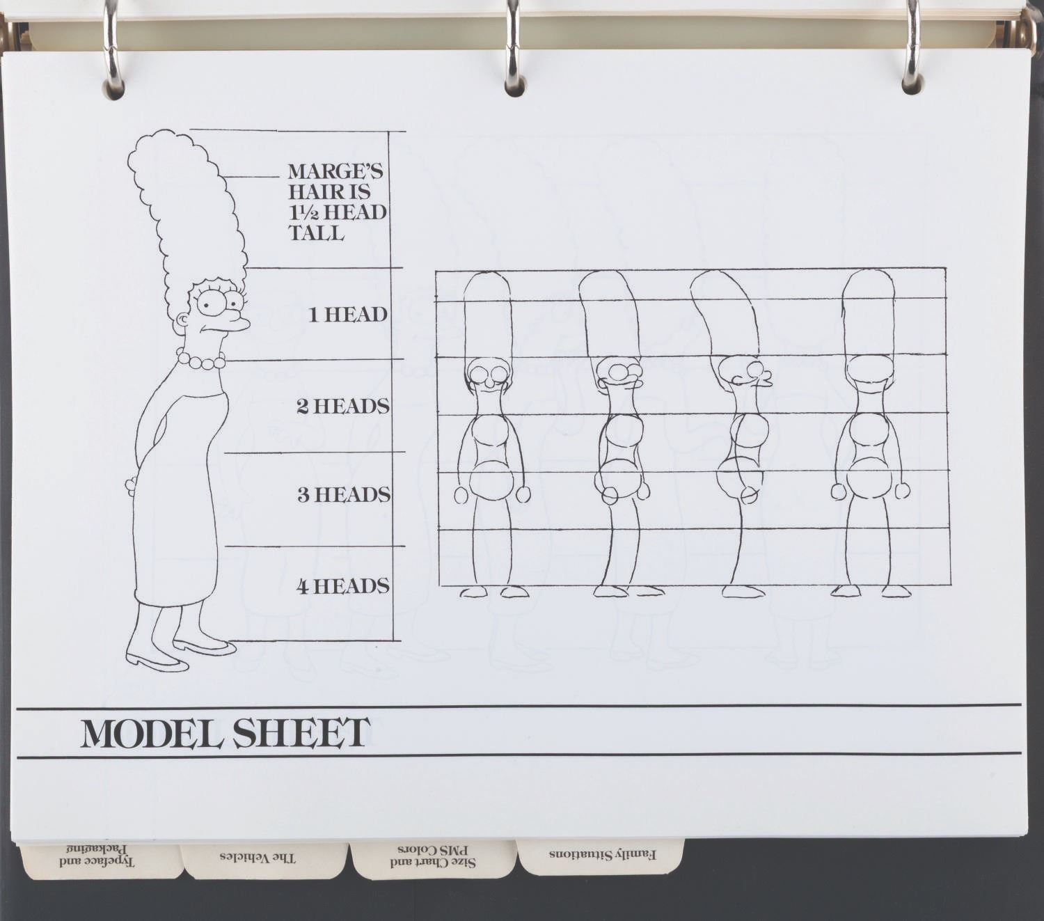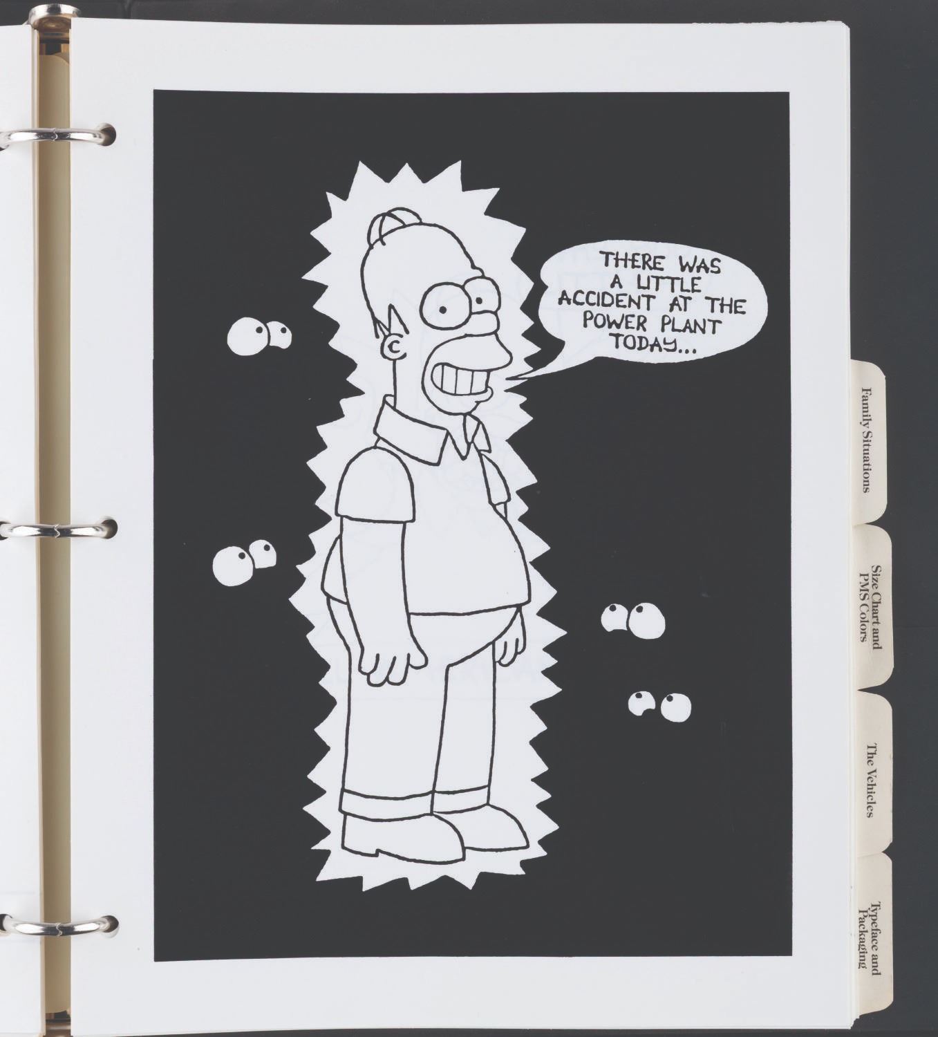 (20th Century Fox, 1989) An original style guide for"The Simpsons." Already a favorite interstitial animated segment in"The Tracy Ullman Show,""The Simpsons" debuted in their own half-hour-long animated series on December 17, 1989, with the holiday episode"Simpsons Roasting on an Open Fire." The series became the longest-running animated series and sitcom in history, with over 800 episodes to date and more to come. This style guide is a window into the unique moment when The Simpsons were not yet the huge part of American culture they became. The only characters included are Homer, Marge, Bart, Lisa, and Maggie; with no mention of Apu, Ned Flanders, Mr. Burns, or any of the hundreds of supporting characters who would become important parts of Springfield and The Simpsons. The three-ring binder includes character art, quotes, fonts, and packaging guidelines for merchandise. Measuring 11.75" x 10.25" x 1.75", the style guide is in very good condition with very light wear from use and age.