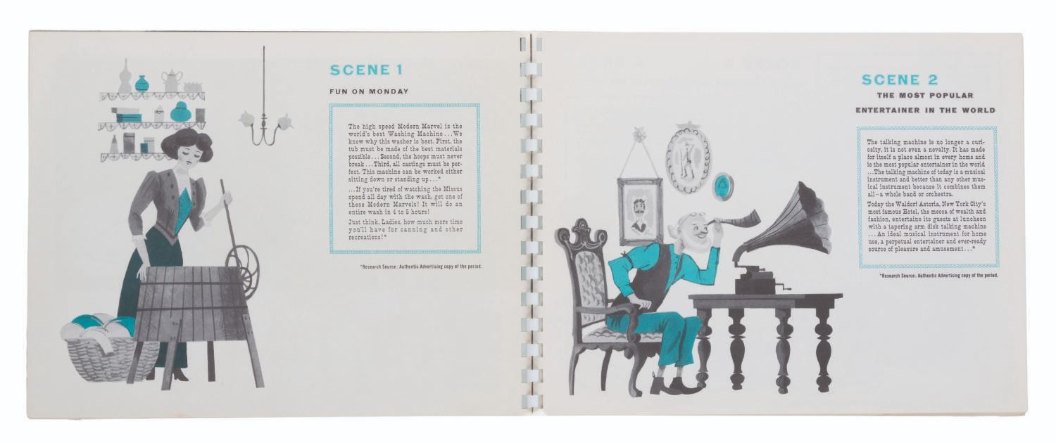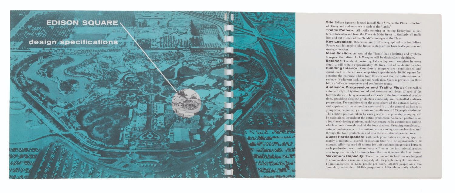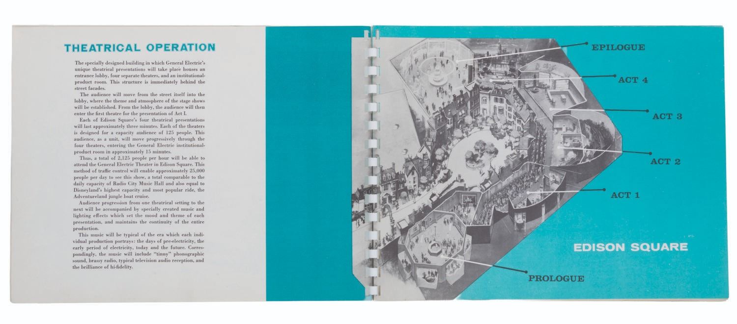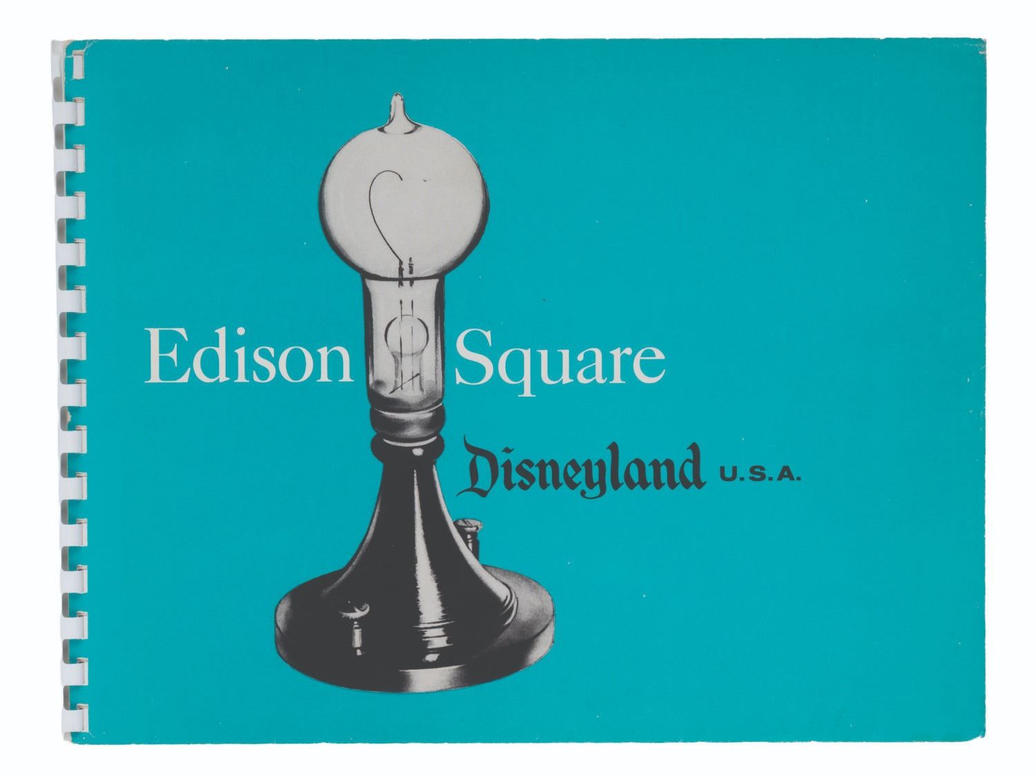 (Disneyland/General Electric, 1958) An extremely rare pitch brochure for Edison Square. The earliest souvenir maps of Disneyland showed an"Edison Square" off the east side of Main Street, with labels teasing progress-related theming inside. This detailed brochure details the plan for a turn-of-the-century New York street adjacent to Main Street, showcasing innovations in technology such as the shift from gas lamps to electric bulbs and from horse-drawn carriages to gasoline-powered automobiles. The brochure highlights a"The Wizards of Progress" show, the story of technological advancements from the past to the future, presented through lifelike dioramas and"electro-mechanical personalities" - what we now know as audio-animatronic figures. Although Edison Square was never constructed, this show developed into the Carousel of Progress for the GE Pavilion at the 1964-65 New York World's Fair, and continues to run today at Walt Disney World. This brochure is the only example we have seen, offering a unique glimpse into the concept of one of Disneyland's unrealized attractions. Measuring 8.5" x 11.25" the 18-page, comb-bound brochure is in very good condition with light discoloration, minimal edge wear, and one of the comb rings broken off.