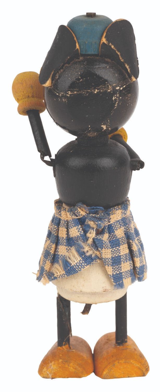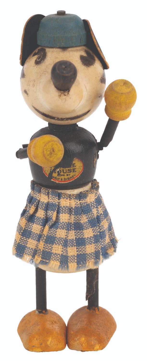 (George Borgfeldt, 1930s) A rare wooden Fun-E-Flex Minnie Mouse figure with cardboard ears and a textile skirt. Measuring 3.75" tall, the hand-painted figure is in good condition, with scuffs, creases to the ears, wear, and missing the tail.