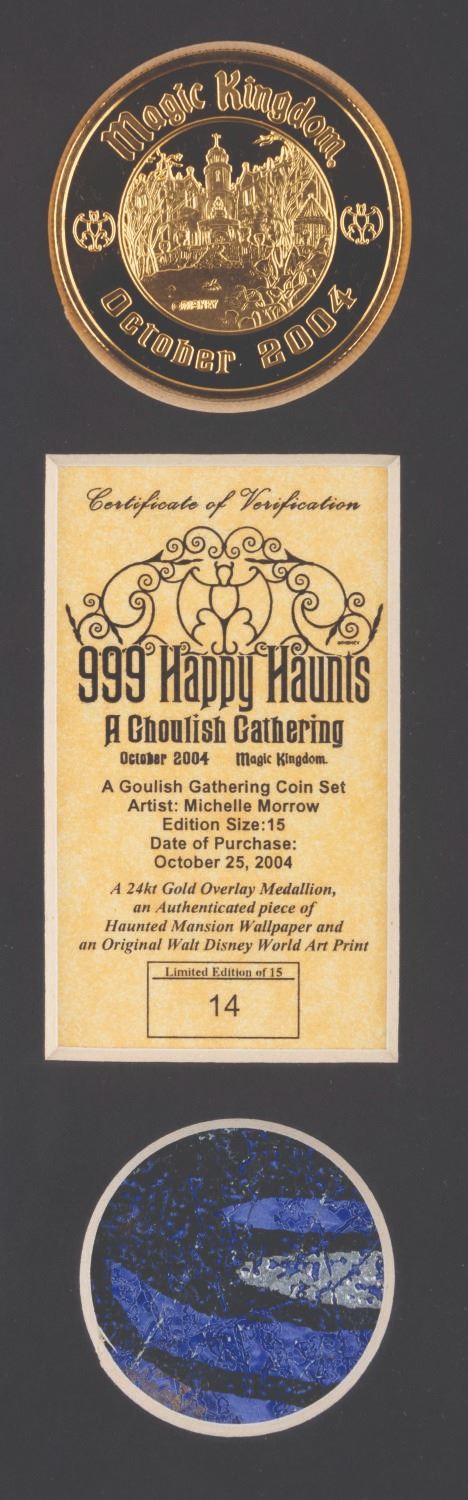 (Walt Disney World, 2004) A Ghoulish Gathering Gold Coin Set released for the "999 Happy Haunts - A Ghoulish Gathering" at The Magic Kingdom. The framed piece is numbered 14 of an edition of only 15 and contains a 24K Gold Overlay Medallion, an original Walt Disney World art print by Michelle Morrow, and an authenticated piece of Haunted Mansion wallpaper. Measuring 10" x 12", the entire piece displays in fine condition.