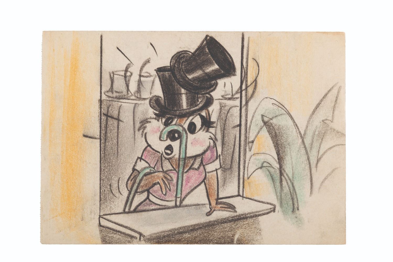 (Disney, 1952) An original storyboard panel for an unused gag, most likely from "Two Chips and a Miss. " The panel shows a hat check girl stunned after Chip and Dale drop off their hats and canes while rushing to meet Clarisse. In the final cartoon, essentially no other characters appear besides Chip, Dale, and Clarice. Accomplished in graphite and colored pencil, the artwork measuring 6 " x 8 " is in very good condition with typical light wear from production handling.