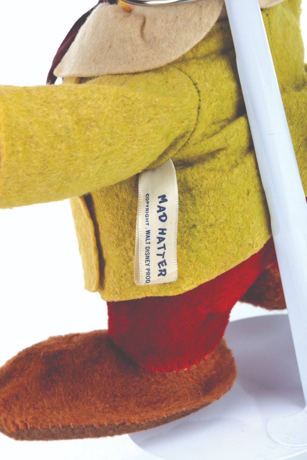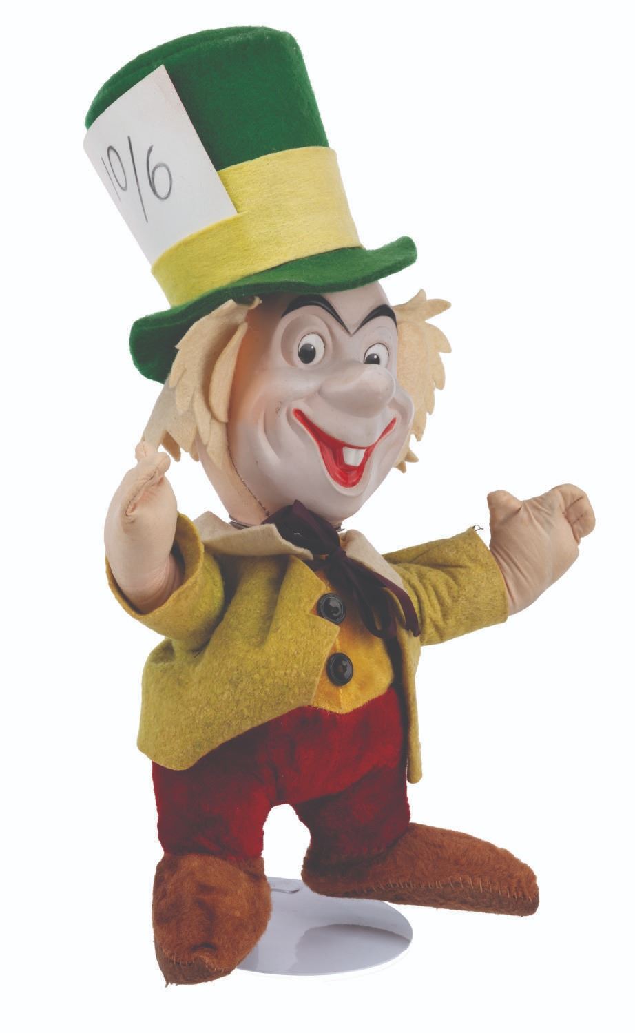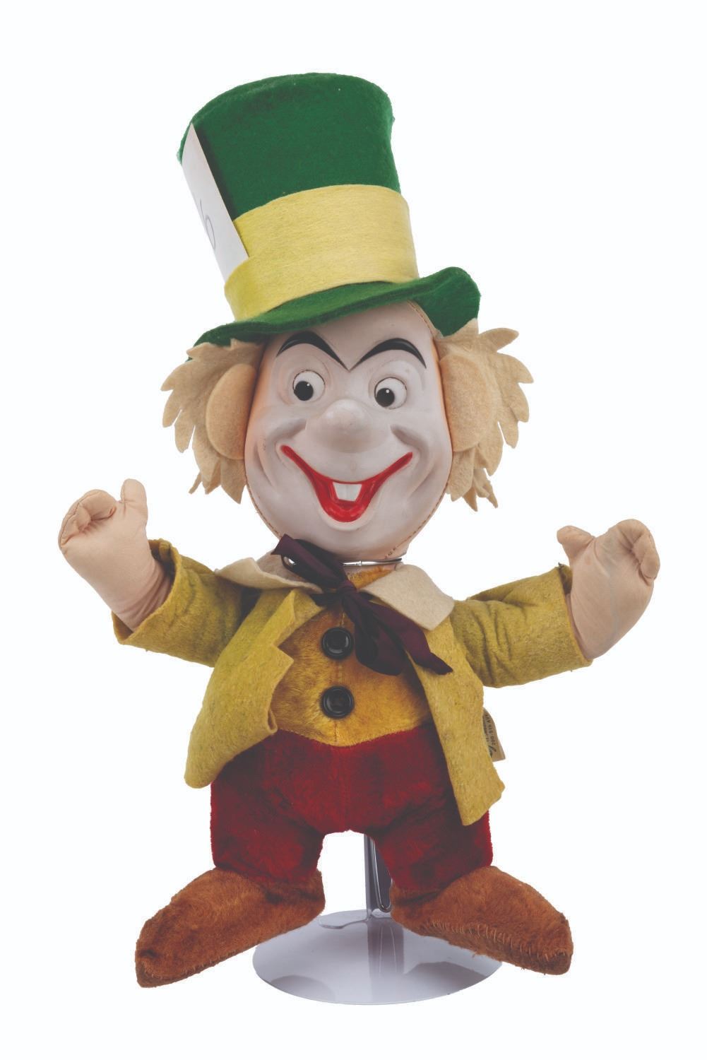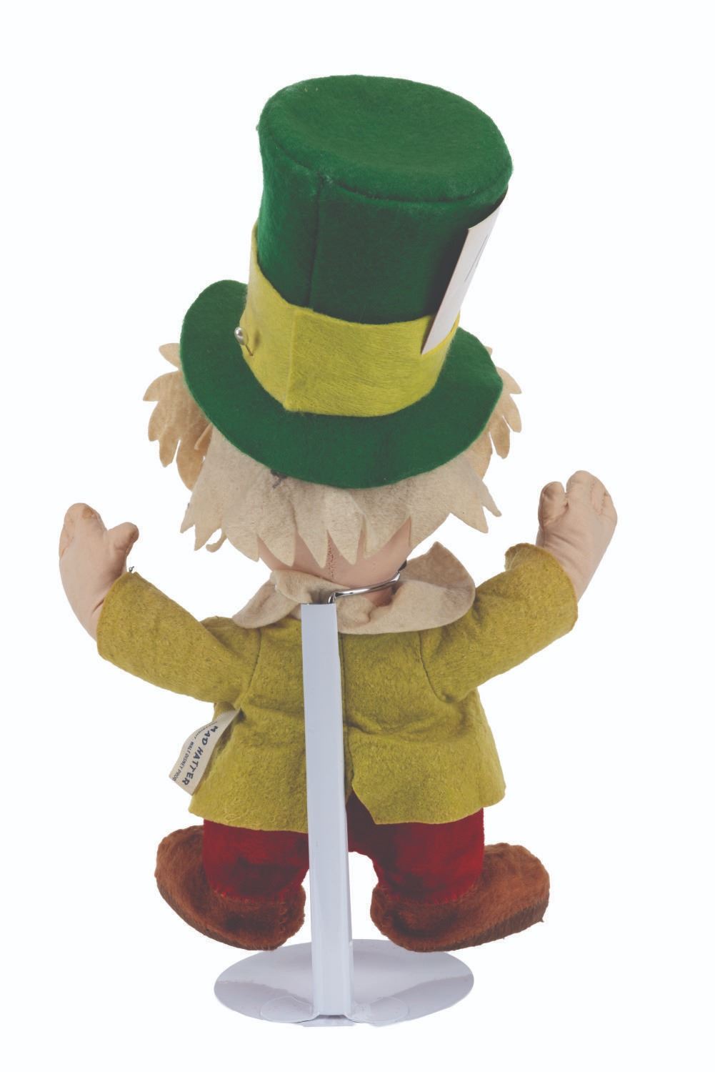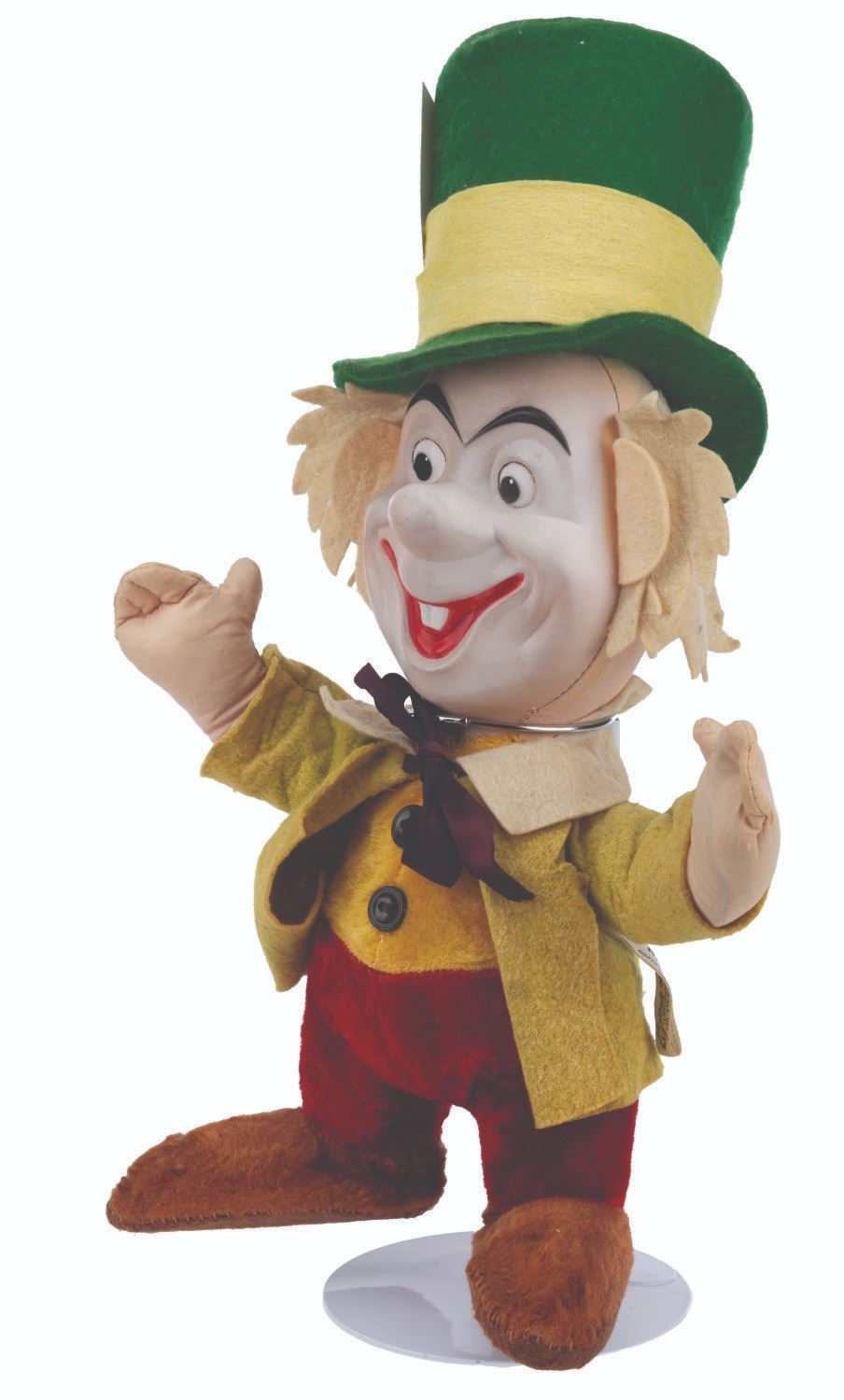 (Gund, 1951) A rare plush doll of the Mad Hatter from "Alice in Wonderland," manufactured by Gund. The doll has an internal wire armature and features a molded plastic face, felt hair, and a felt coat with a fabric neck tie. The original hat is missing, and a reproduction hat with a card in the size slip slot is included, held in place by a pin. Measuring 10" x 5.5" x 15" tall, 15.5" tall including its base, the doll displays in very good condition with light scratches, stains, fraying, wear, and discoloration from age.