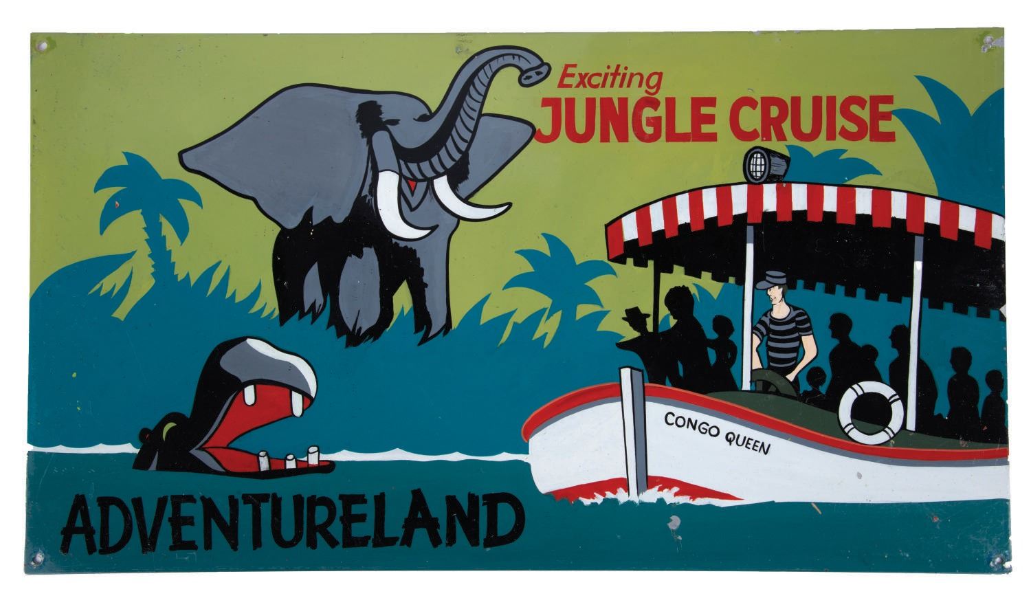 (Disneyland, 1950s) An extremely rare and very early Jungle Cruise sign created for the Omnibus at Disneyland. The Omnibus debuted in 1956 with a second added in 1957, and this sign was crafted by Disneyland Staff Shop craftsmen and artists for mounting on the sides of the vehicles. The colorful hand-painted imagery depicts the Congo Queen naphtha launch boat encountering a hippopotamus and African elephant along the Rivers of the World in Adventureland and was inspired by the attraction poster by Bjorn Aronson. The rear of the sign has annotation reading "2-R." During the 1970s, the Omnibus signs were produced using lithography, making this hand-crafted sign a unique and extremely rare piece of Disneyland history. Measuring 24.5"x13.5", this beautiful metallic sign displays in very good condition with scuffs, scratches, and chips to paint, minor oxidation to rear and wear throughout from Park display, handling, and age. This is one of only two Jungle Cruise Omnibus signs we have ever seen offered.