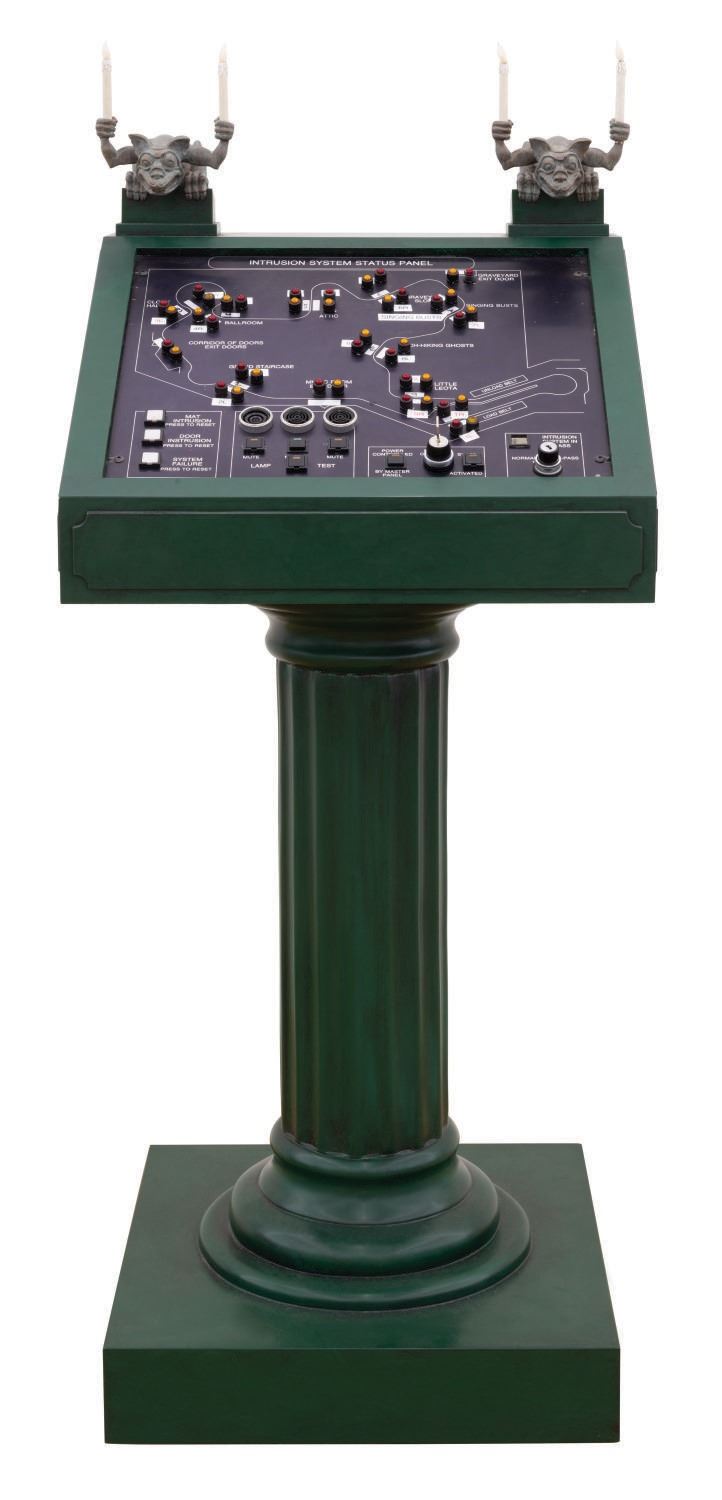 (Walt Disney World, 1990s) An extremely rare Haunted Mansion Intrusion System Status Panel. The panel was used as part of the safety and security system in the attraction and monitored the emergency exit and other doors throughout the ride. The panel has been mounted in a custom display decorated with miniature stretching gallery gargoyles, and plays appropriate snippets of the Mansion's soundtrack when an area's button is pushed. The panel measuring 15.5"x19" is in fine Park-used condition. The custom display measures 22"x20"x55" high and displays in good condition, with the miniature gargoyles showing signs of repair.