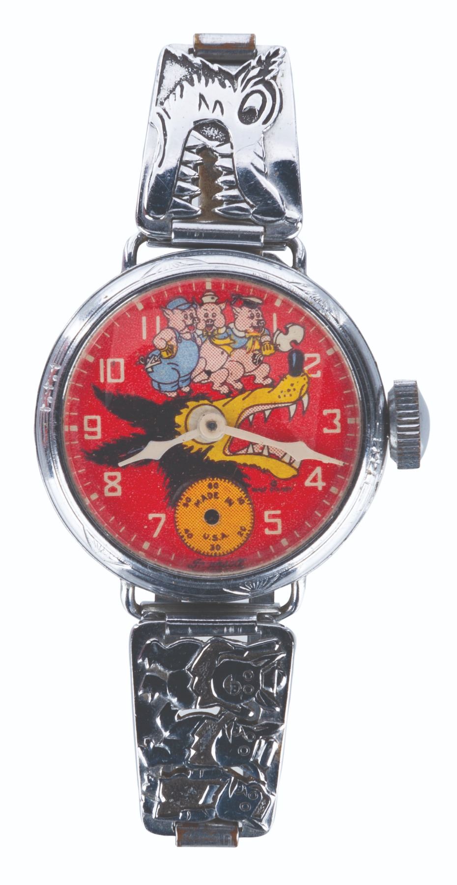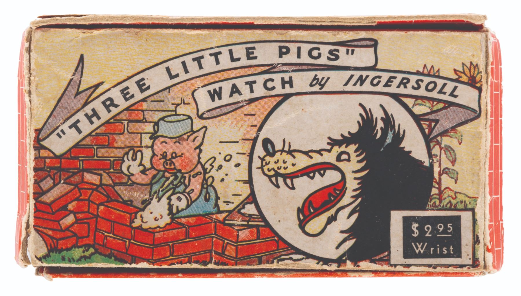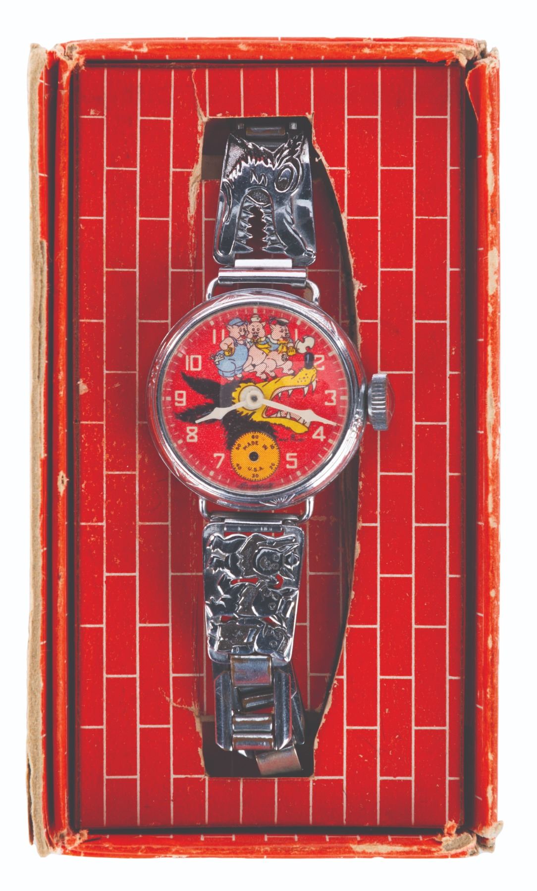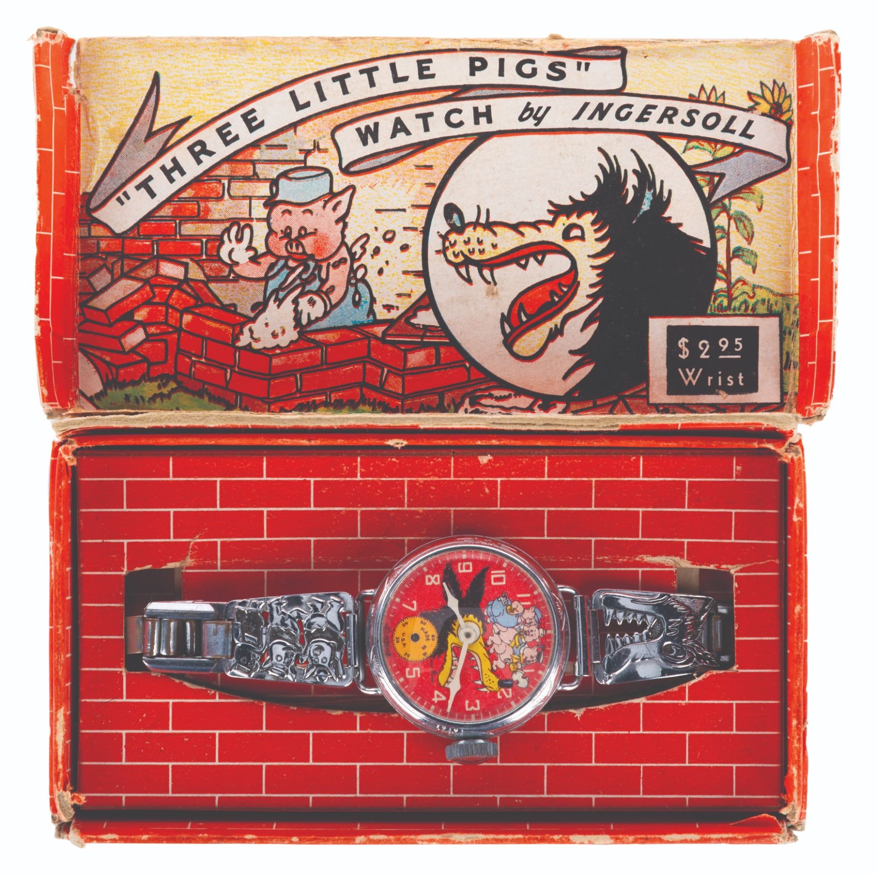 (Ingersoll, 1934) A rare “Three Little Pigs” wristwatch by Ingersoll. The band features the Three Little Pigs on one half and a snarling Big Bad Wolf on the other, all housed in a cheeky brick-patterned box. When tested, the watch did not function and may require repair. Measuring 1.25” in diameter on a 6.5” long chain with its original 2.5” x 4.75” x 1” tall box, the watch displays in very good condition with light oxidation, scratches, and wear, while the box exhibits heavy wear and has a loose cover.