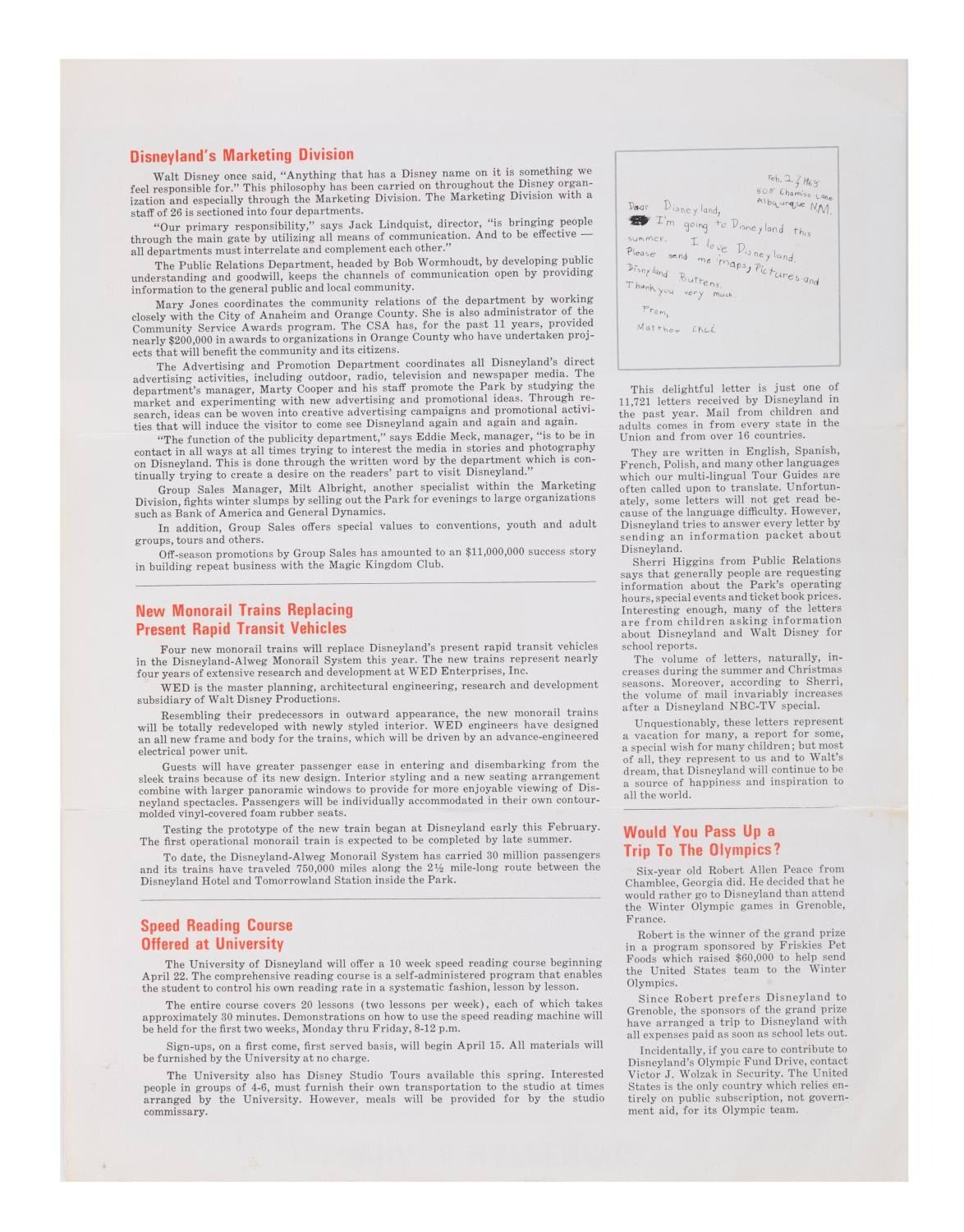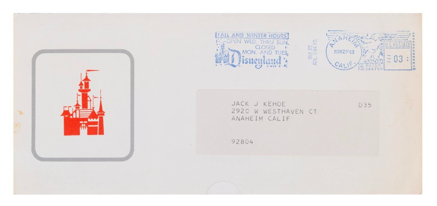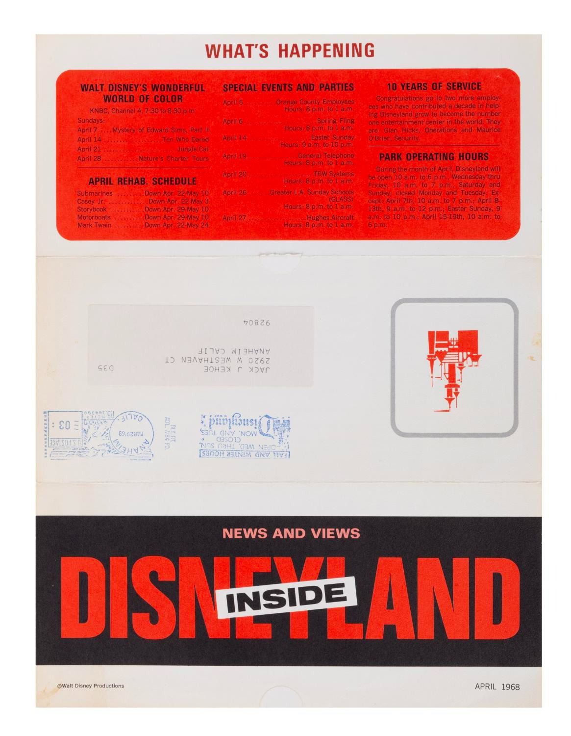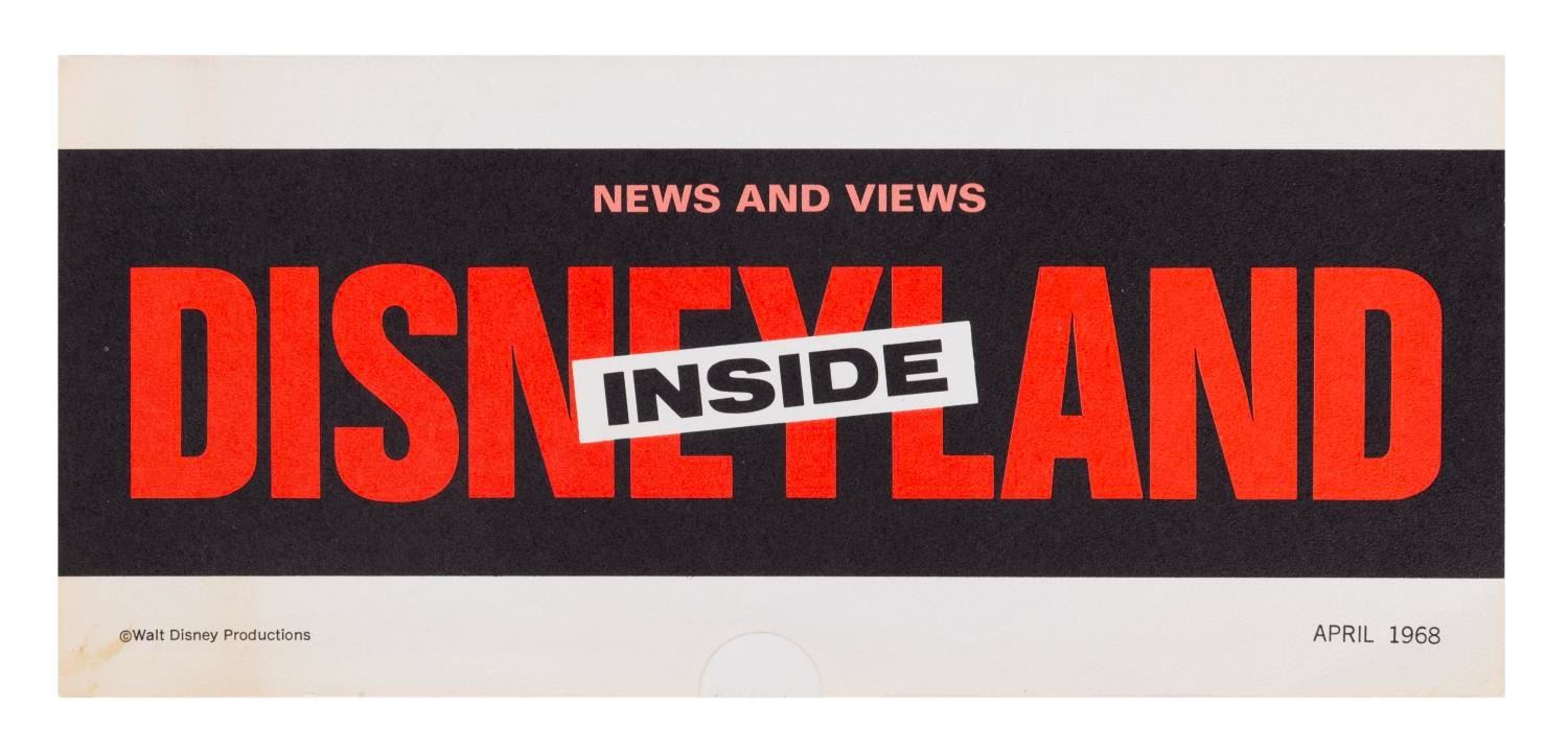 (Disneyland, 1968) An "Inside Disneyland - News and Views" Mailer. This piece of promotional media was prepared by the Disneyland Marketing Division, exclusively for employees of Disneyland, and contains brief words about new Monorail vehicles, Disneyland University Courses, and recent developments at Disneyland. Measuring 9"x12", this rare piece of Disneyland ephemera is in very good condition with minor wear to its original folds, edges, and corners from original shipping and handling.