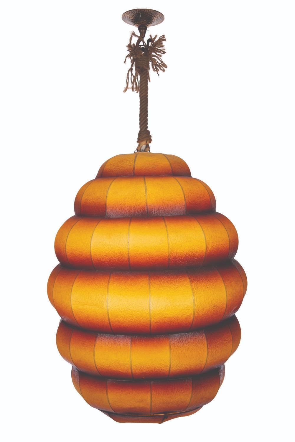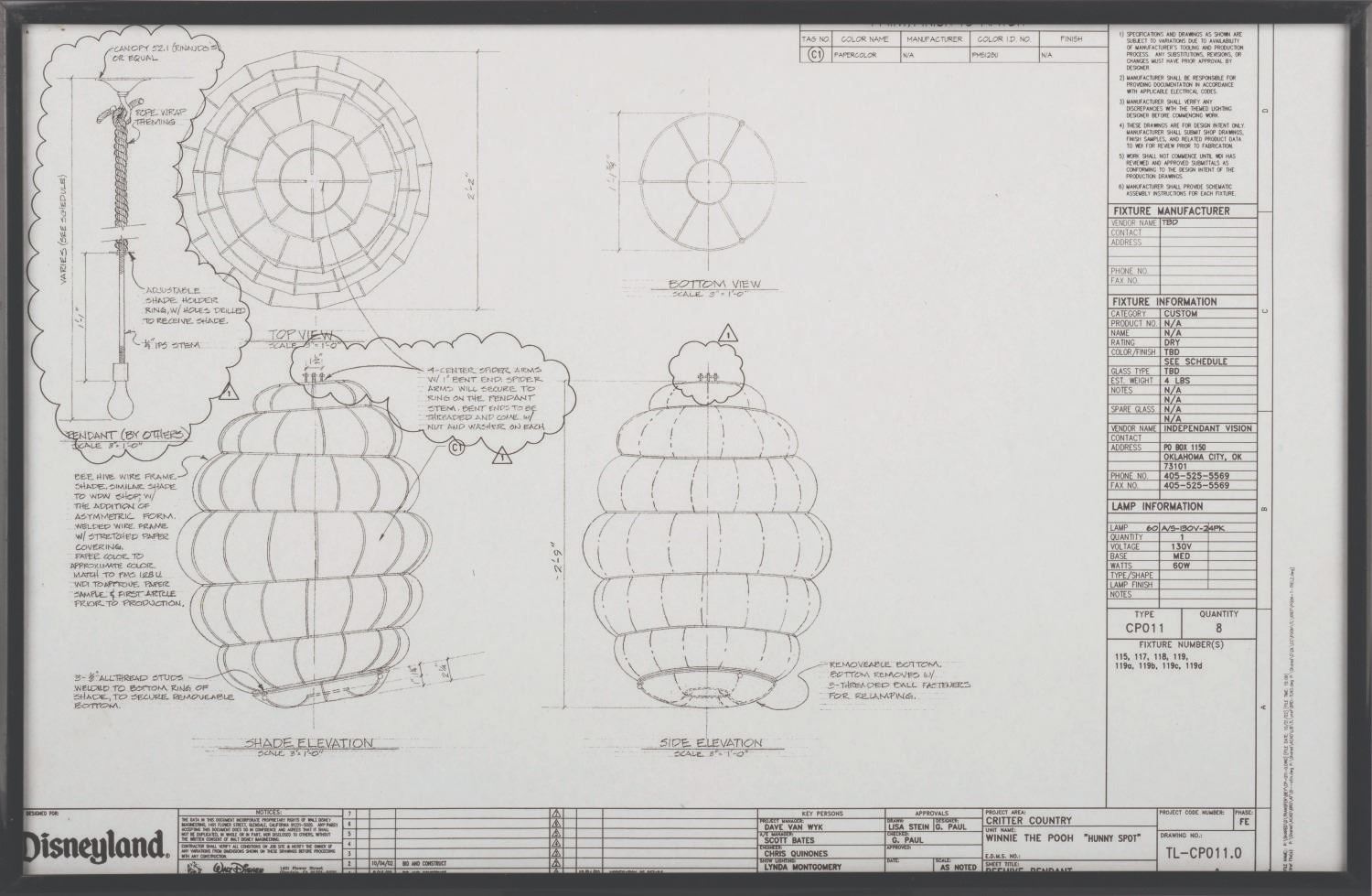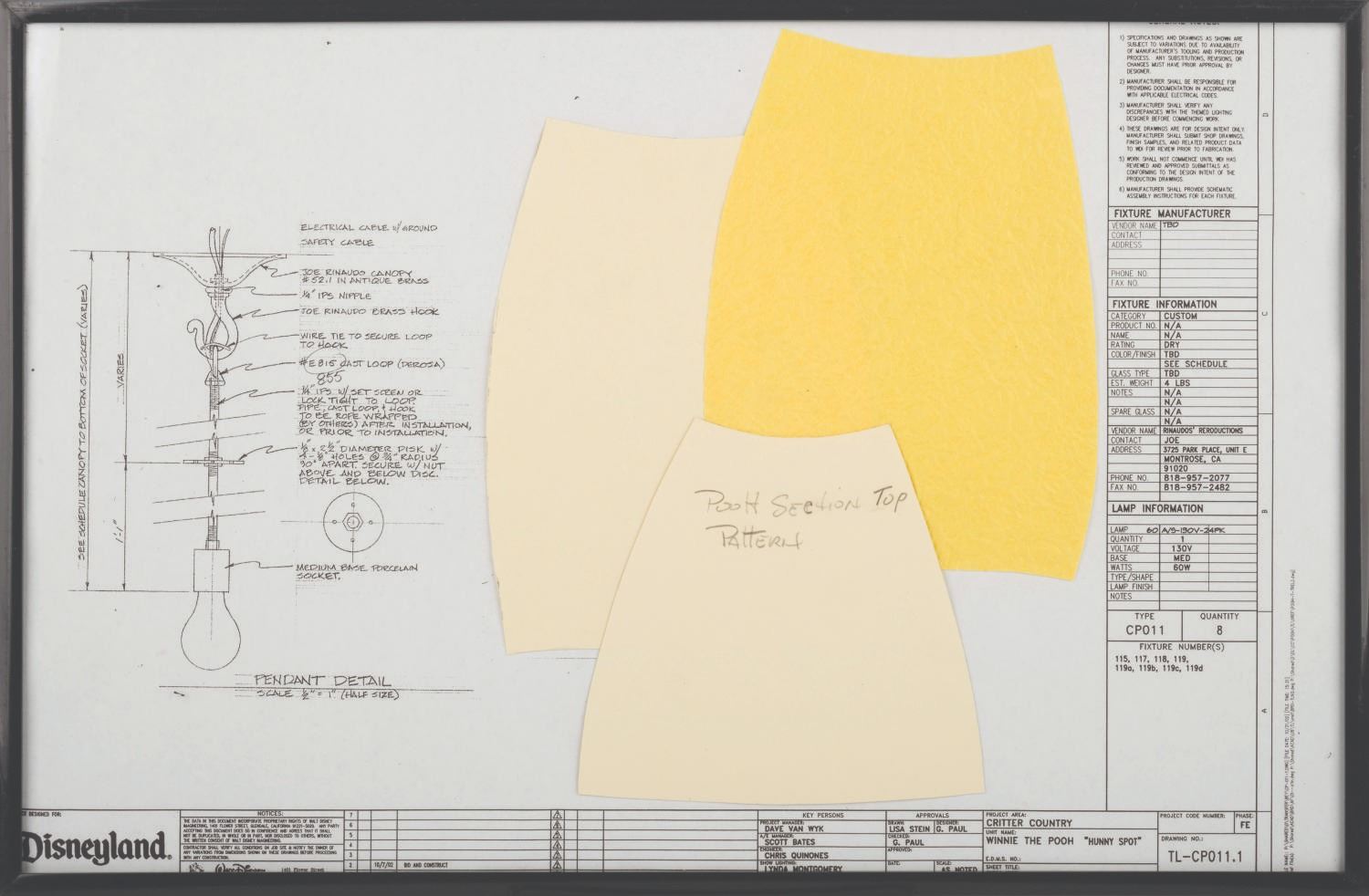 (Disneyland, 2000s) A large decorative beehive lamp from the Pooh Corner Shop in Critter Country. Pooh Corner located next to The Many Adventures of Winnie the Pooh furthered the Hundred Acre theme with illuminating beehive lamps. This early version of the lamp is made of paper, while later ones were constructed of more durable materials. This lamp may be the only one of the original paper lamps that has survived. The lamp runs on a 15A/125V power source. Measuring 26" wide and 48" tall, the lamp is in very good Park-used condition overall, with slight wear and minor tear to some paper areas. The lamp comes with copies of the plans as well as paper samples used during design. Because of the size and delicate nature, special shipping arrangements will be needed. Please inquire before bidding.