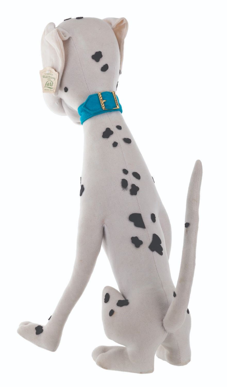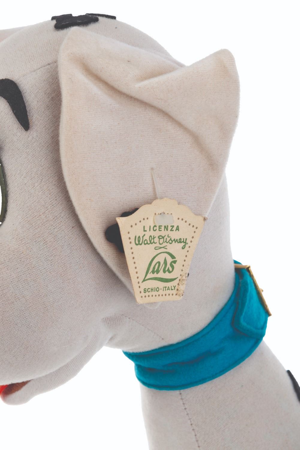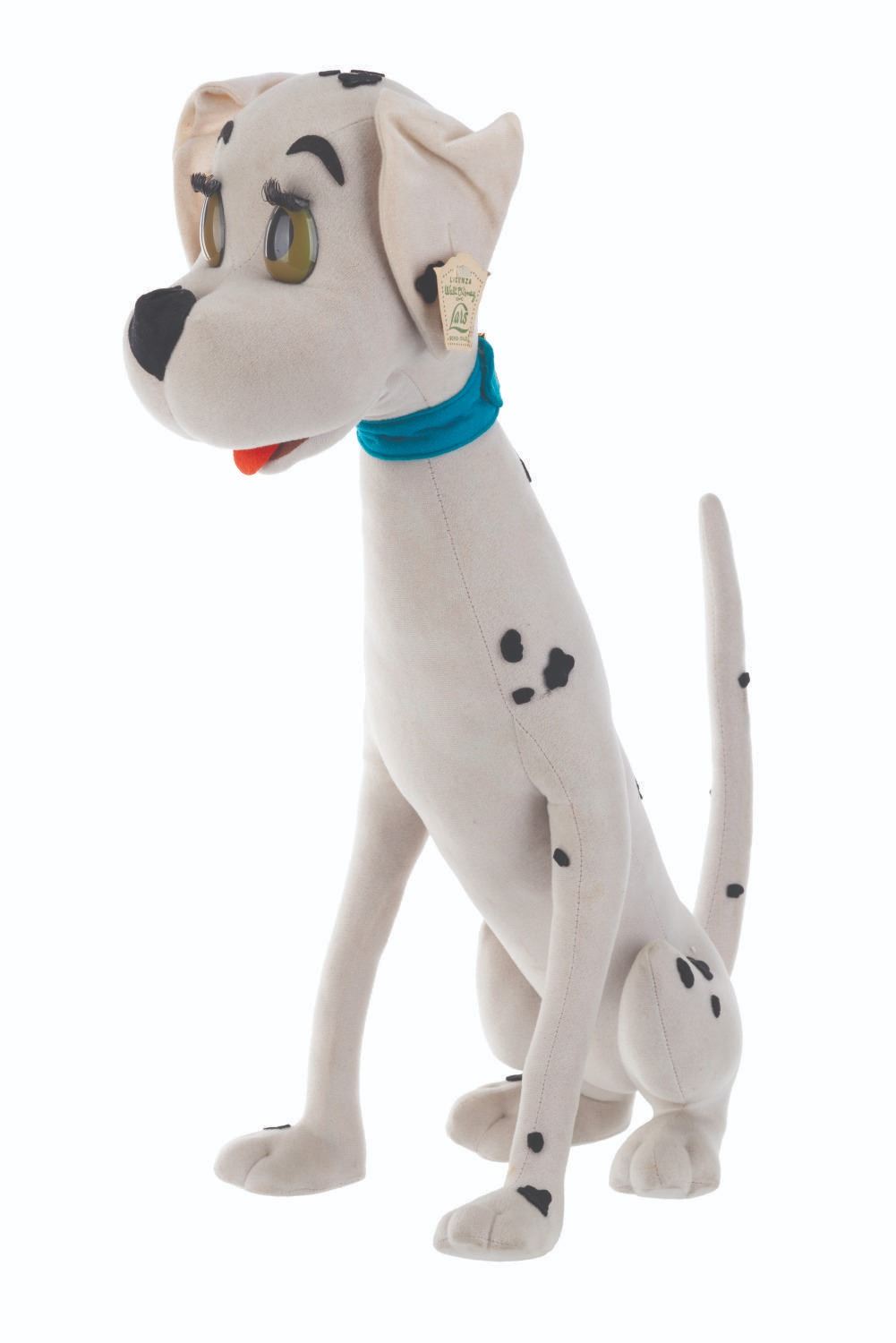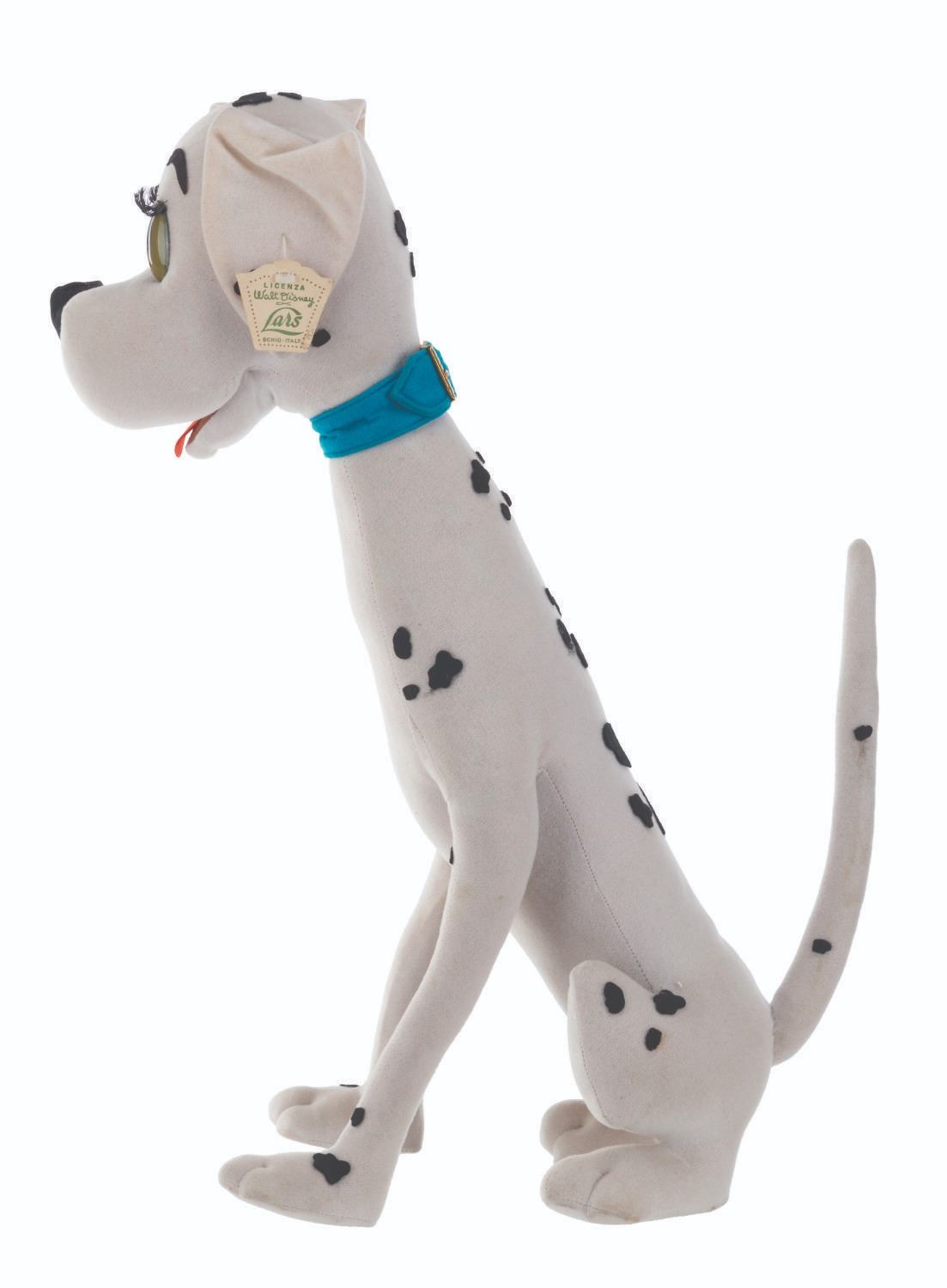 (Lars, 1960s) A very rare Perdita Dalmatian doll inspired by Walt Disney's "One Hundred and One Dalmatians." The doll is attributed to Italian dollmaker Lars, who was licensed to manufacture Disney dolls from the 1950s to the 1970s. These dolls were unavailable in the United States, resulting in their rarity. Measuring 15.5" x 9.5" x 20" tall, the doll displays in very good condition with light stains and its original ear tag intact.