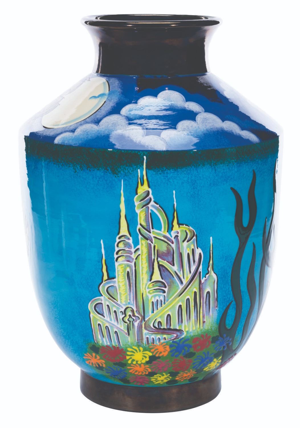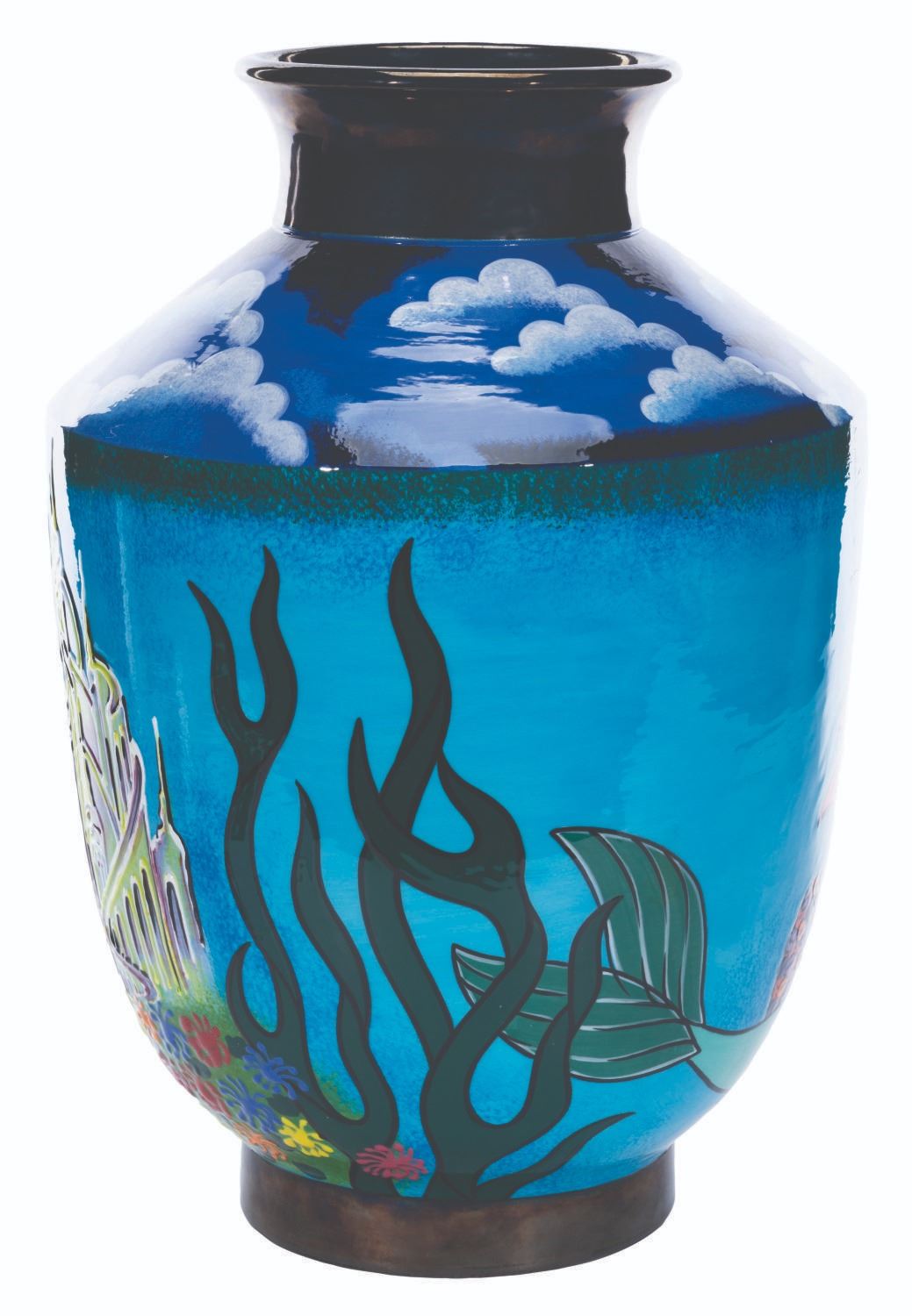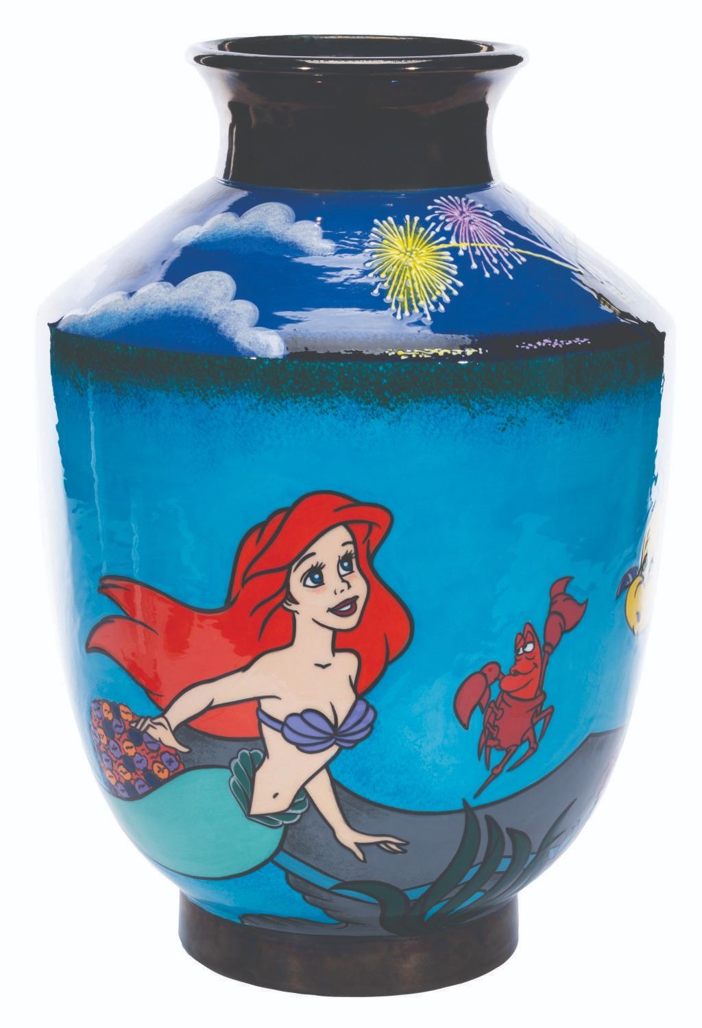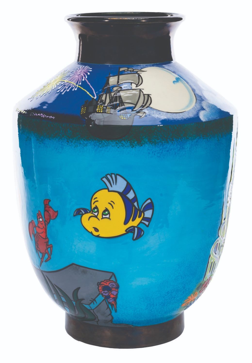 (Disney, 2002) A very rare hand-painted ceramic vase inspired by “The Little Mermaid,” designed by artist Elisabete Gomes and numbered 5 of an edition size of only 25. The vase depicts Ariel, Sebastian, and Flounder under the sea with Prince Eric’s ship above. Standing 16.75" tall, the vase is in fine condition.