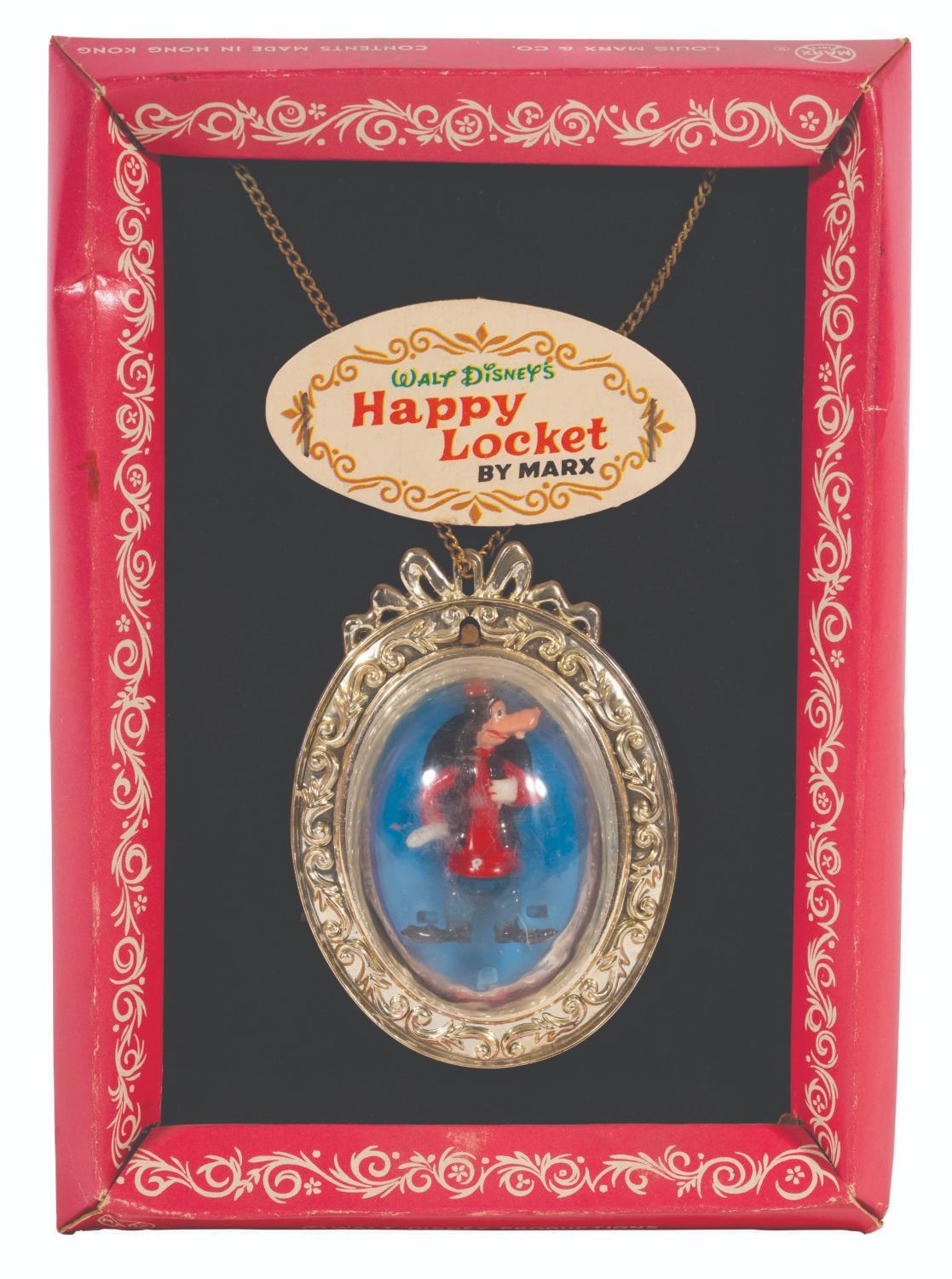 (MARX Toys, 1968) A rare MARX Happy Locket on its original card, featuring a Goofy Disneykin. The back of the card features color images of the four other Happy Lockets available. Measuring 3"x2.25"x1.25" on a 5"x7"x.75" card, the piece is in very good condition, exhibiting creases and minor fading to the card, and expected wear to each from age.