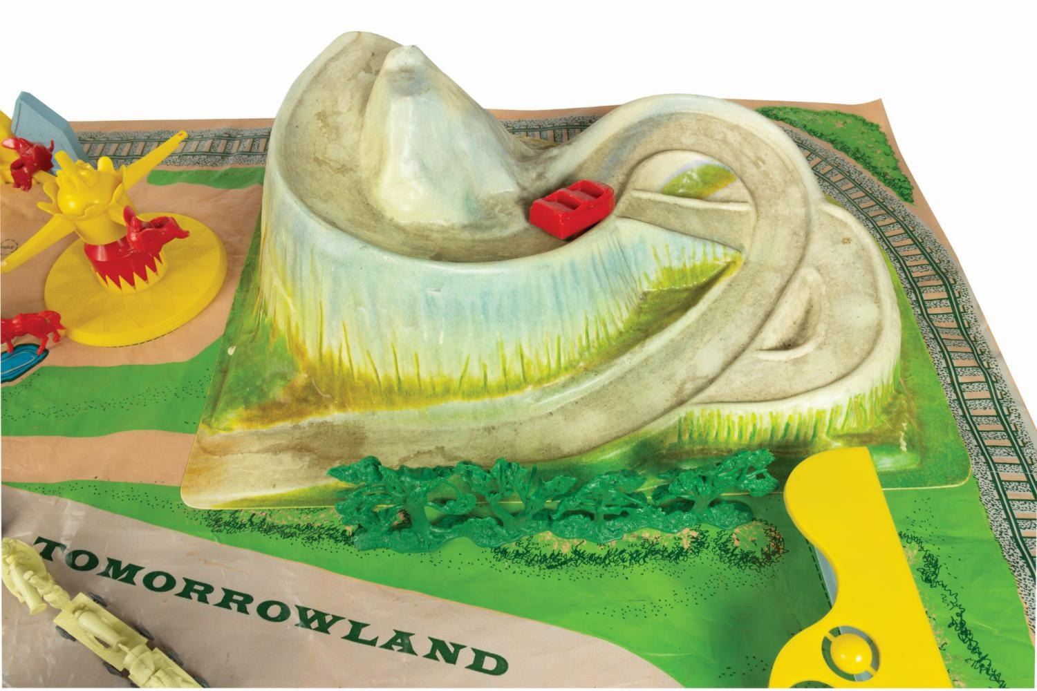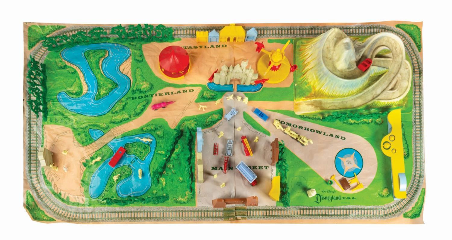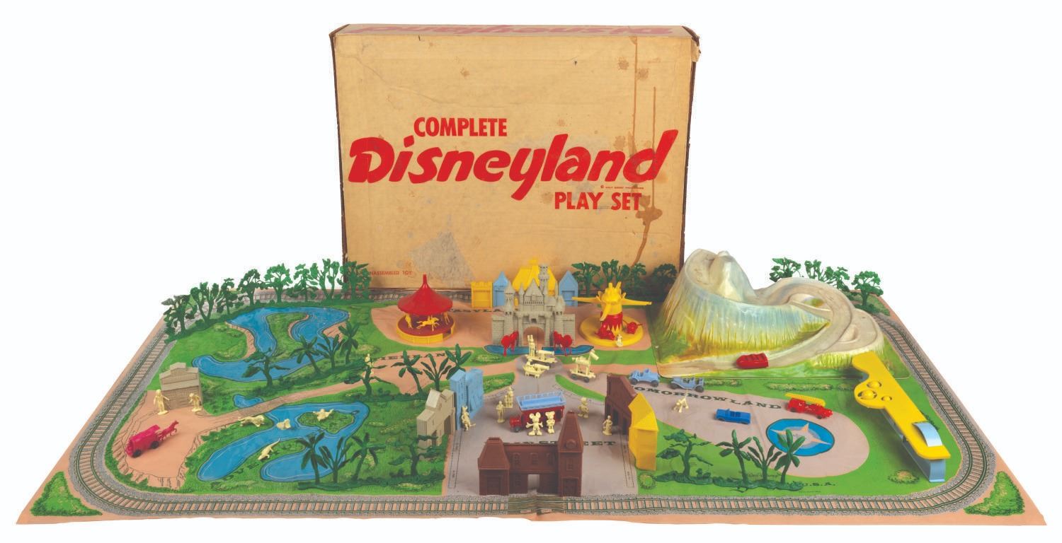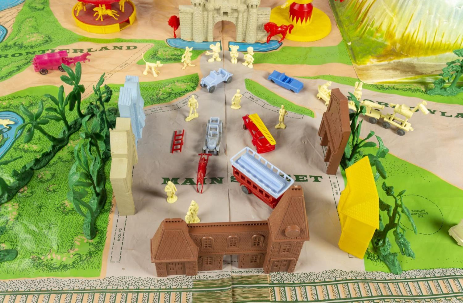 (Marx, 1961) A rare No. 4368 Marx Disneyland playset with its original box. The colorful plastic playset includes recreations of popular attractions the Matterhorn, Dumbo the Flying Elephant, King Arthur Carrousel, Sleeping Beauty Castle, and more. The incomplete set includes 11 building facades, eight trees, eight vehicles, and 22 figurines of Guests, animals, and characters. Ranging in size from a 1.5" tall Minnie Mouse figure to the 12" x 18" x 6.75" tall vacuum-formed Matterhorn on the 30" x 59" two-piece playmat, this set is in fair condition, with missing pieces, a broken off castle spire, the ride vehicles broken off Dumbo with two missing, residue and wear from age and handling, and creasing with light scratches to the playmat. The original 21.5" x 27.5" x 6.75" tall box is in fair condition, with wear, stains, tears, creases, and discoloration.