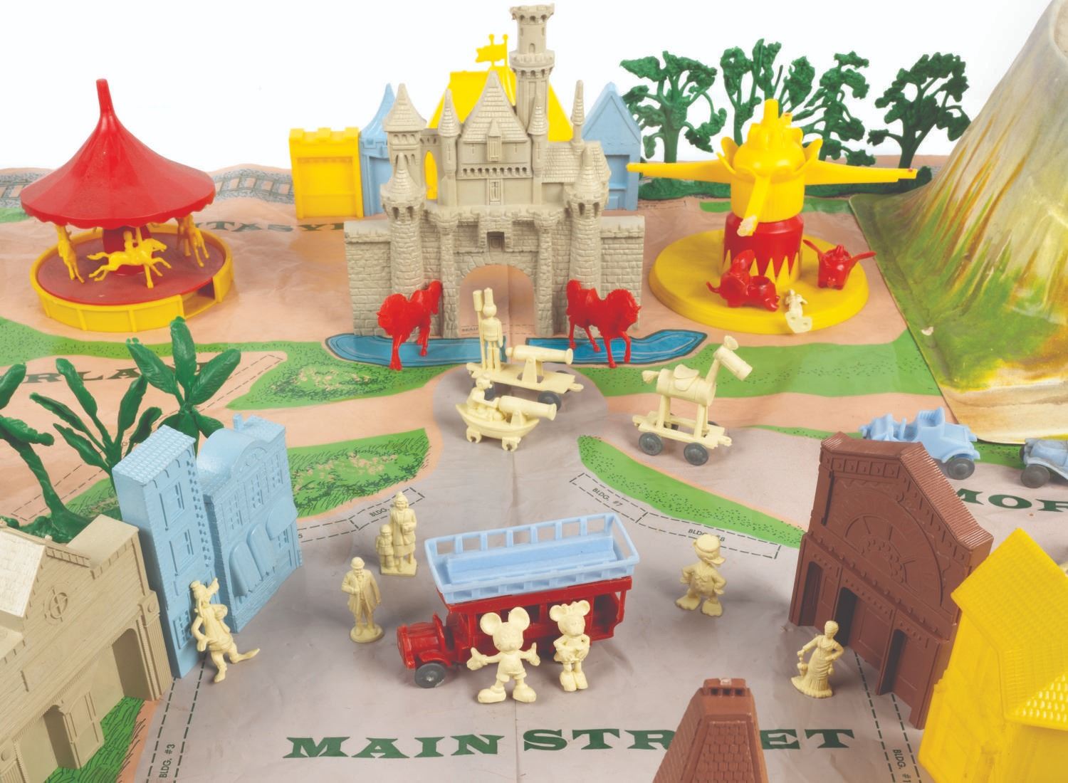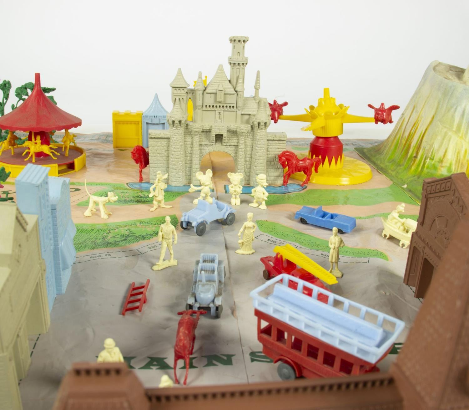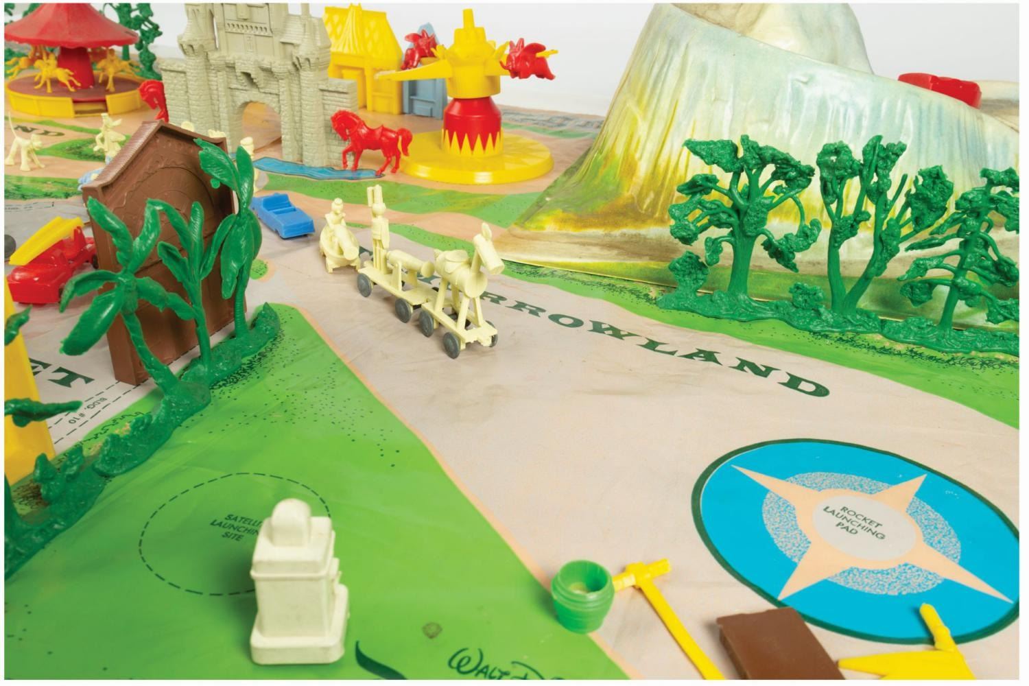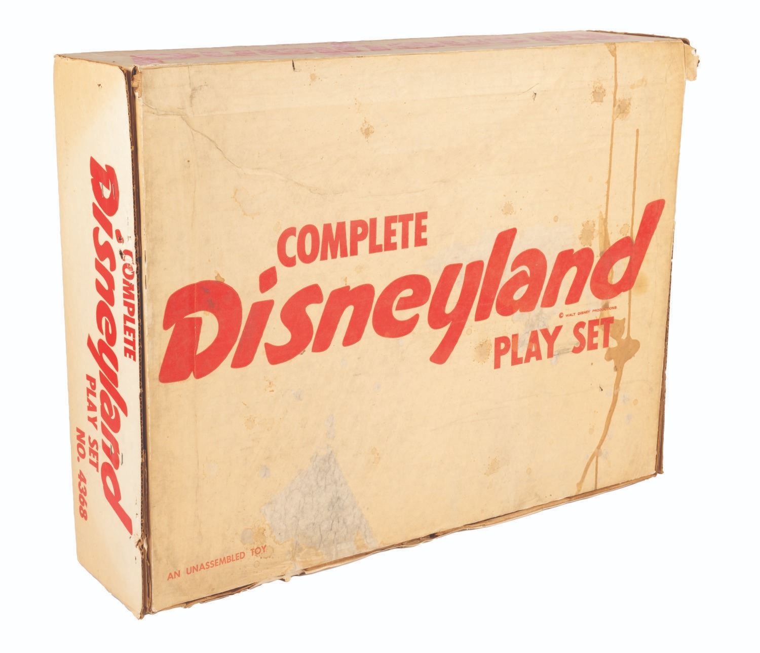 (Marx, 1961) A rare No. 4368 Marx Disneyland playset with its original box. The colorful plastic playset includes recreations of popular attractions the Matterhorn, Dumbo the Flying Elephant, King Arthur Carrousel, Sleeping Beauty Castle, and more. The incomplete set includes 11 building facades, eight trees, eight vehicles, and 22 figurines of Guests, animals, and characters. Ranging in size from a 1.5" tall Minnie Mouse figure to the 12" x 18" x 6.75" tall vacuum-formed Matterhorn on the 30" x 59" two-piece playmat, this set is in fair condition, with missing pieces, a broken off castle spire, the ride vehicles broken off Dumbo with two missing, residue and wear from age and handling, and creasing with light scratches to the playmat. The original 21.5" x 27.5" x 6.75" tall box is in fair condition, with wear, stains, tears, creases, and discoloration.
