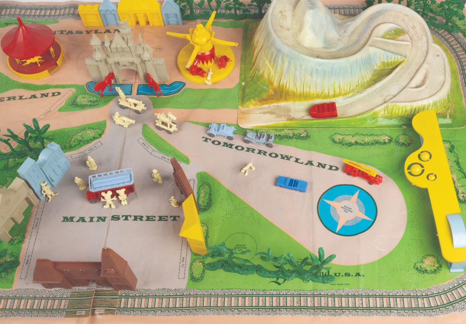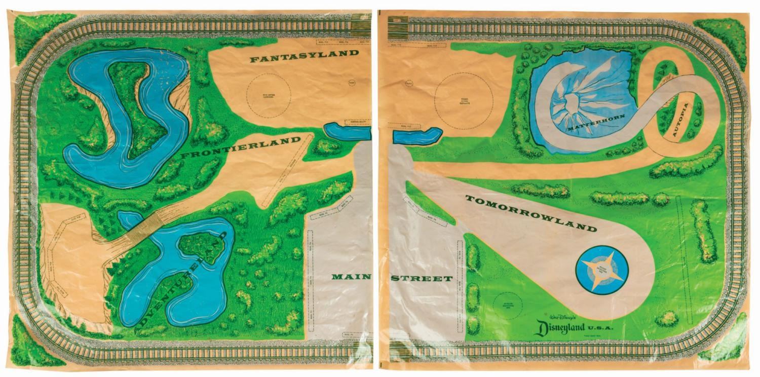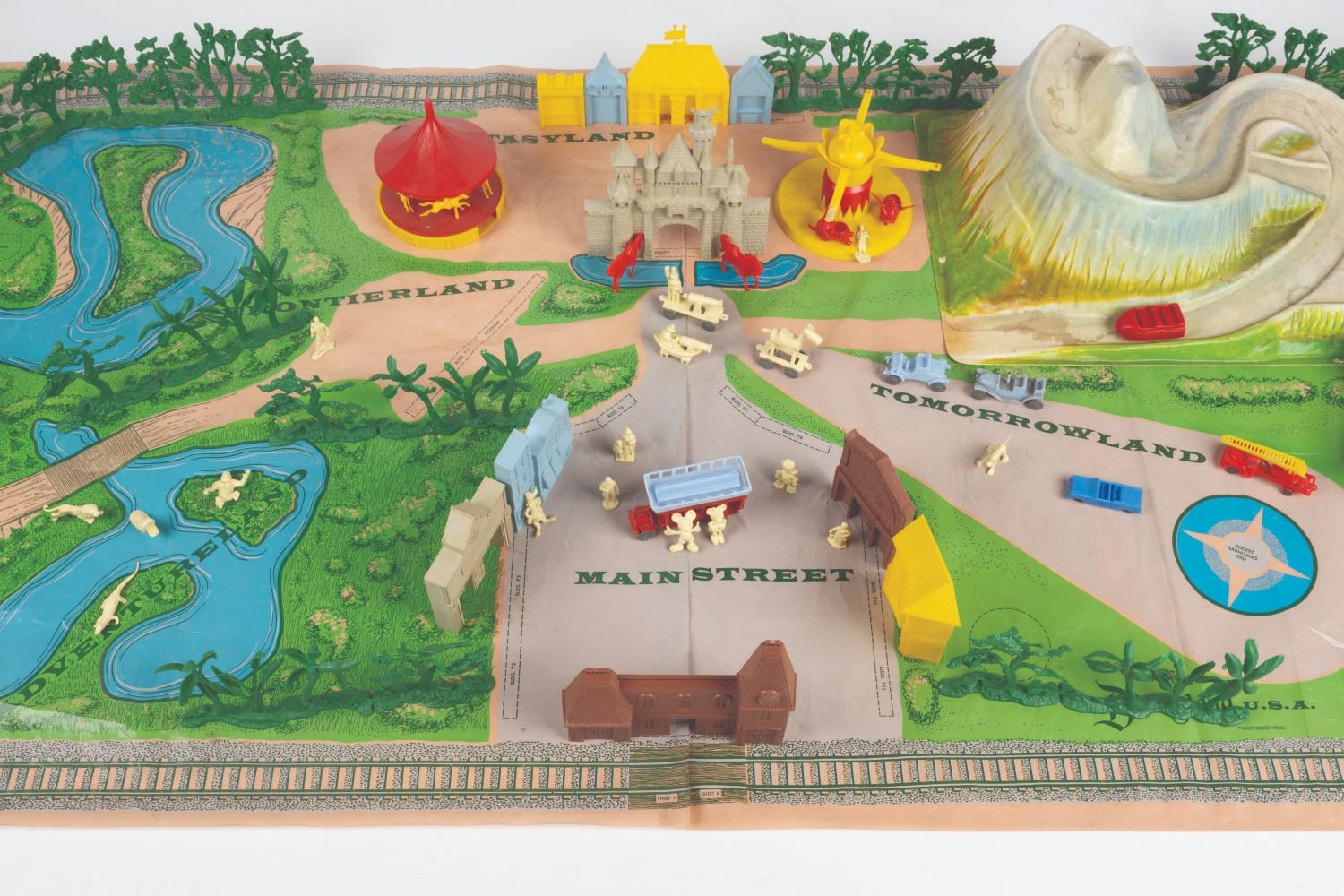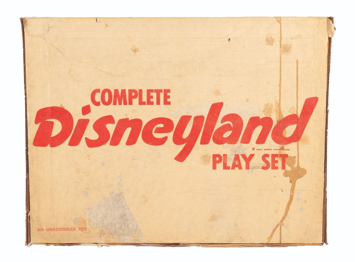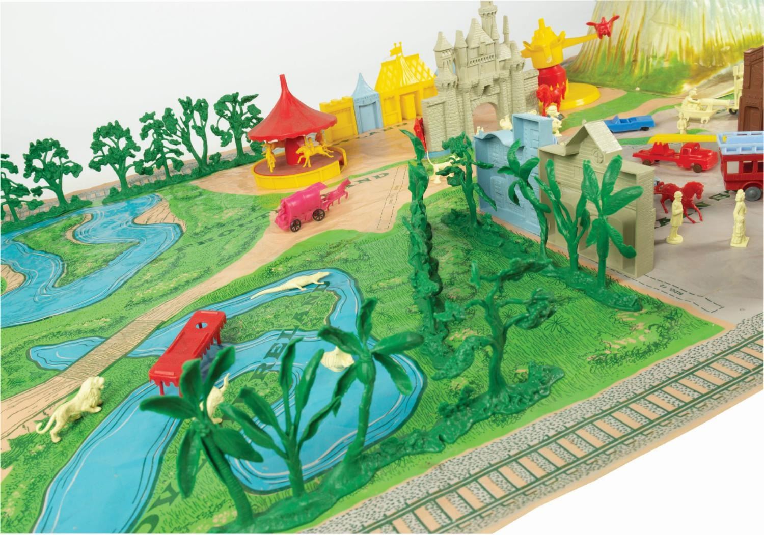 (Marx, 1961) A rare No. 4368 Marx Disneyland playset with its original box. The colorful plastic playset includes recreations of popular attractions the Matterhorn, Dumbo the Flying Elephant, King Arthur Carrousel, Sleeping Beauty Castle, and more. The incomplete set includes 11 building facades, eight trees, eight vehicles, and 22 figurines of Guests, animals, and characters. Ranging in size from a 1.5" tall Minnie Mouse figure to the 12" x 18" x 6.75" tall vacuum-formed Matterhorn on the 30" x 59" two-piece playmat, this set is in fair condition, with missing pieces, a broken off castle spire, the ride vehicles broken off Dumbo with two missing, residue and wear from age and handling, and creasing with light scratches to the playmat. The original 21.5" x 27.5" x 6.75" tall box is in fair condition, with wear, stains, tears, creases, and discoloration.