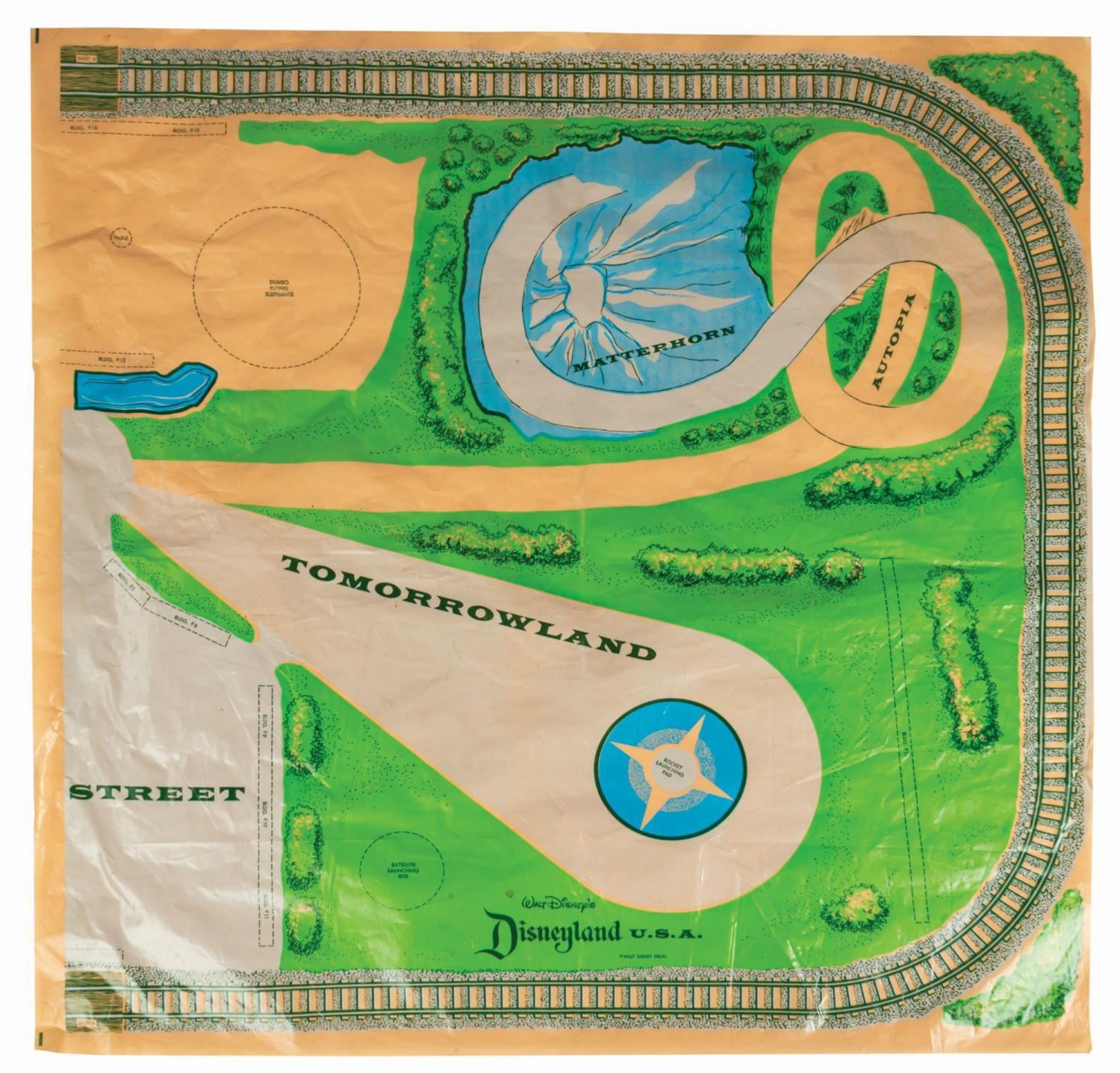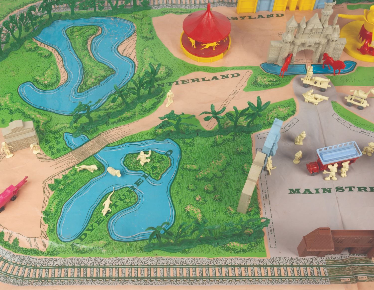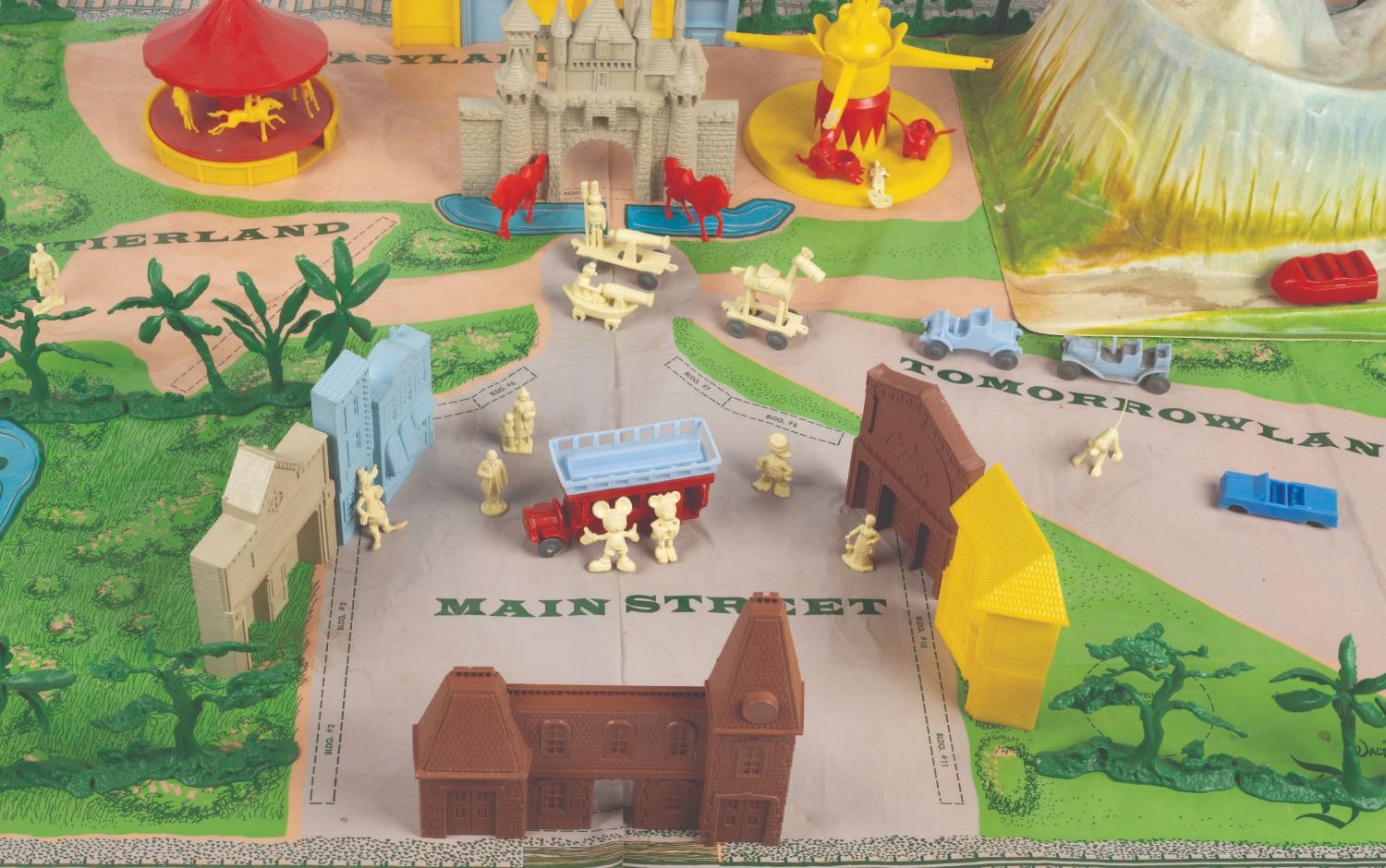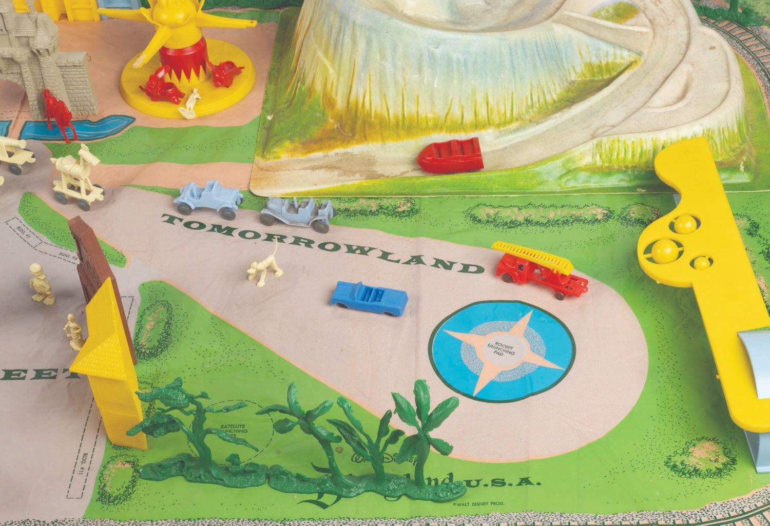 (Marx, 1961) A rare No. 4368 Marx Disneyland playset with its original box. The colorful plastic playset includes recreations of popular attractions the Matterhorn, Dumbo the Flying Elephant, King Arthur Carrousel, Sleeping Beauty Castle, and more. The incomplete set includes 11 building facades, eight trees, eight vehicles, and 22 figurines of Guests, animals, and characters. Ranging in size from a 1.5" tall Minnie Mouse figure to the 12" x 18" x 6.75" tall vacuum-formed Matterhorn on the 30" x 59" two-piece playmat, this set is in fair condition, with missing pieces, a broken off castle spire, the ride vehicles broken off Dumbo with two missing, residue and wear from age and handling, and creasing with light scratches to the playmat. The original 21.5" x 27.5" x 6.75" tall box is in fair condition, with wear, stains, tears, creases, and discoloration.