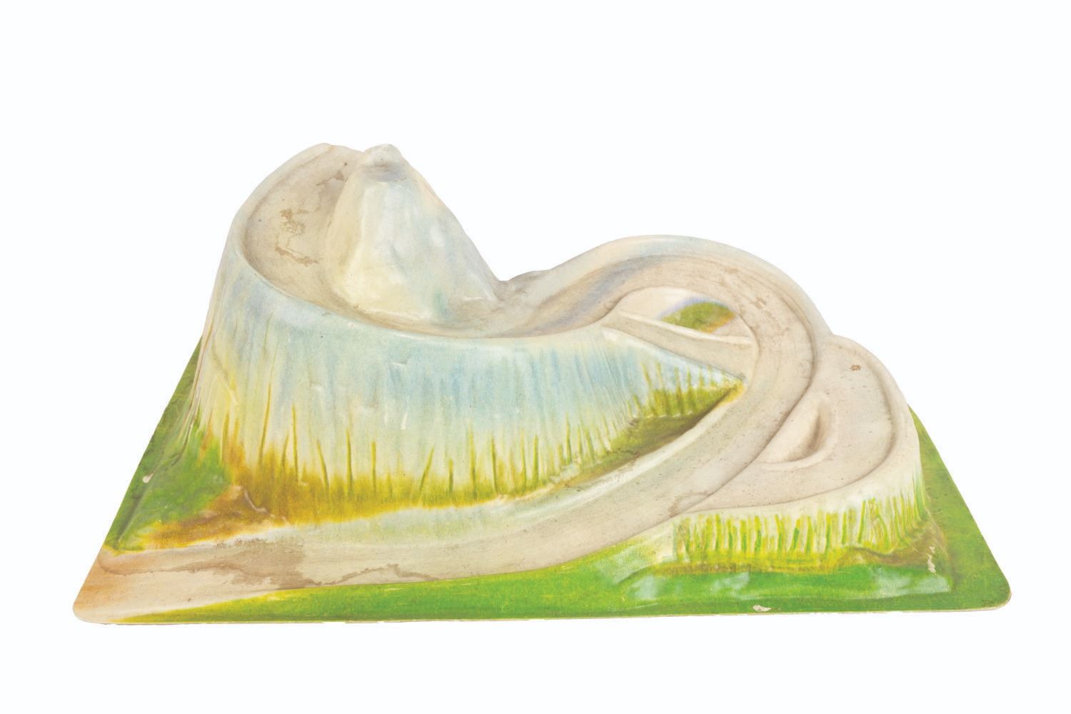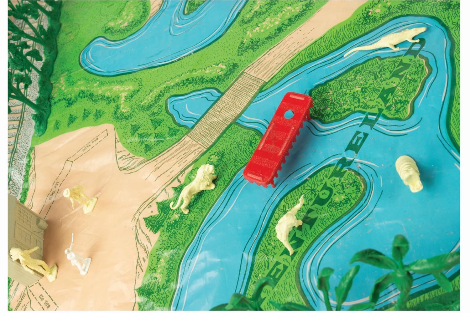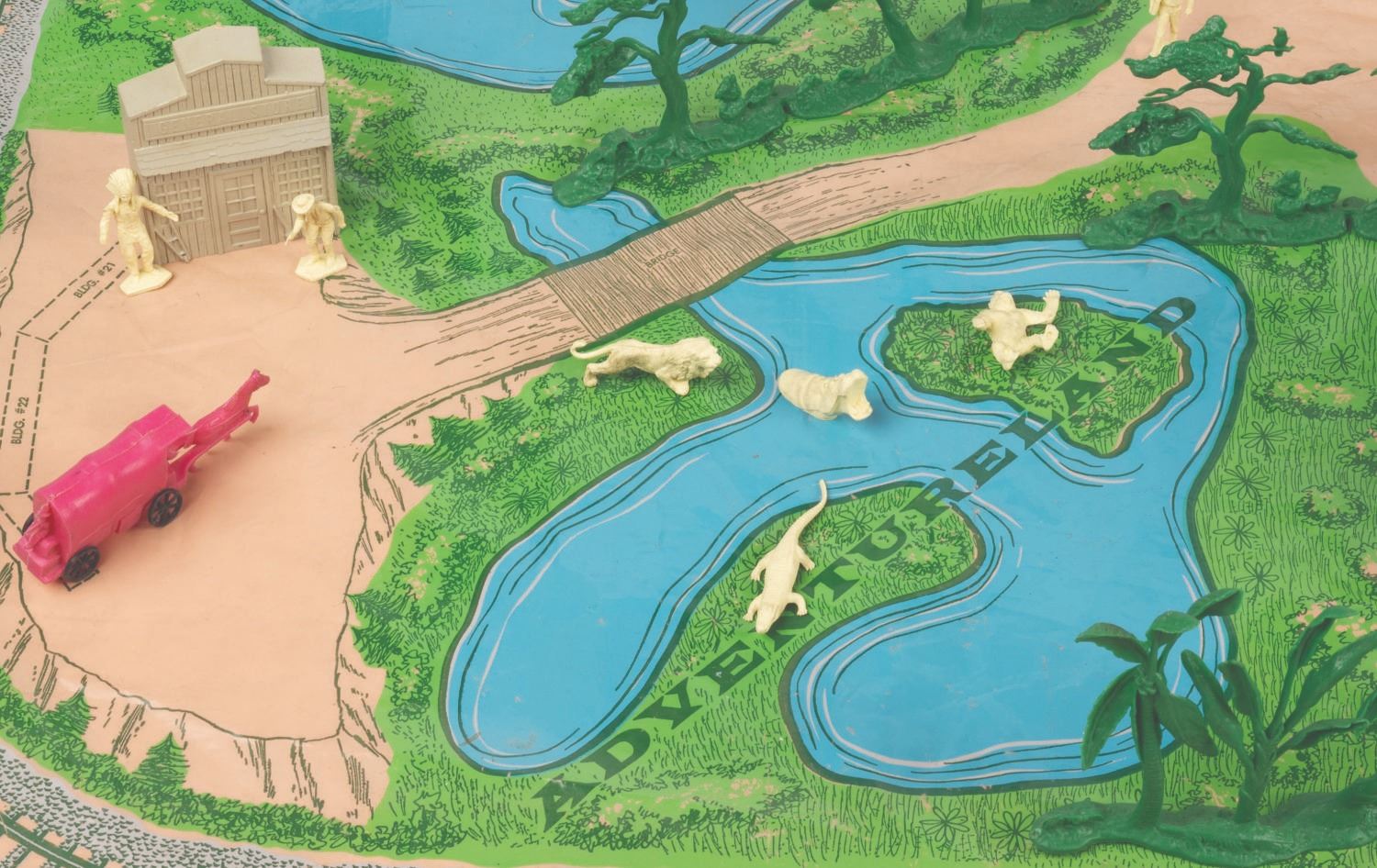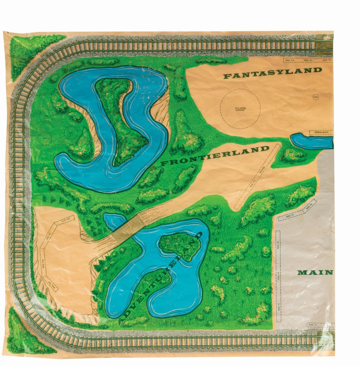 (Marx, 1961) A rare No. 4368 Marx Disneyland playset with its original box. The colorful plastic playset includes recreations of popular attractions the Matterhorn, Dumbo the Flying Elephant, King Arthur Carrousel, Sleeping Beauty Castle, and more. The incomplete set includes 11 building facades, eight trees, eight vehicles, and 22 figurines of Guests, animals, and characters. Ranging in size from a 1.5" tall Minnie Mouse figure to the 12" x 18" x 6.75" tall vacuum-formed Matterhorn on the 30" x 59" two-piece playmat, this set is in fair condition, with missing pieces, a broken off castle spire, the ride vehicles broken off Dumbo with two missing, residue and wear from age and handling, and creasing with light scratches to the playmat. The original 21.5" x 27.5" x 6.75" tall box is in fair condition, with wear, stains, tears, creases, and discoloration.