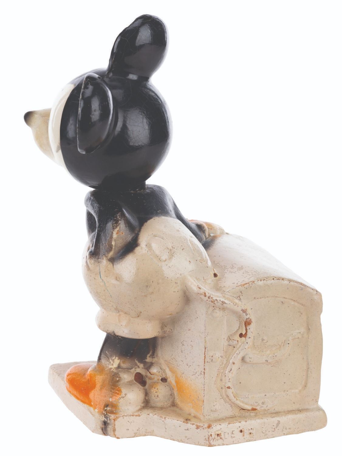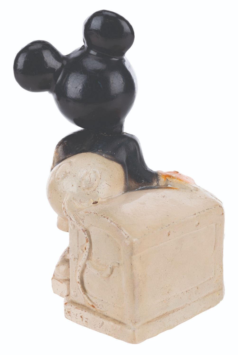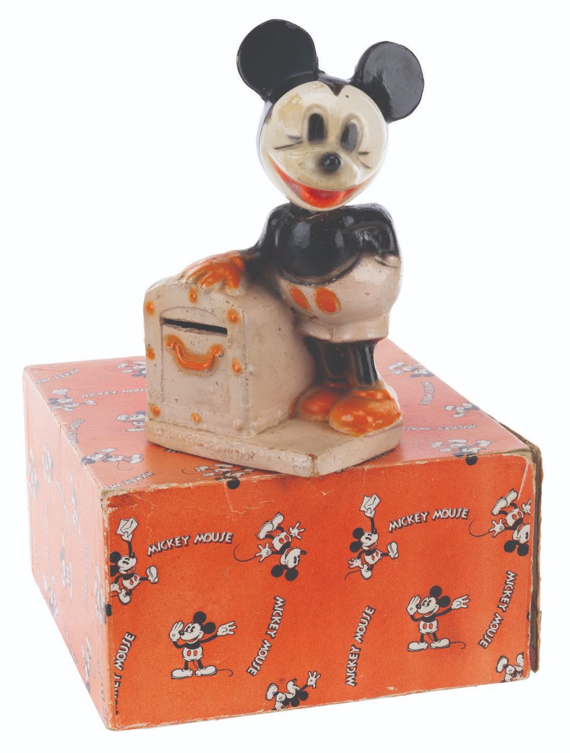 (Crown Toy, 1938) A Walt Disney's Mickey Mouse Bank with the rarely retained box by Crown Toy Manufacturing Company Inc. The 1930s composition toy features Mickey Mouse with a movable head and a metal door with a built-in lock. Measuring 3.75" x 3" x 6" tall, the bank is in very good condition with typical wear from use and age, missing the key. Mickey's head is loose, requiring a new rubber band.