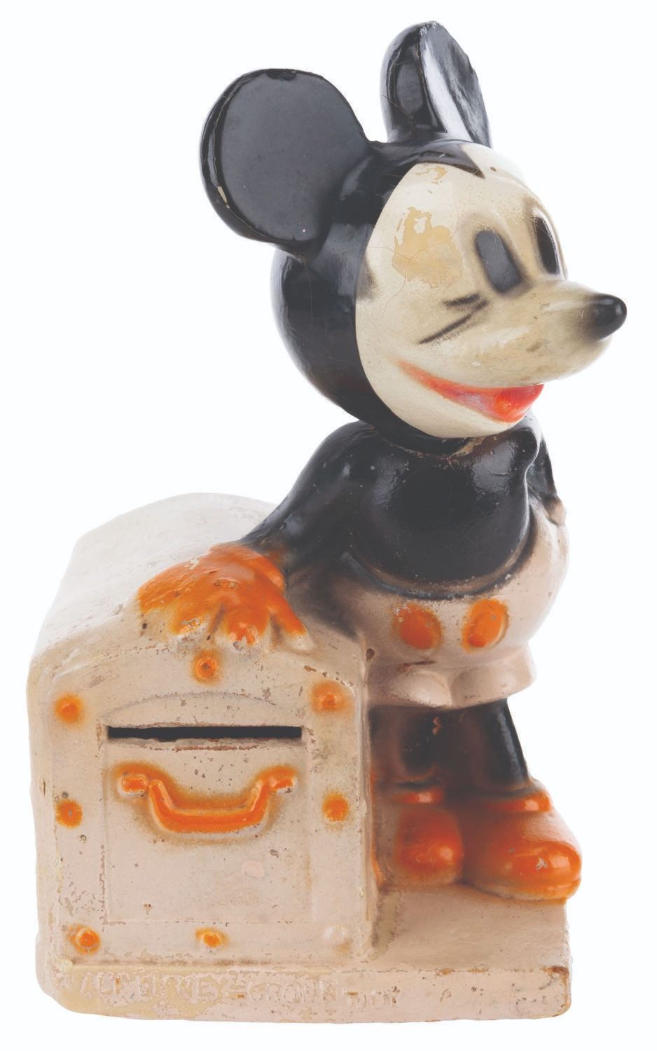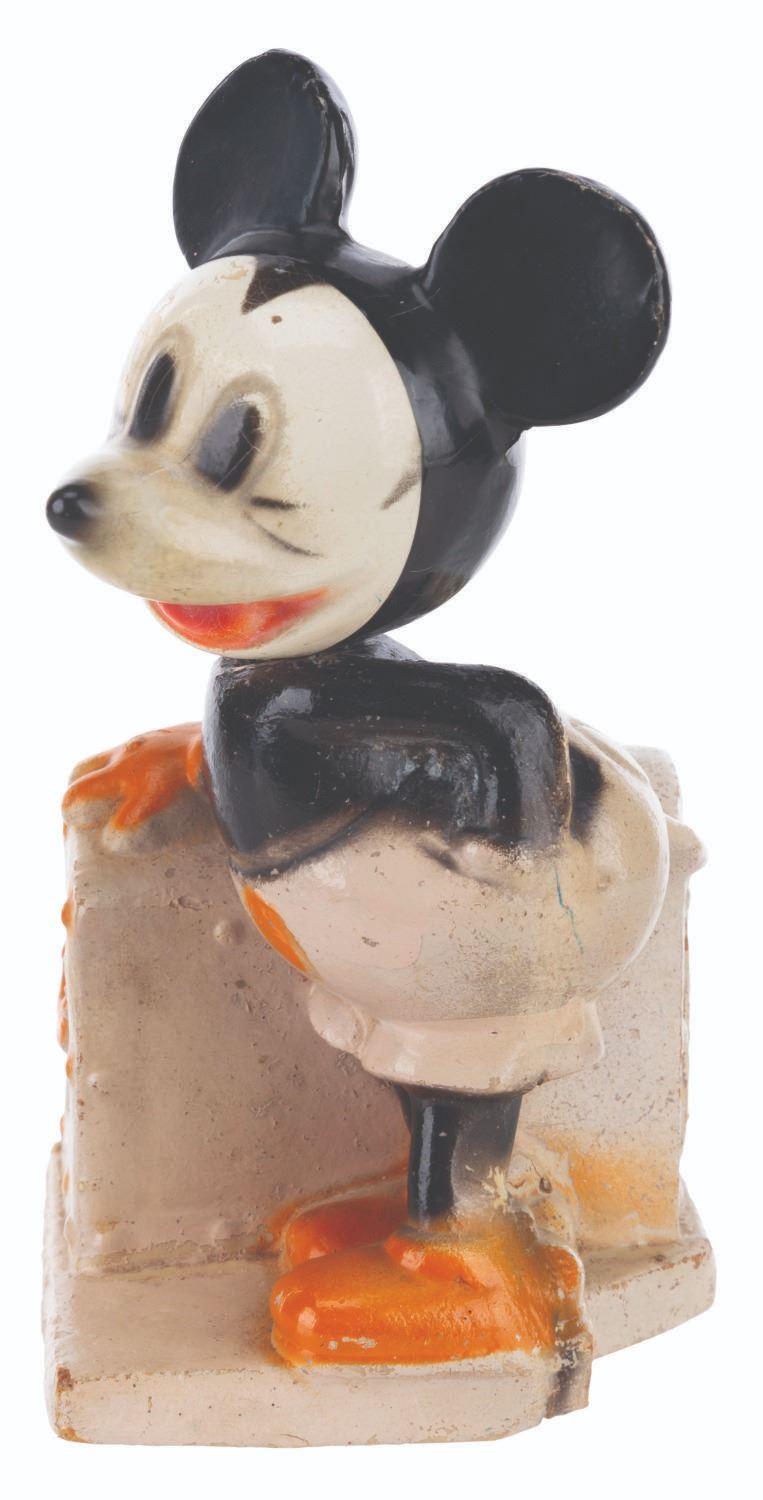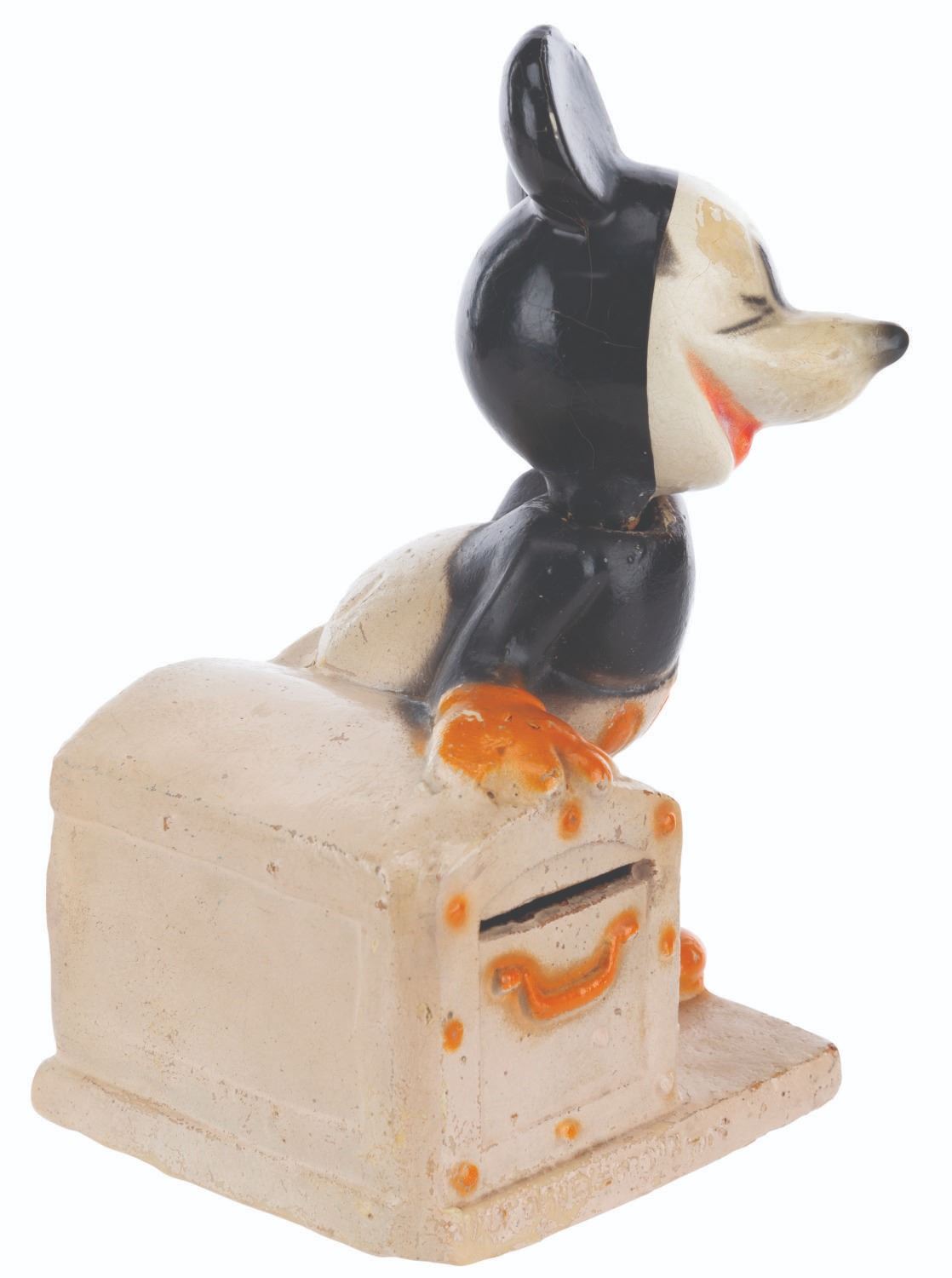 (Crown Toy, 1938) A Walt Disney's Mickey Mouse Bank with the rarely retained box by Crown Toy Manufacturing Company Inc. The 1930s composition toy features Mickey Mouse with a movable head and a metal door with a built-in lock. Measuring 3.75" x 3" x 6" tall, the bank is in very good condition with typical wear from use and age, missing the key. Mickey's head is loose, requiring a new rubber band.