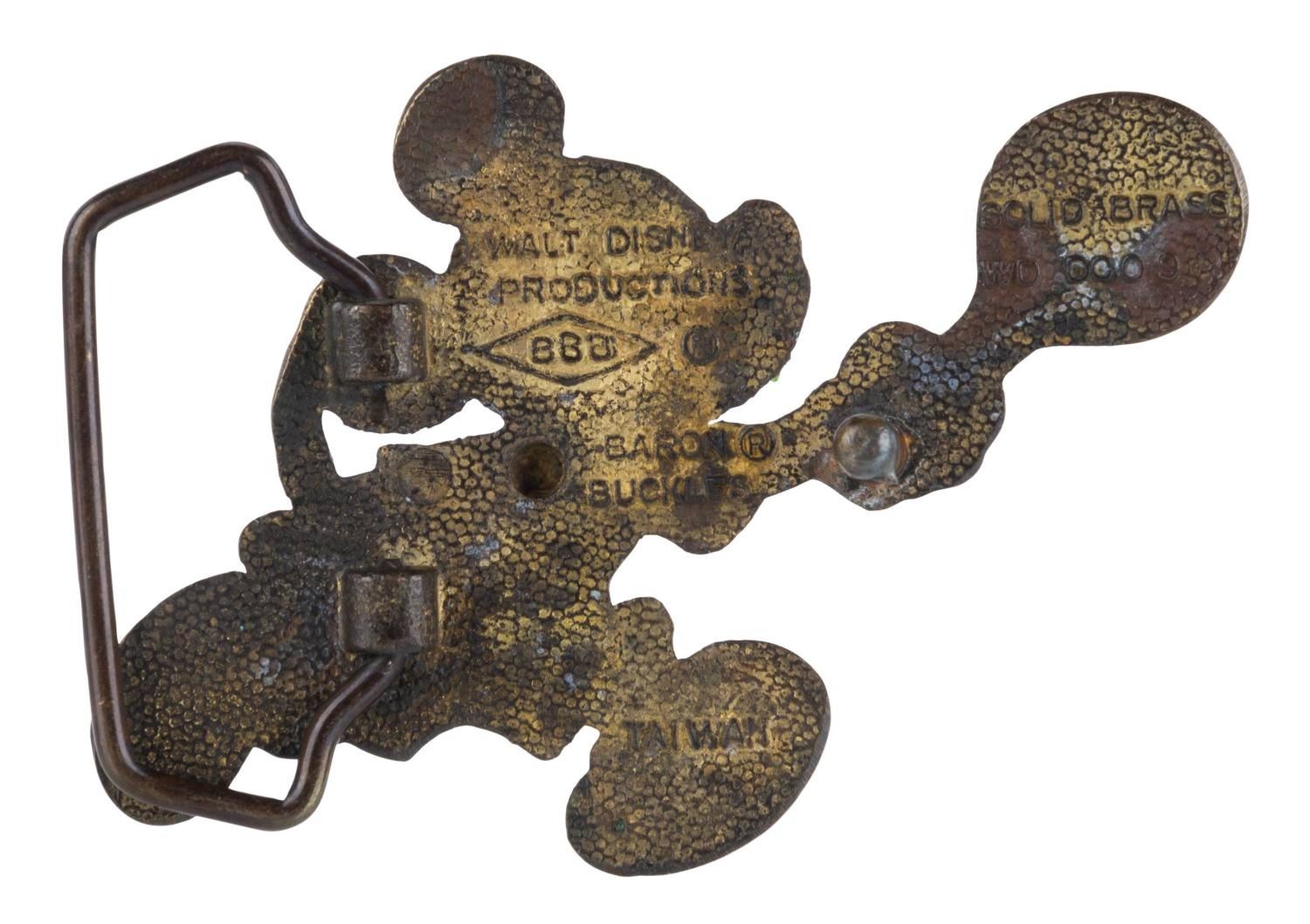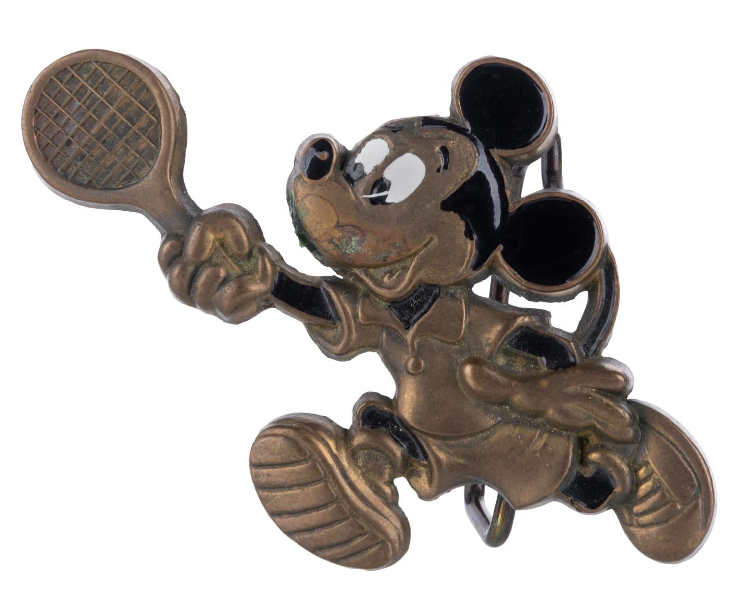 (Baron, 1970s) A rare belt buckle of Mickey Mouse playing tennis. Measuring 3.25"x2.5", the solid brass piece is in good condition exhibiting tarnish, oxidation, and minor wear.