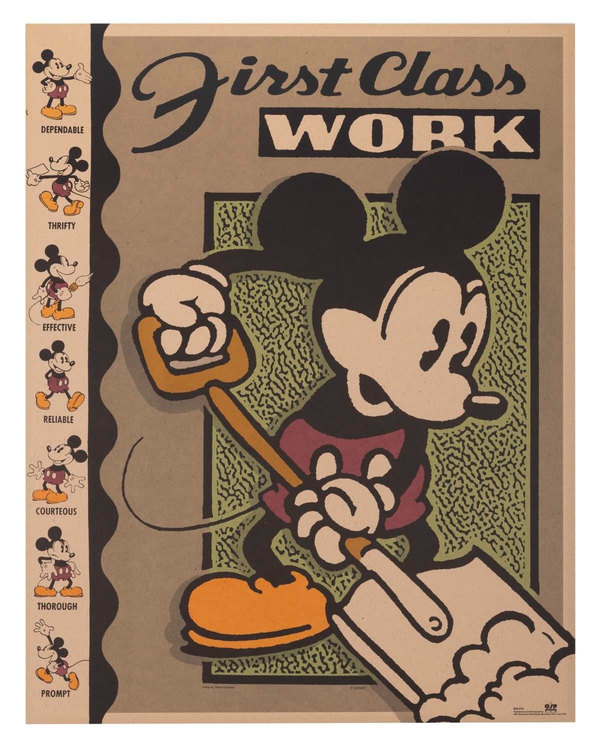 (Disney, 1993) A rare Mickey Mouse “First Class Work” poster designed by Richard Duerrstein. Measuring 22” x 28”, the poster is in very good condition, mounted to foam board for display.