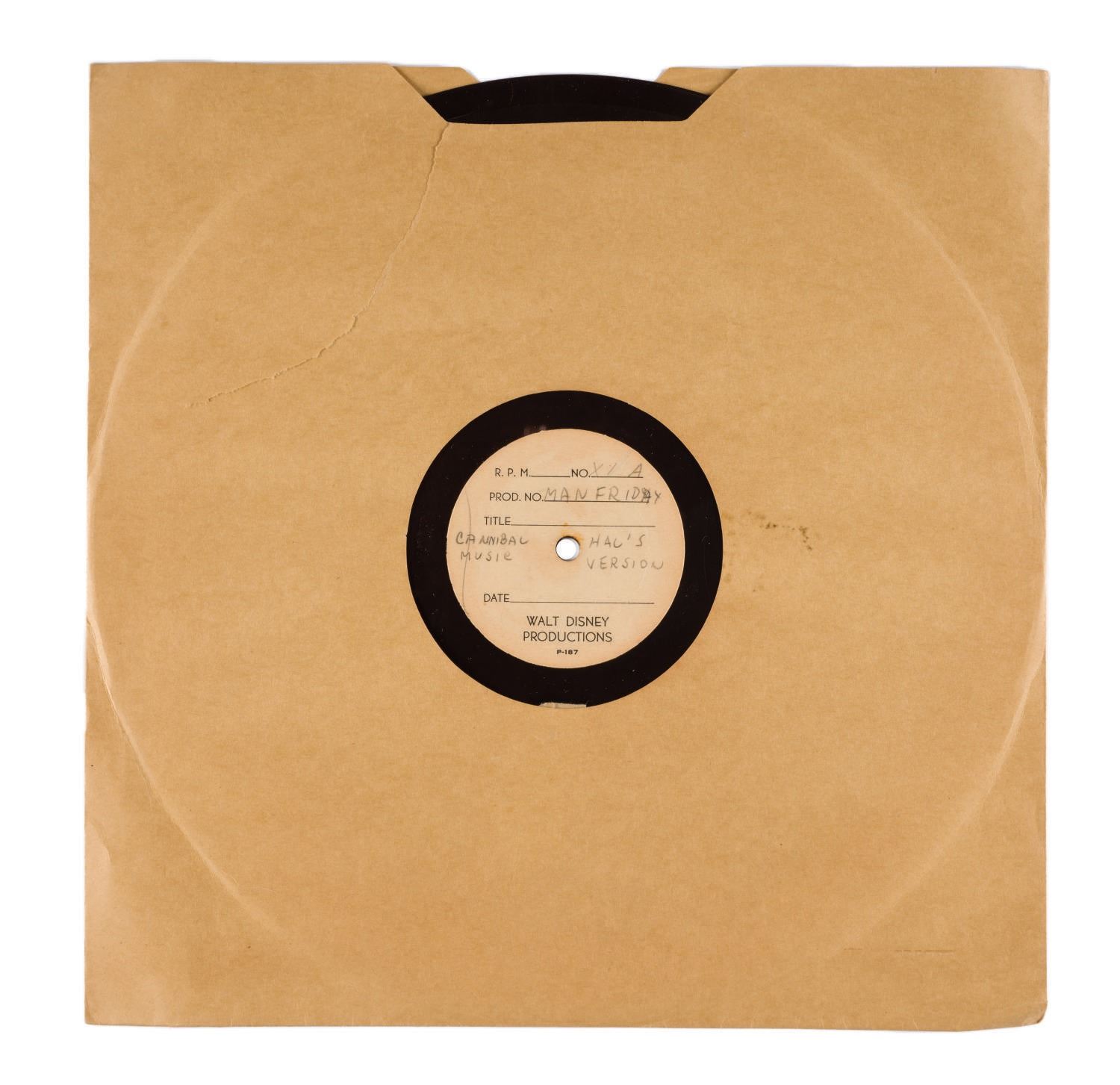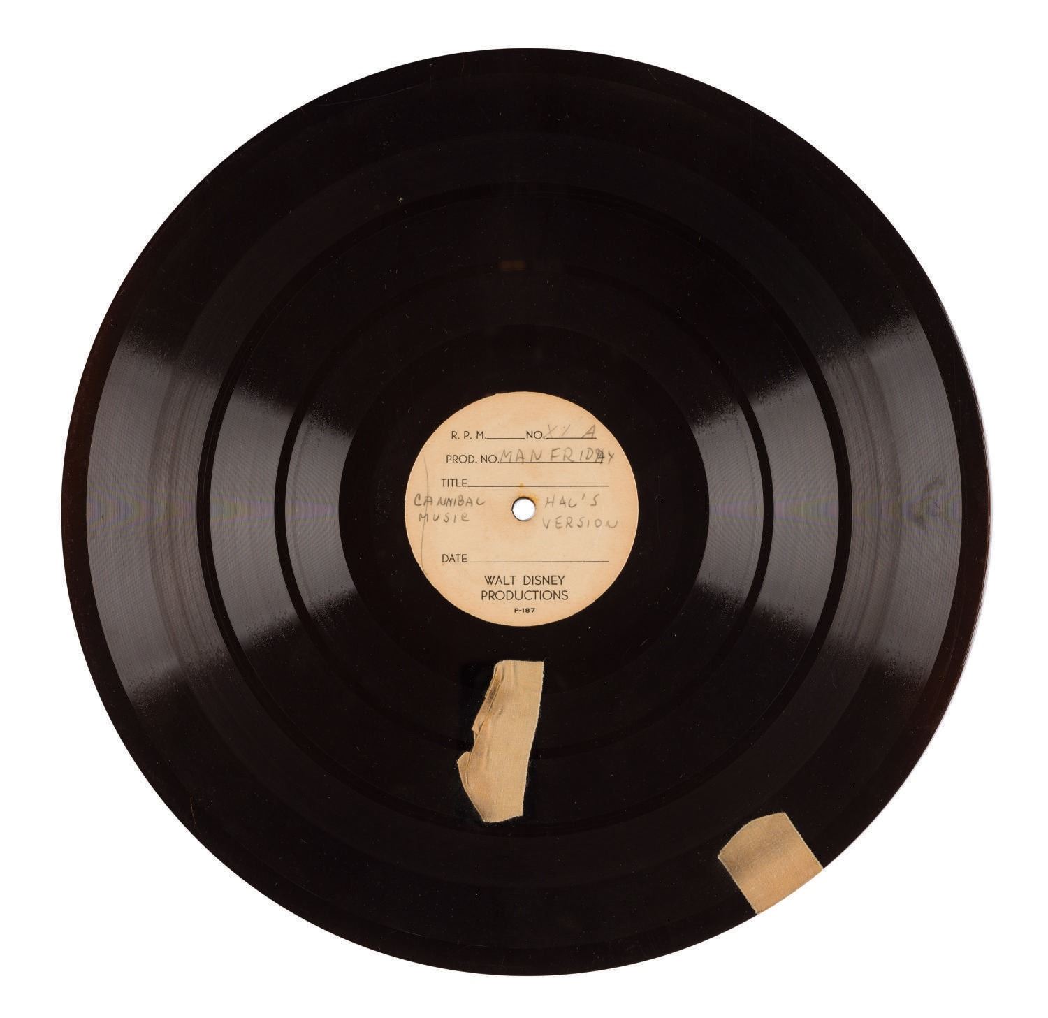 (Disney, 1930s) An extremely rare recording of music tracks used in production of "Mickey's Man Friday," released 1935. Sections of the record have been taped to prevent playing and recording. While the final music has been credited to Frank Churchill and Bert Lewis, this rare record is labeled "Man Friday Cannibal Music Hal's Version X 1A" (Referring to Sound Effects percussionist Hal Rees). Measuring 12", the record is in good condition despite intentional tape applied to prevent playback and recording, and stress marks along sections of edge.