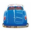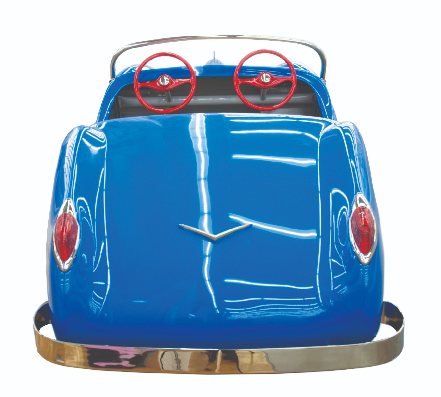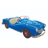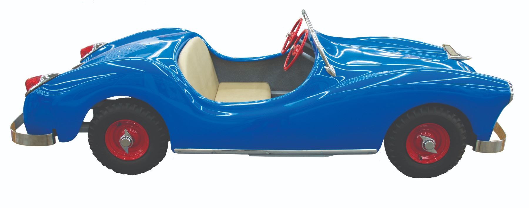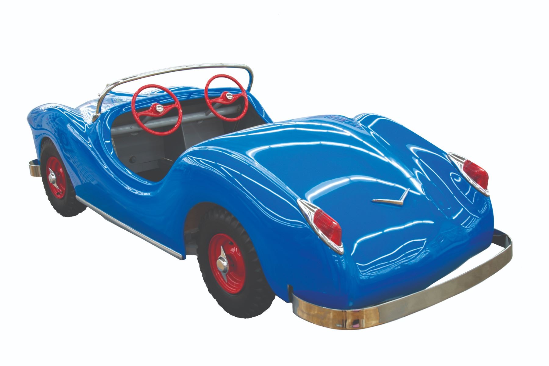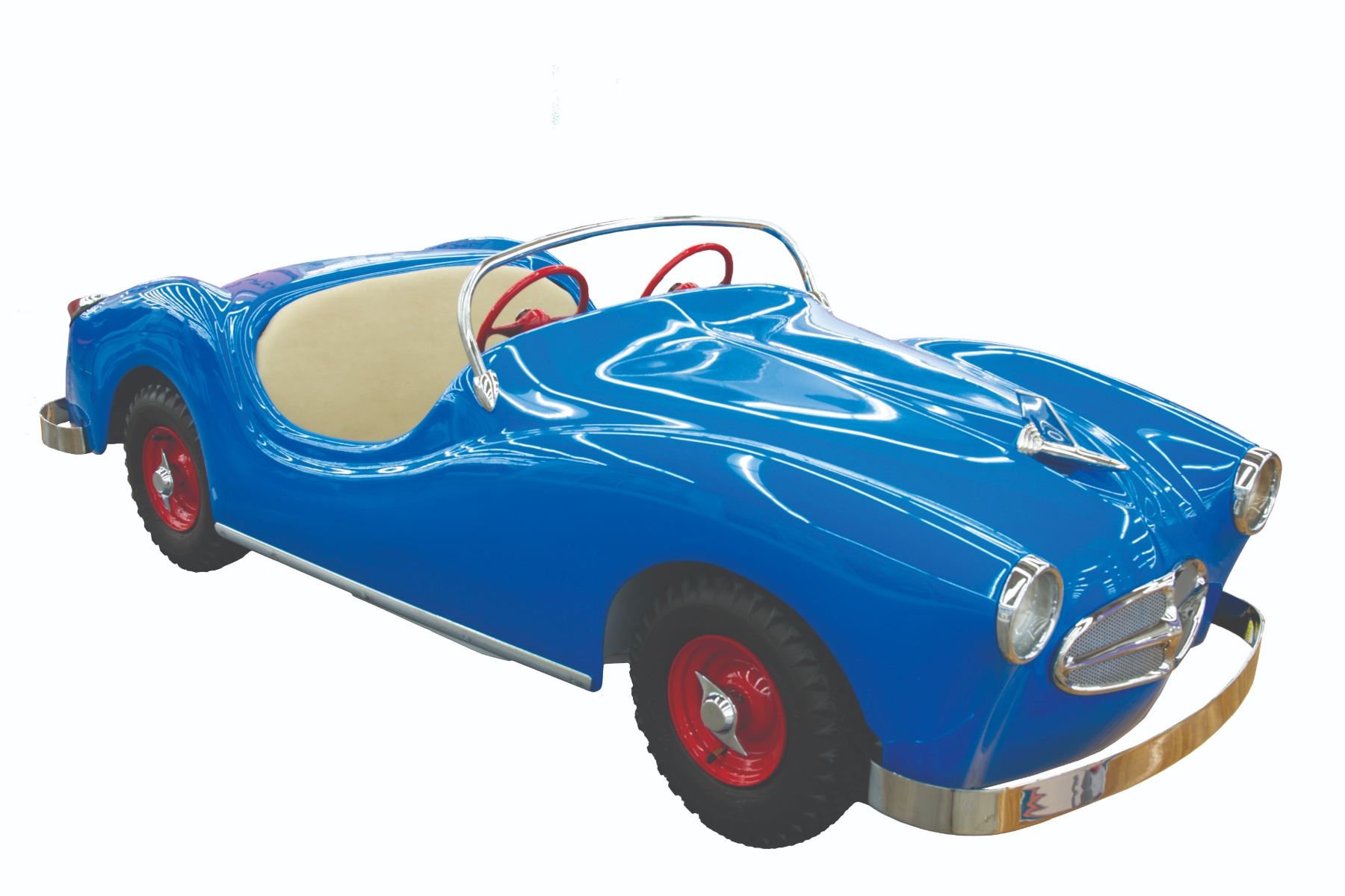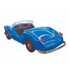 (Disneyland, 1957) An extremely rare original vehicle from the Fantasyland Midget Autopia. Only operating in Disneyland from 1957 through 1966, the cars were built for children too small to ride the full-sized Autopia. The cars were electric rather than motorized and ran on a track. It was extremely popular with small children, but there were problems with the design, capacity, and the overall idea of setting young children off by themselves. The track occupied a fair amount of space in Fantasyland and was removed in 1966 to make way for the It's a Small World attraction. Walt donated the entire ride, the cars, the track, and the electrical system to his boyhood hometown of Marceline Missouri, and even paid for the installation in a local park. The cars ran for several years before the ride was finally closed. This original car is one of only a handful known to exist and features the original body, wheels, and steering wheel from Disneyland, with restored red rims with chrome spinners, a new wood and vinyl seat, windshield bar and "firewall" footrest, and decals. The taillights are S&M vintage 1950's replacements for the originals. Measuring 95"x33"x27.5", the car is in fine restored condition.