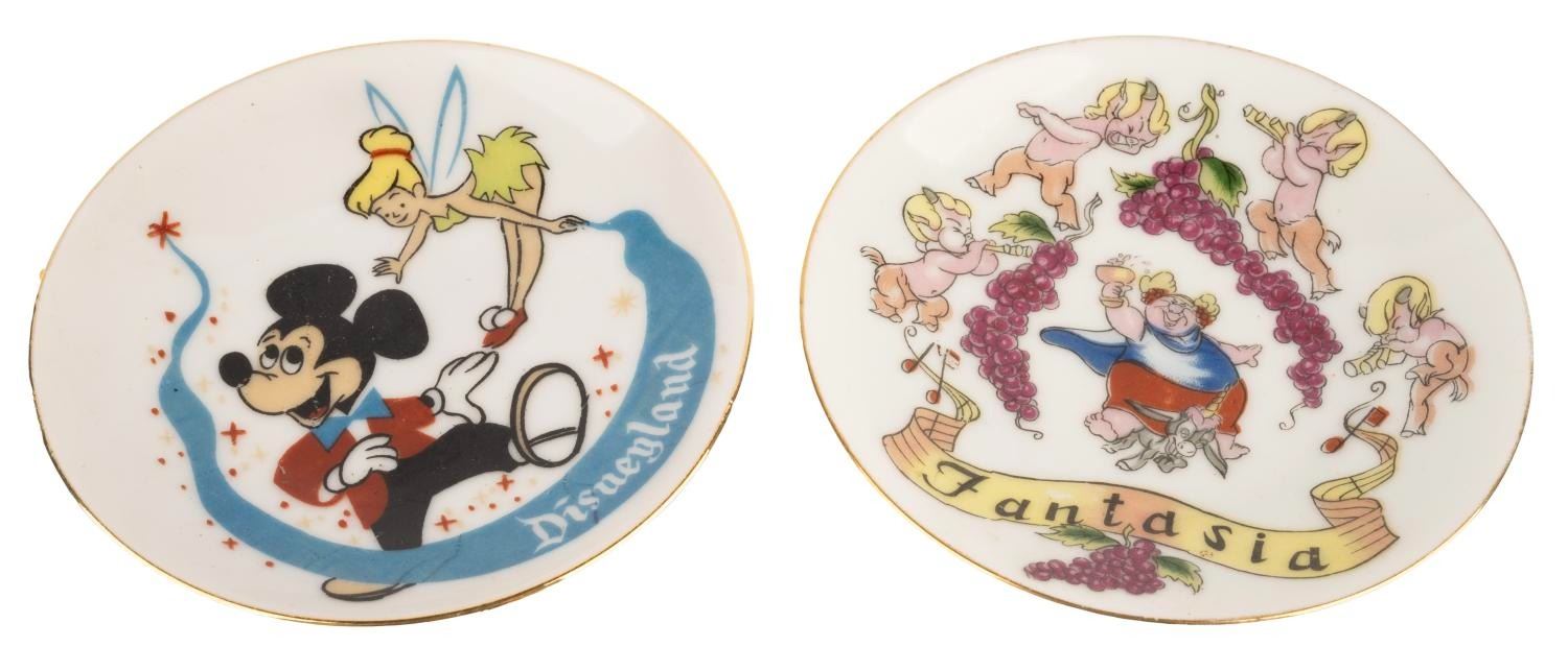 (Disneyland, 1950s) A Pair of Disneyland souvenir plates featuring Mickey, Tinker Bell, and Bacchus from Fantasia. Measuring 4" in diameter, these plates are in very good condition exhibiting minor surface wear.