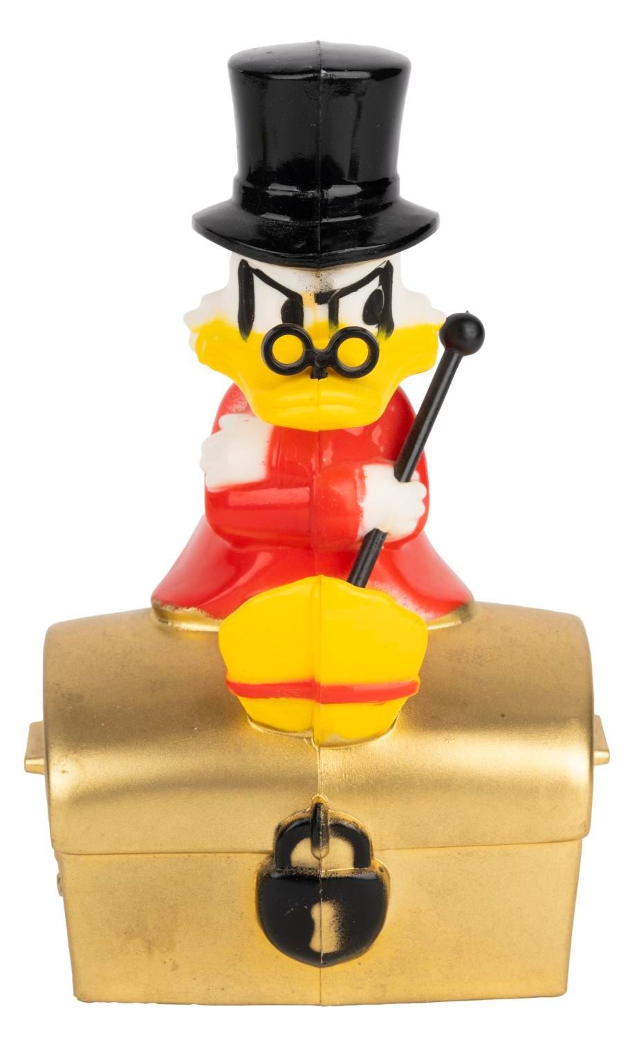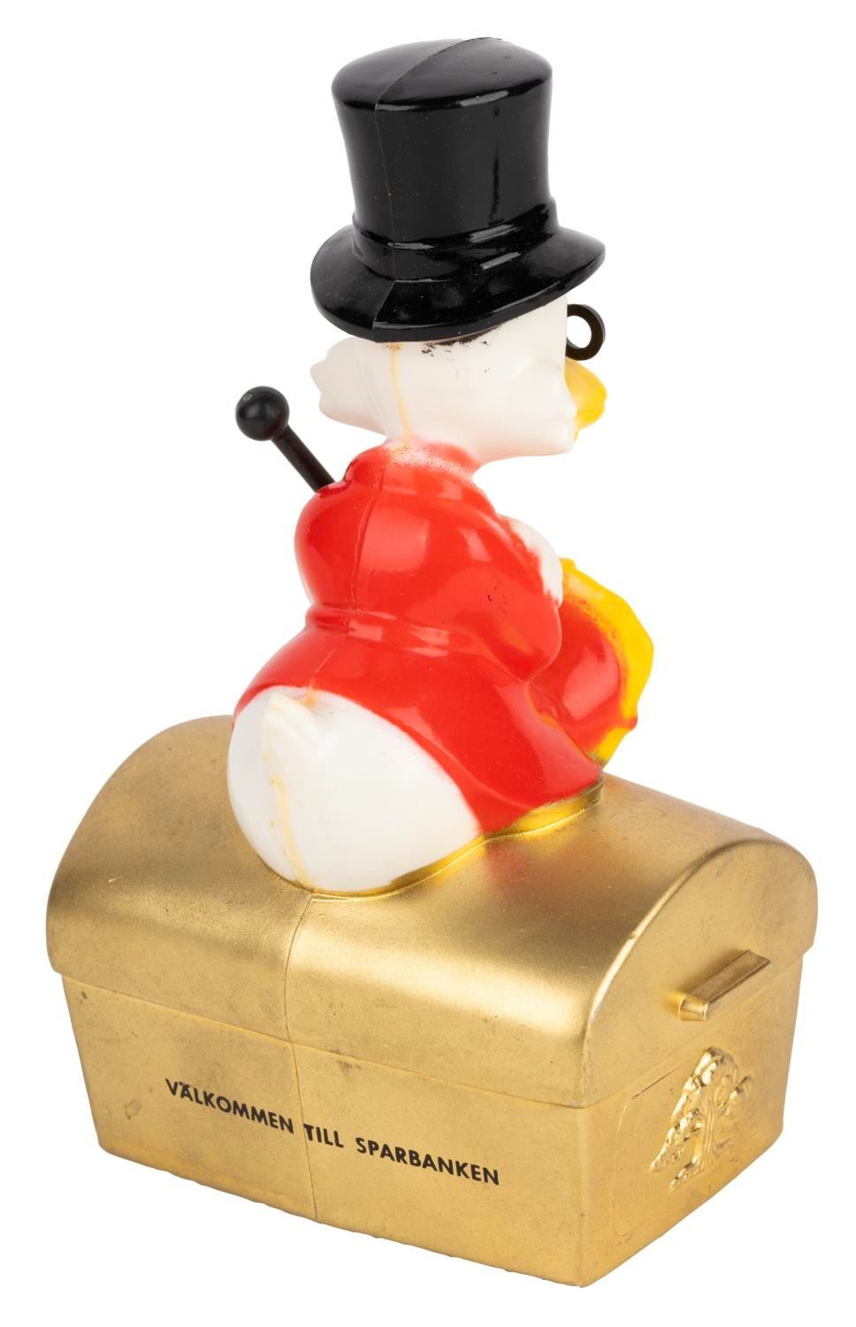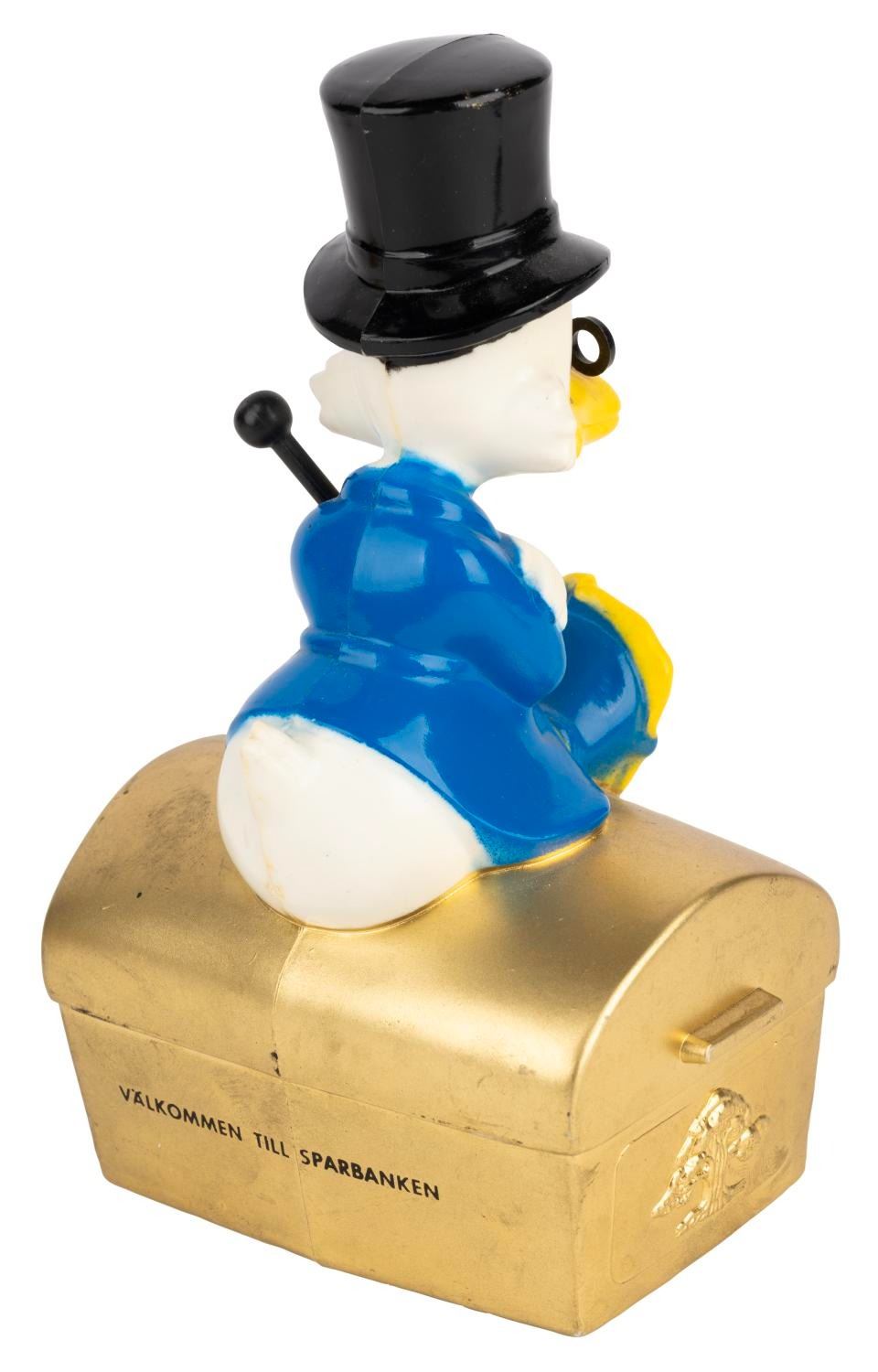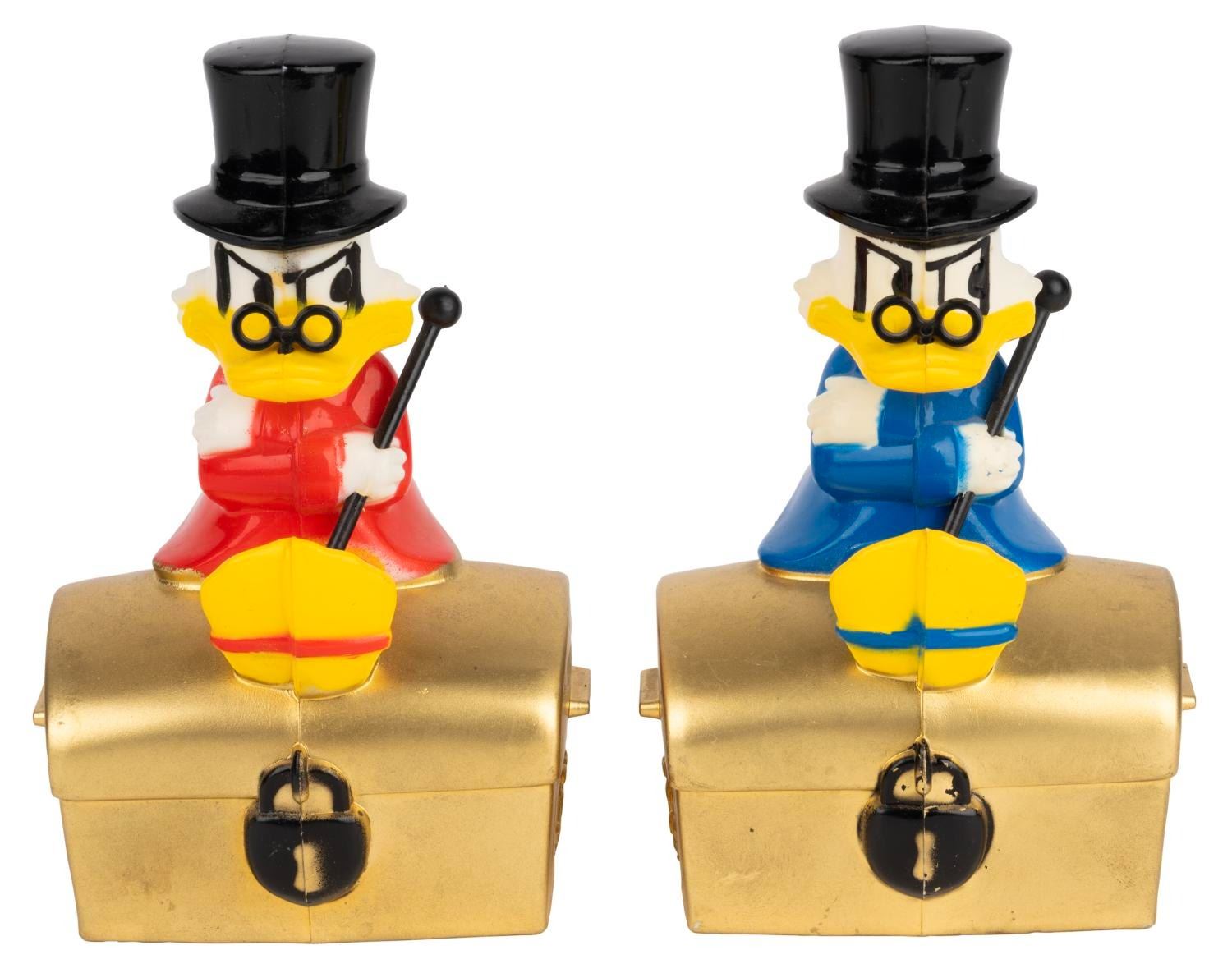 (MK Tresmer, 1950s) A pair of extremely rare early Scrooge McDuck banks produced by the MK Tresmer company of Finland. Each measuring 3.5" x 2.75" x 6.25" tall, the banks are in very good condition with light wear and missing their keys.