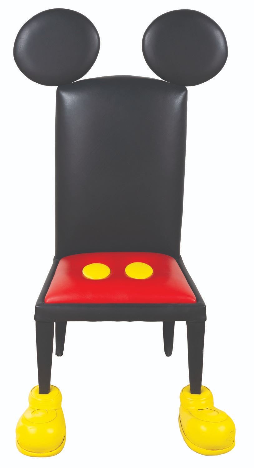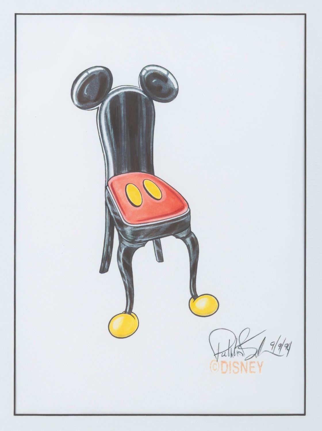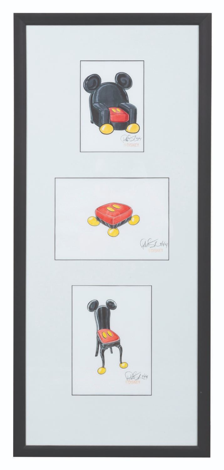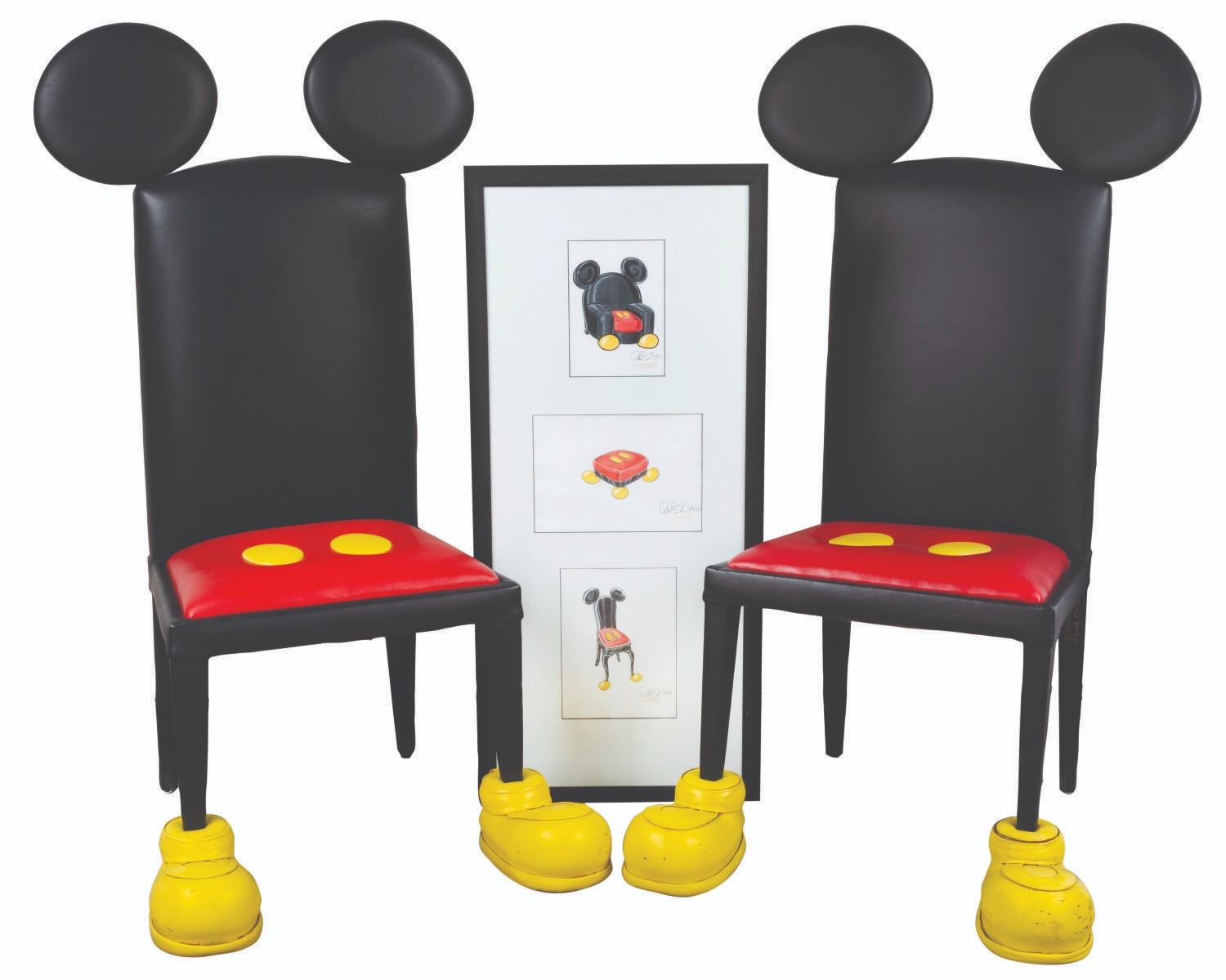 (Disney, 1994) An incredibly rare pair of Mickey Mouse chairs and their original framed concept drawings. Designed by Disney artist Paddy Gordon, these leather-upholstered pine chairs incorporate Mickey's trademark red shorts and yellow shoes into modern high-end furniture. Included are three hand-drawn concepts accomplished in ink, marker, and colored pencil, which depict the chairs, an armchair, and a Mickey ottoman. The chairs and framed concept drawings are all signed by the artist. Measuring 28" x 28" x 51" tall each, the chairs are in good condition with wear, light soiling, scratches, tape outline on the back of one chair, the black backing missing from one set of ears, and scuffs, notably on the shoes. With image sizes ranging from 6" x 8.5" to 8" x 11" in the 19" x 43" frame, the concept drawings are in fine condition with light wear to the frame. Due to size and weight, this lot requires special shipping arrangements. Please inquire before bidding.