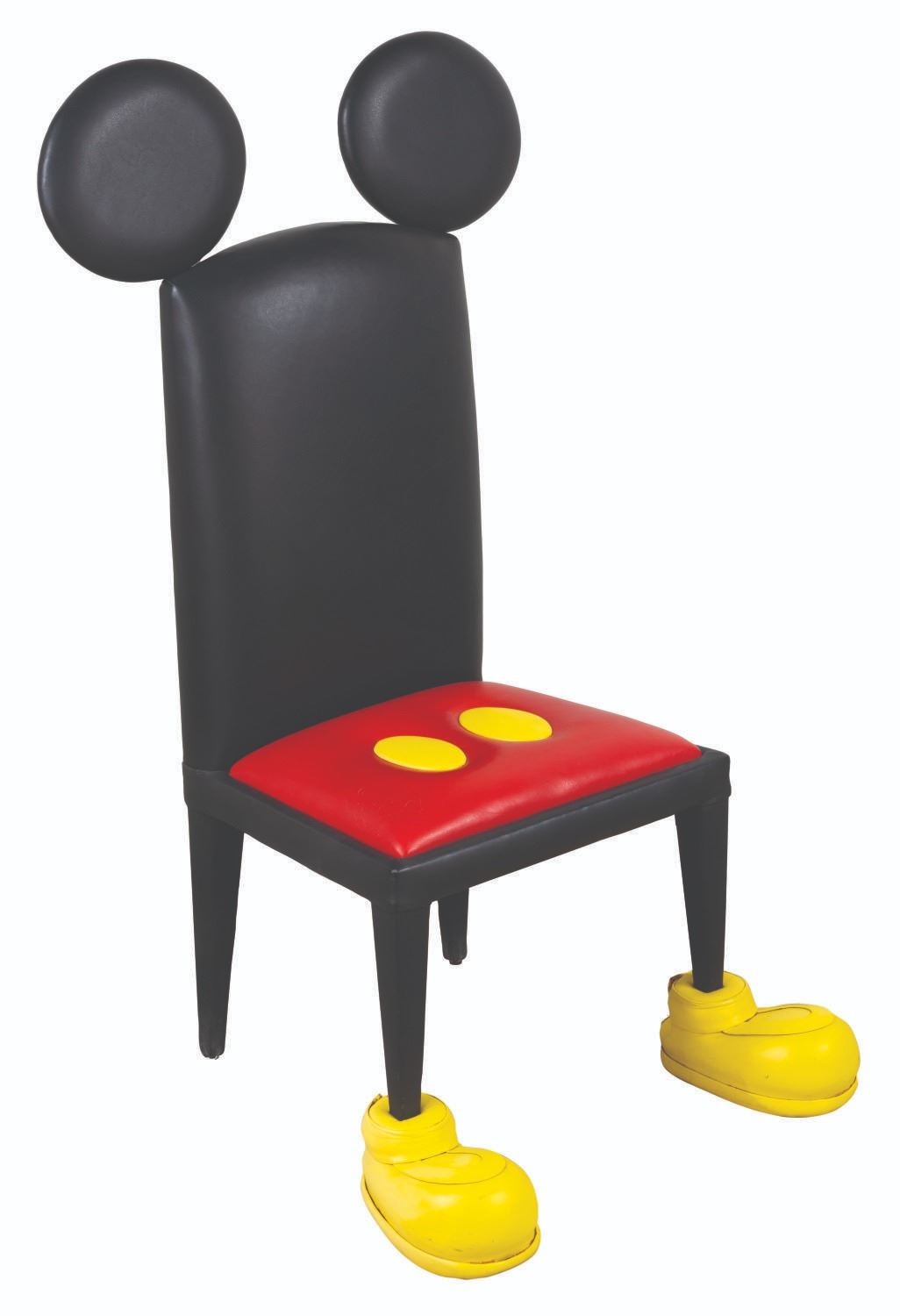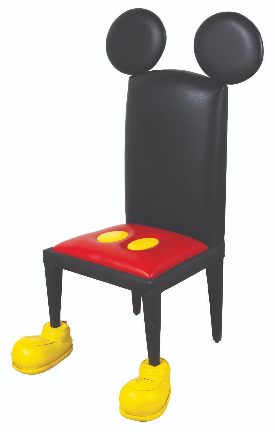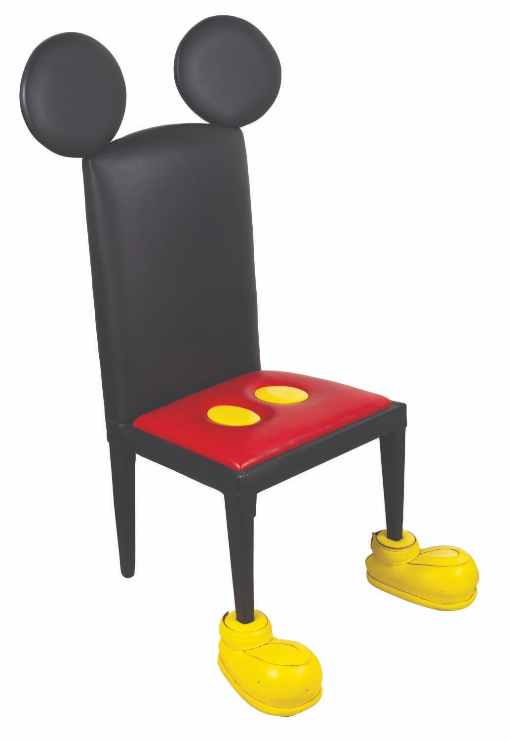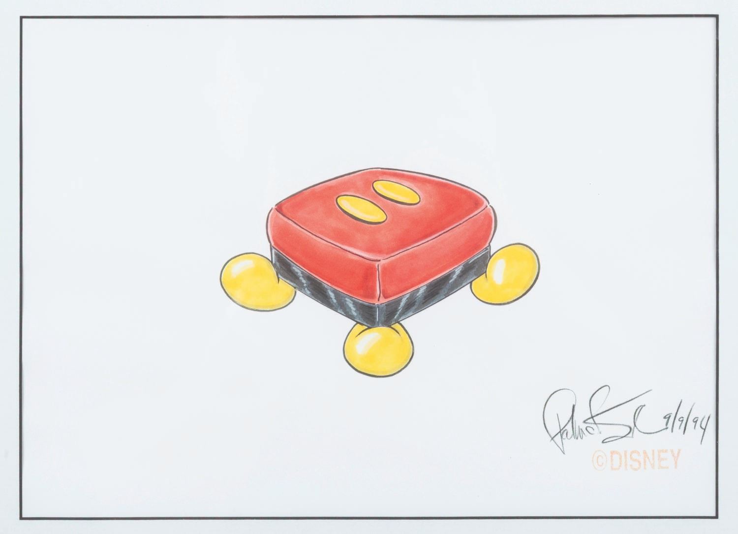 (Disney, 1994) An incredibly rare pair of Mickey Mouse chairs and their original framed concept drawings. Designed by Disney artist Paddy Gordon, these leather-upholstered pine chairs incorporate Mickey's trademark red shorts and yellow shoes into modern high-end furniture. Included are three hand-drawn concepts accomplished in ink, marker, and colored pencil, which depict the chairs, an armchair, and a Mickey ottoman. The chairs and framed concept drawings are all signed by the artist. Measuring 28" x 28" x 51" tall each, the chairs are in good condition with wear, light soiling, scratches, tape outline on the back of one chair, the black backing missing from one set of ears, and scuffs, notably on the shoes. With image sizes ranging from 6" x 8.5" to 8" x 11" in the 19" x 43" frame, the concept drawings are in fine condition with light wear to the frame. Due to size and weight, this lot requires special shipping arrangements. Please inquire before bidding.