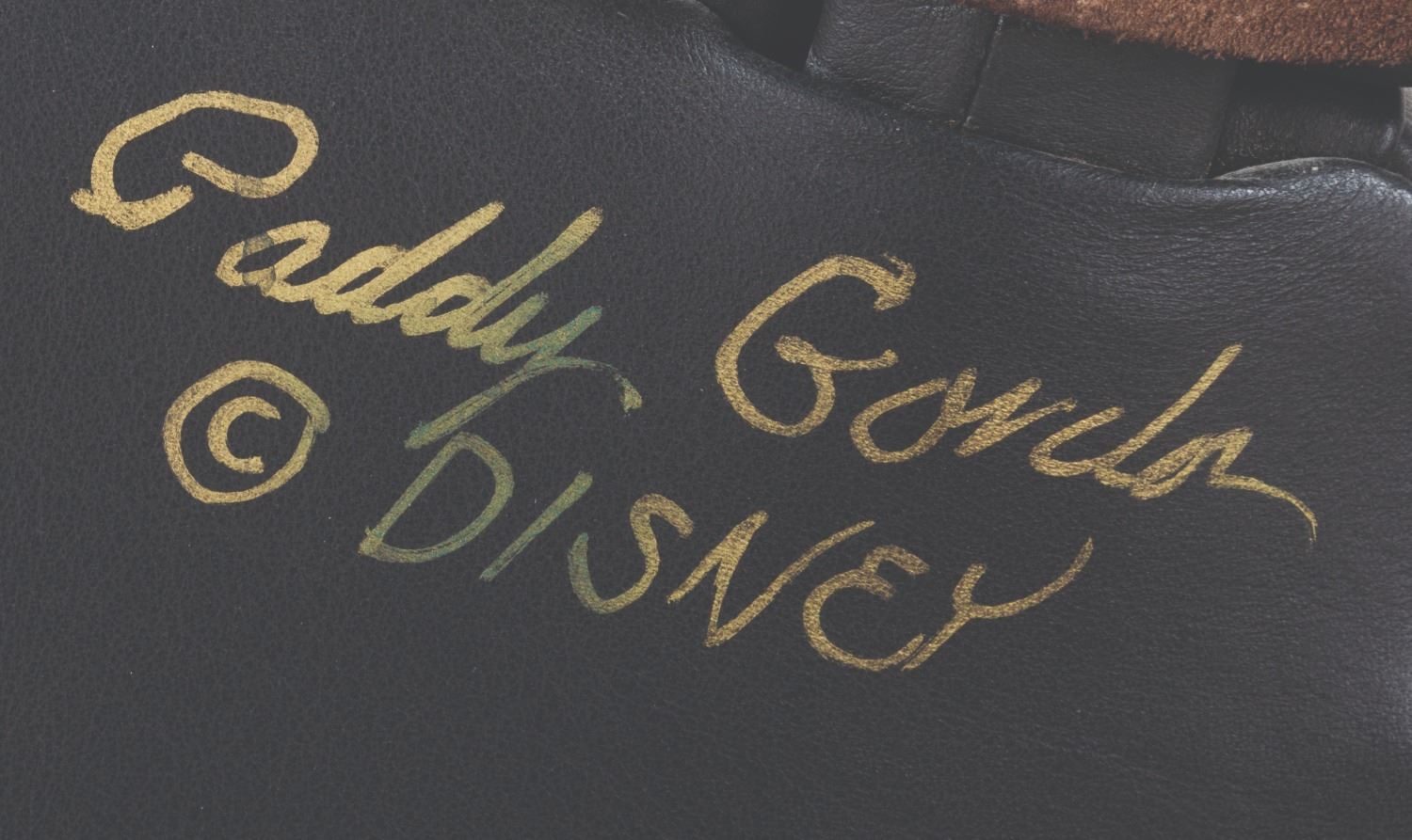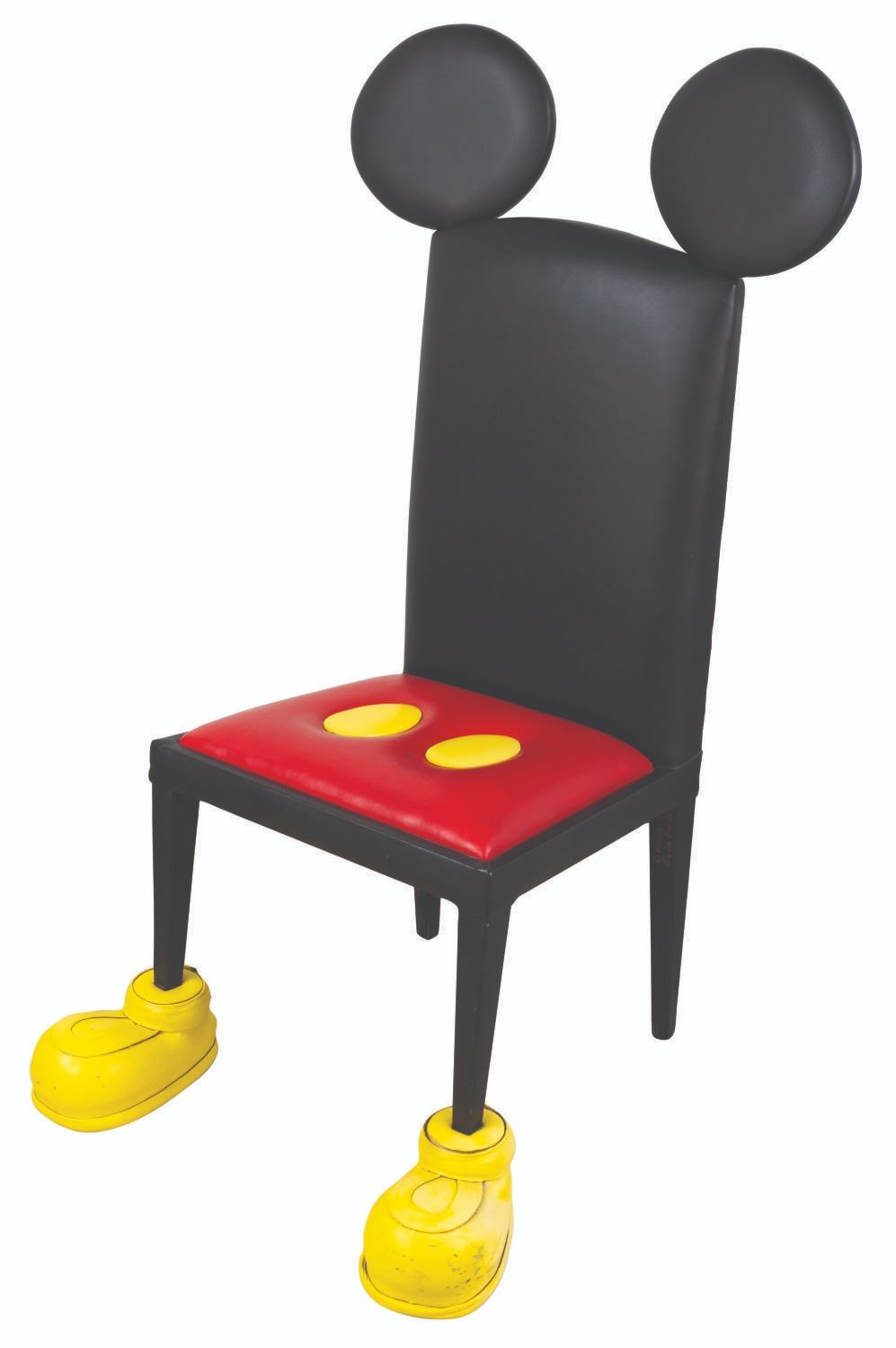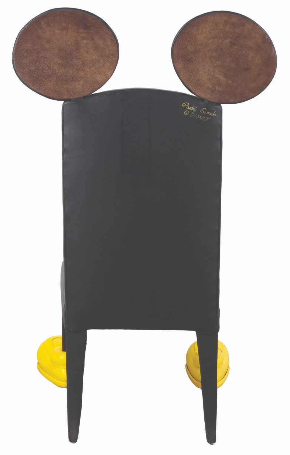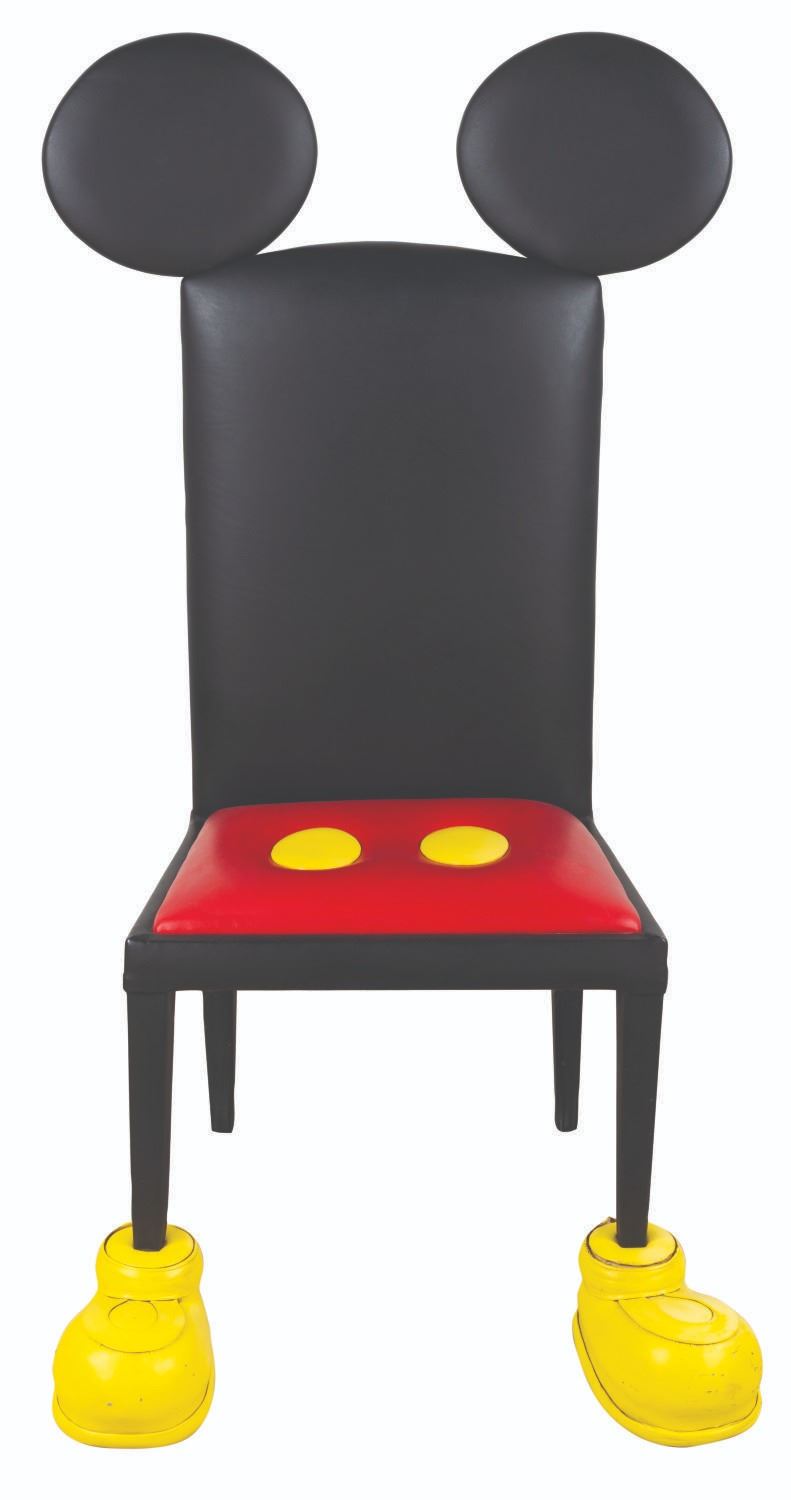 (Disney, 1994) An incredibly rare pair of Mickey Mouse chairs and their original framed concept drawings. Designed by Disney artist Paddy Gordon, these leather-upholstered pine chairs incorporate Mickey's trademark red shorts and yellow shoes into modern high-end furniture. Included are three hand-drawn concepts accomplished in ink, marker, and colored pencil, which depict the chairs, an armchair, and a Mickey ottoman. The chairs and framed concept drawings are all signed by the artist. Measuring 28" x 28" x 51" tall each, the chairs are in good condition with wear, light soiling, scratches, tape outline on the back of one chair, the black backing missing from one set of ears, and scuffs, notably on the shoes. With image sizes ranging from 6" x 8.5" to 8" x 11" in the 19" x 43" frame, the concept drawings are in fine condition with light wear to the frame. Due to size and weight, this lot requires special shipping arrangements. Please inquire before bidding.