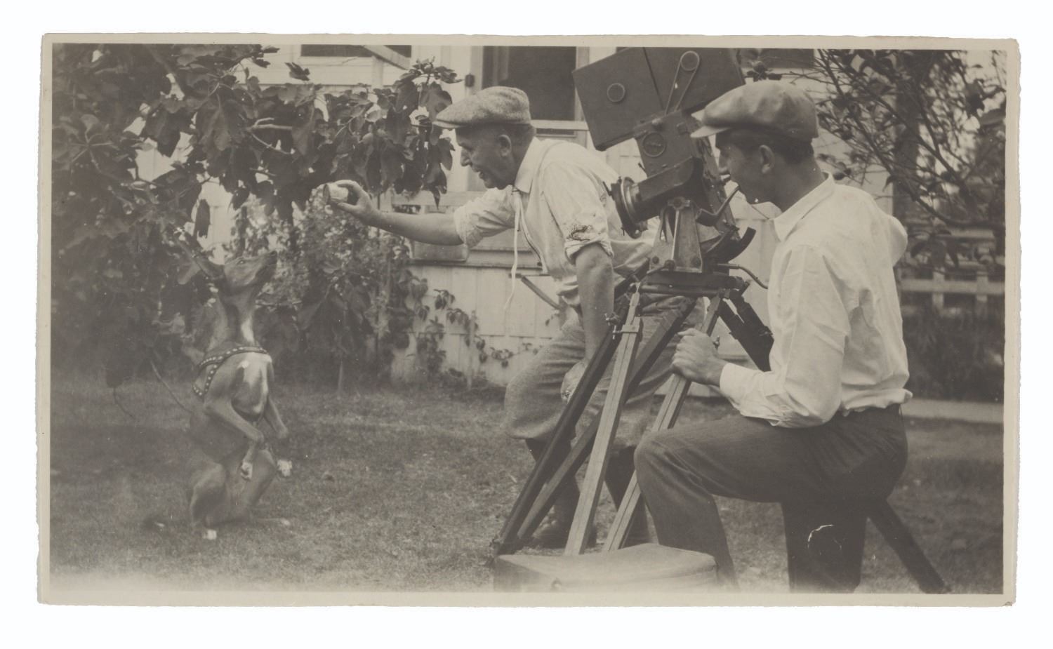 (Disney, 1923) An extremely rare early photo of Walt Disney and his Uncle Robert. The 4” x 2.5” photo came from the estate of Carl Stalling and features Disney filming Robert’s dog in the yard of his Uncle’s House at 4406 Kingswell Ave in Los Angeles. The photo is in good condition with some paper residue on the back from a previous mounting in a scrapbook.