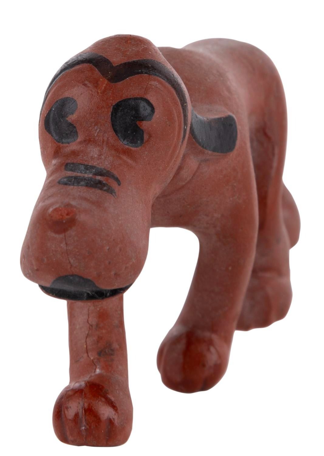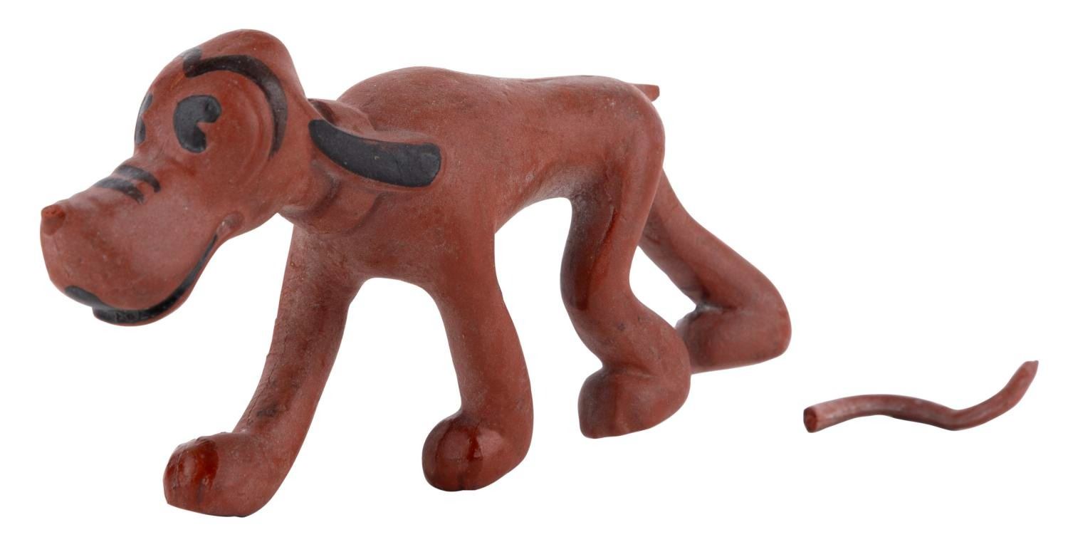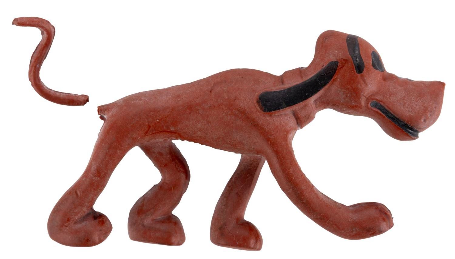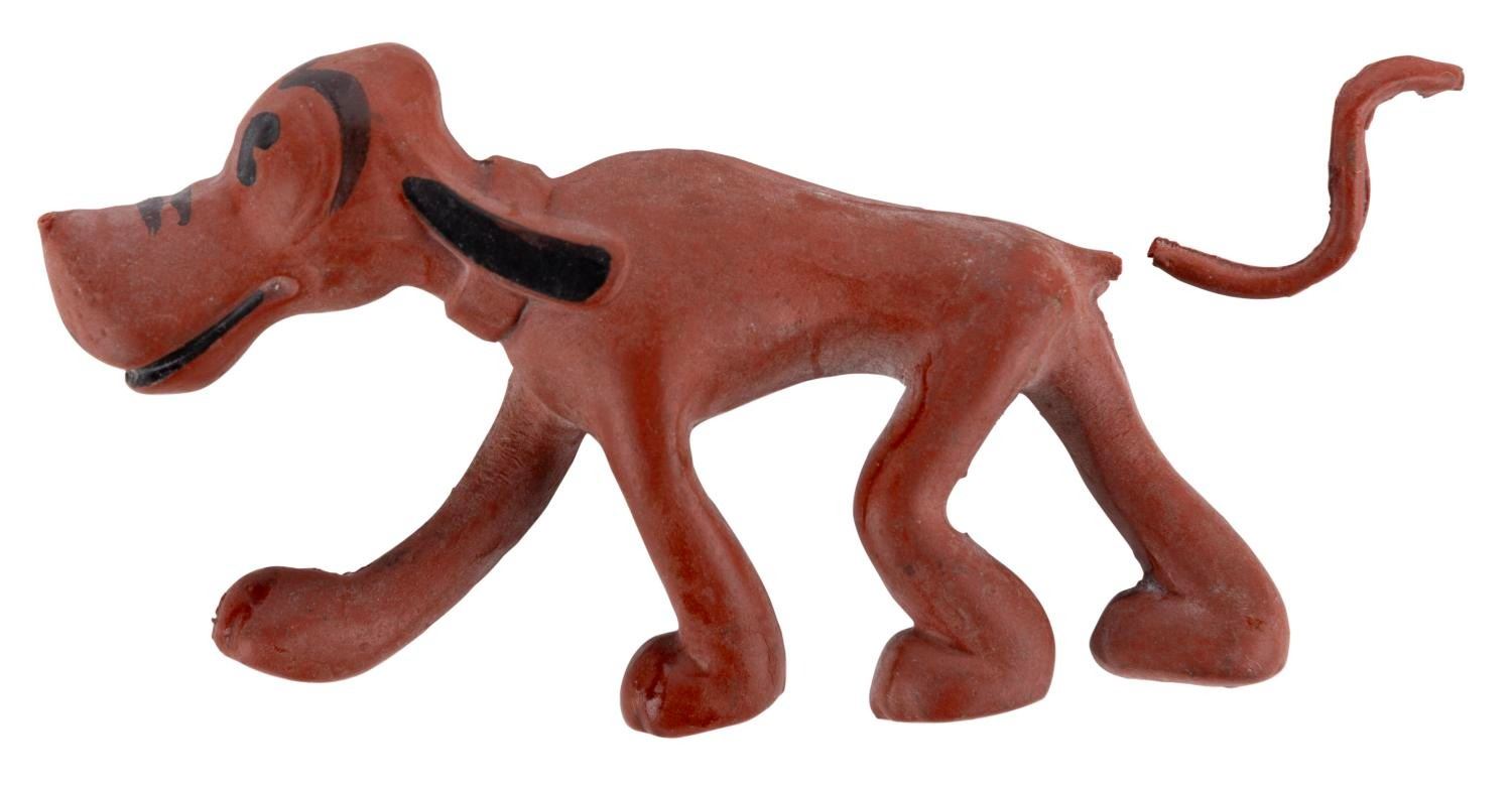 (Seiberling, 1930s) A very rare Pluto latex figure manufactured by Seiberling. Measuring 3.75" long, the figure of Mickey's pup is in good condition, exhibiting slight wear. The figure's tail is broken in two pieces but has been retained.