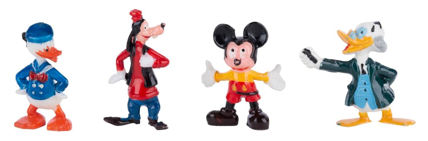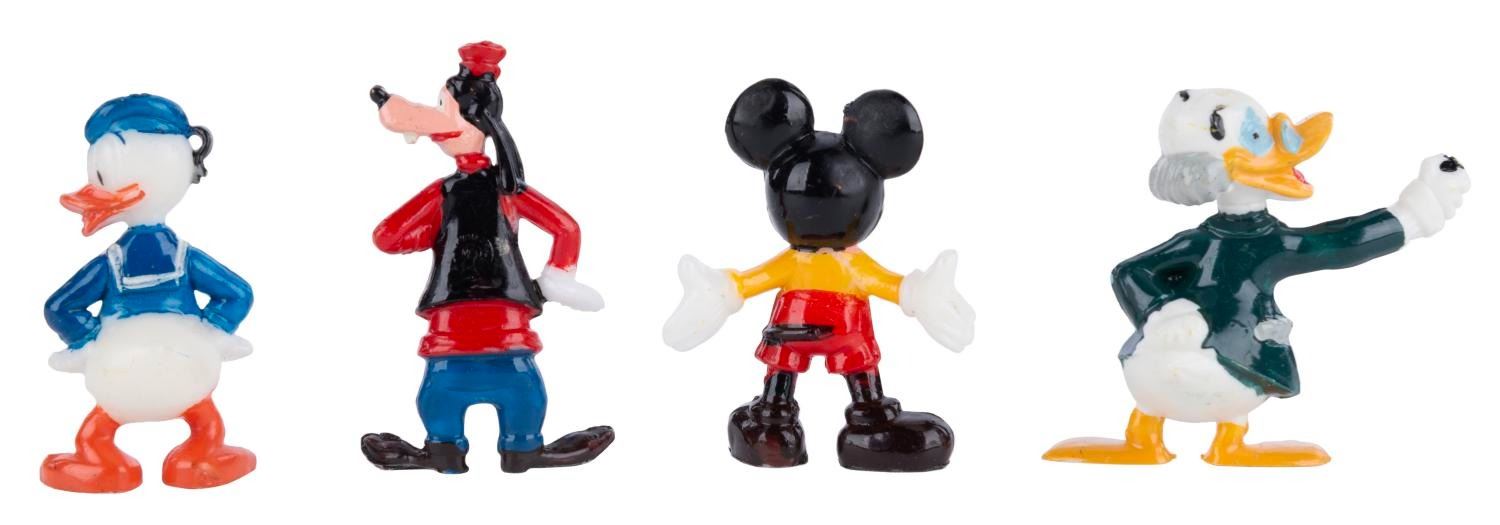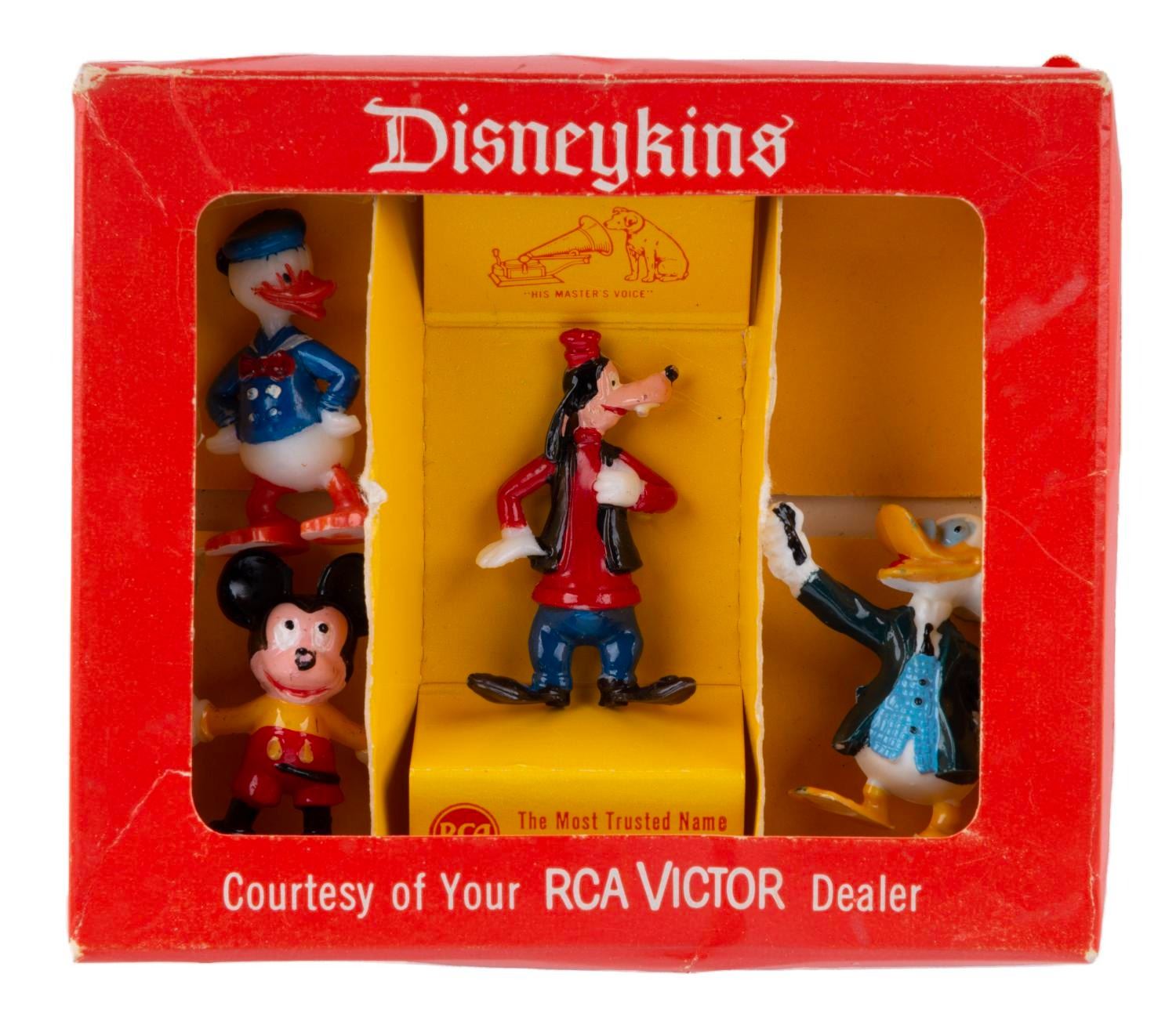 (MARX, 1961) A rare RCA Victor promotional Disneykins boxed set by Louis-MARX Toys. The boxed set was released as a promotional gift for Color Televisions, coinciding with the debut of "Walt Disney's Wonderful World of Color," and contains miniature figures of Donald, Goofy, Pluto, Mickey Mouse, and Ludwig Von Drake. Each figure is in fine condition within its 4.25" x 3.75" very good condition box, with fine condition loose figures, few minor creases, and wear to the edges and corners from handling.