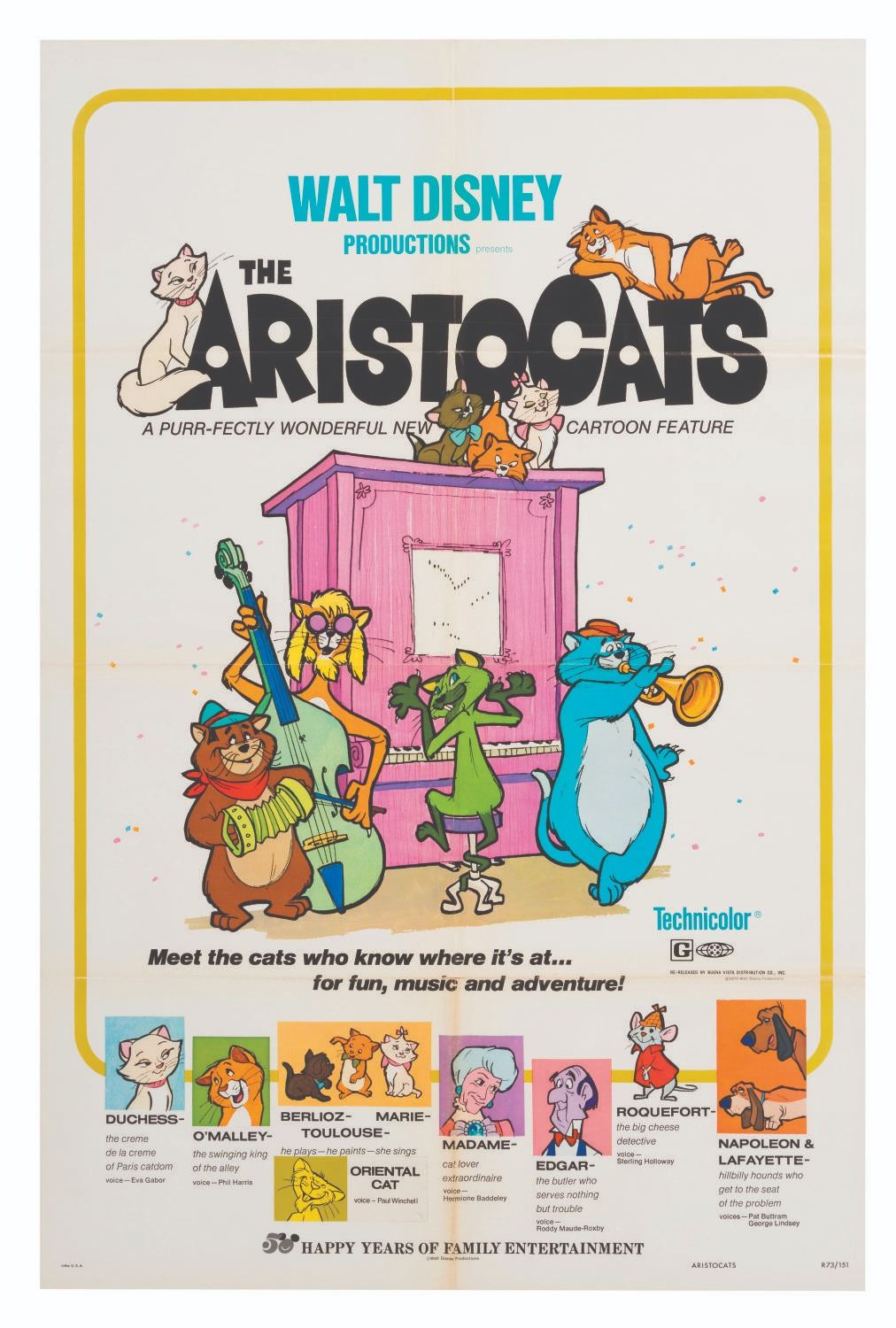 (Disney, 1973) A one-sheet for the 1973 re-release of "The Aristocats,” featuring an "Oriental Cat, Voice - Paul Winchell” sticker not common to these posters. Measuring 27” x 41”, the poster is in good condition with creases, wear along the folds, separation at the center folds, stains, and discoloration from age.