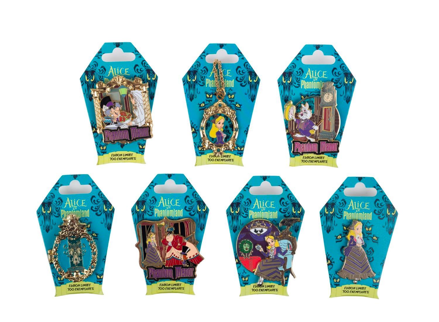 (Disneyland Resort Paris, 2015) A Signed Set of (6) Alice in Phantomland Pins & Necklace. Among the lot are (6) pins and (1) necklace featuring Alice, the Mad Hatter, White Rabbit and Queen of Hearts as Phantom Manor characters. Each one is numbered on the reverse and either signed or initialed by artist Laurent Predalle. The pins are in fine condition on their original cards.