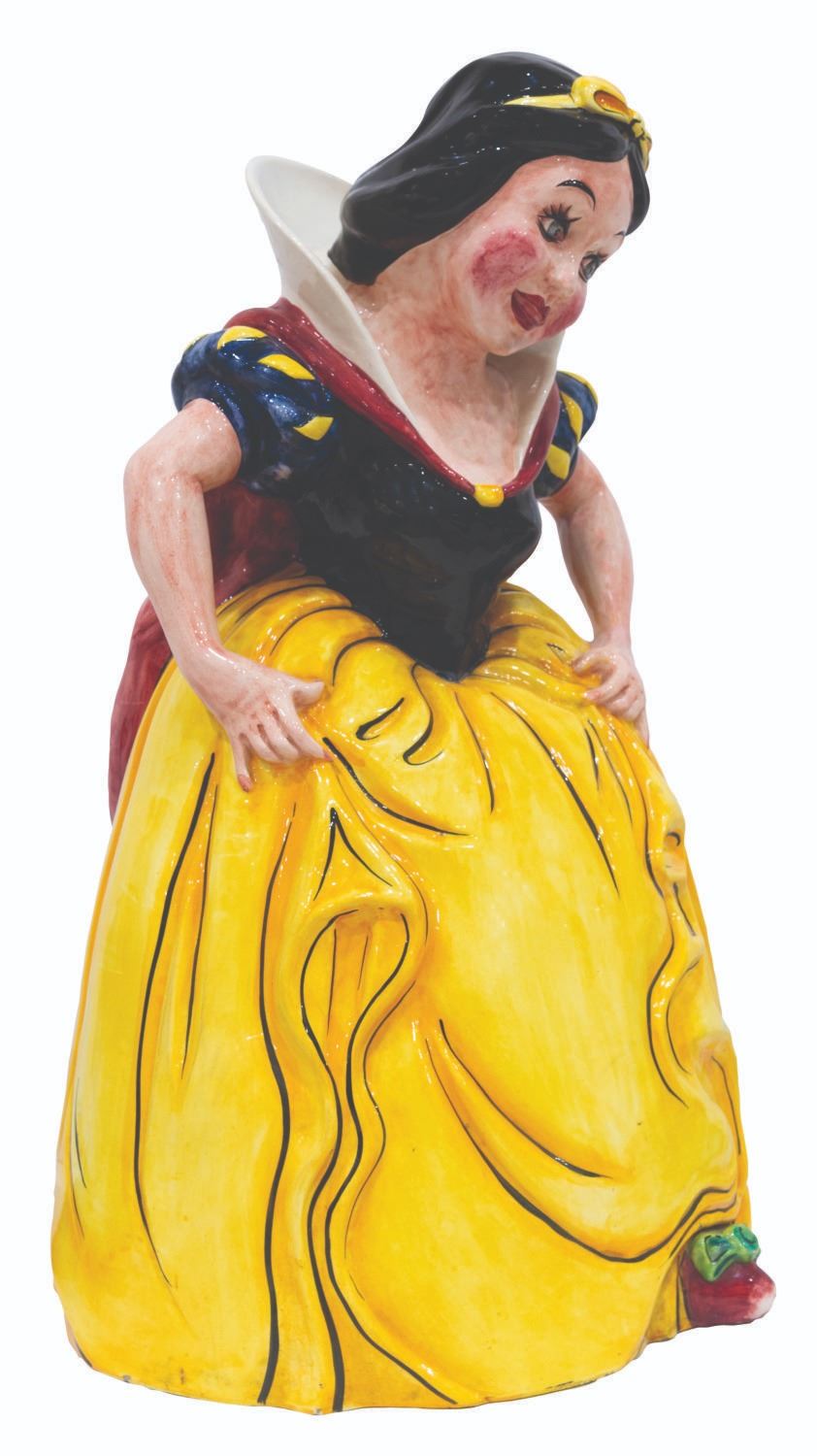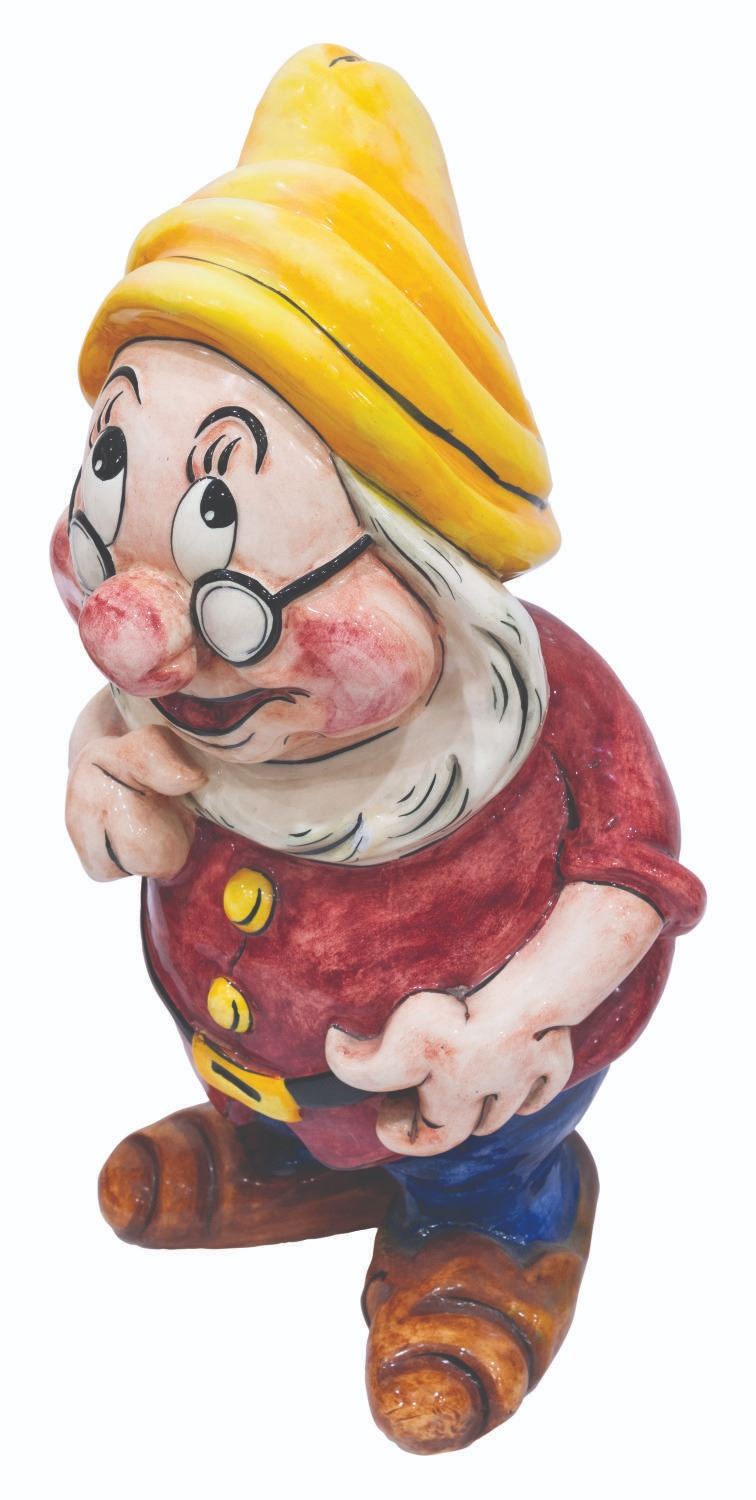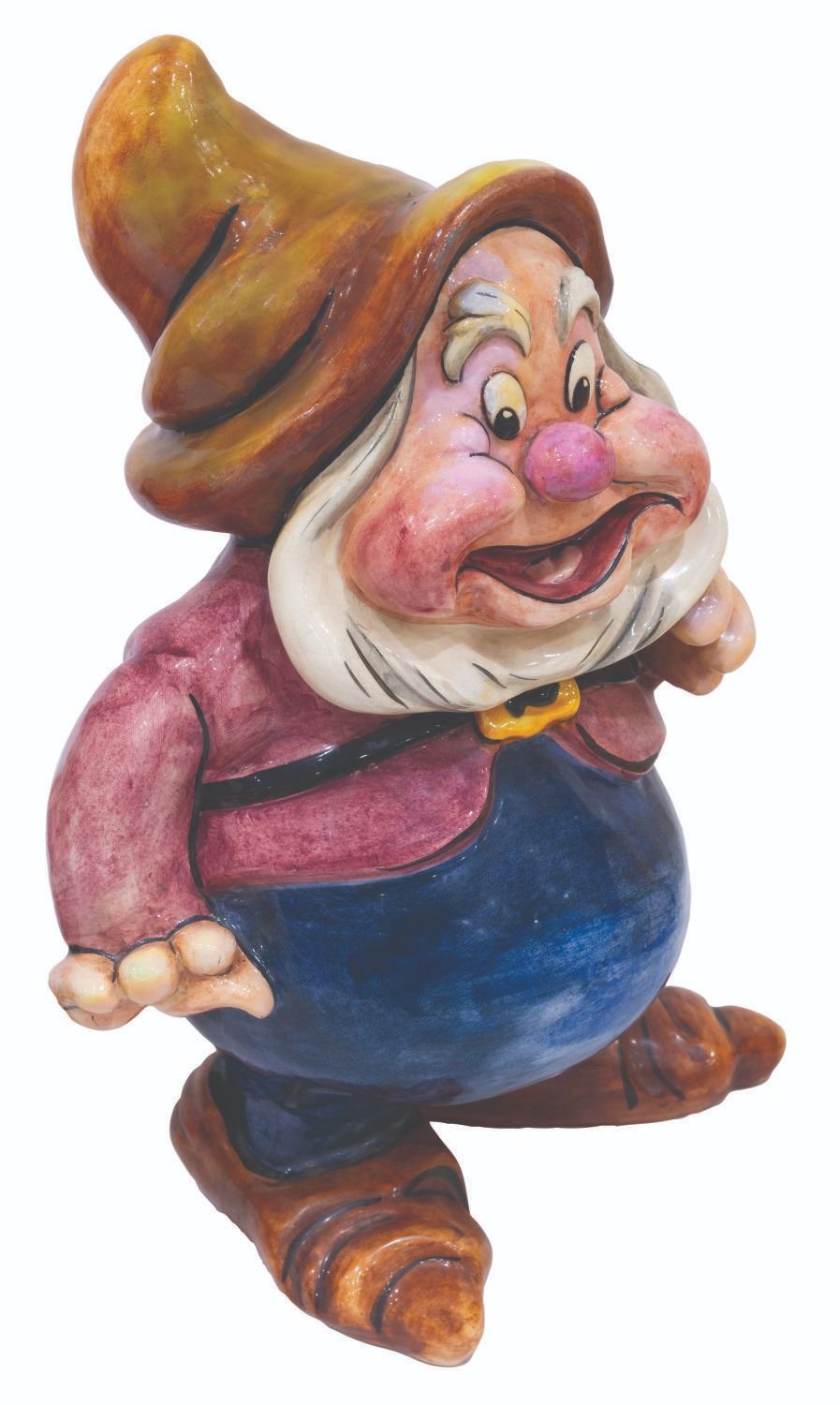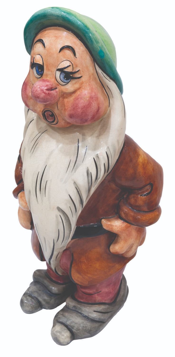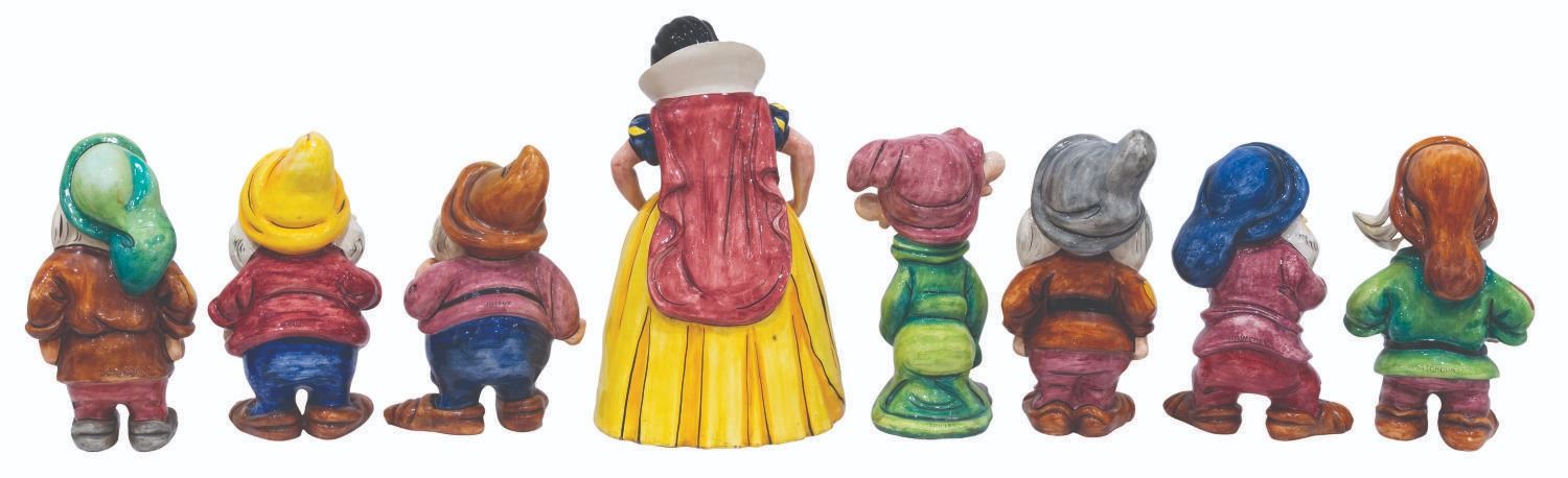 (Masse Freres, 1938/39) An incredible set of French ceramic “Snow White and The Seven Dwarfs” large figures. Manufactured using the Faience technique of earthenware and colored glazes in Desvres, France by Masse Freres, these amazing figures are some of the best we have ever seen. The Desvres region of France is known for its Faience and it is considered some of the highest quality in Europe. The Dwarfs measure between 21" and 23" tall. Each one has his French name in relief on his back. Snow White measures an amazing 31" tall. All have a maker mark as well as a Walt Disney copyright underneath. All eight figures are in fine condition with light wear and the original glazing still bright. These were only made for the European market and because of their size, might have been intended as lawn ornaments. This is one of only two intact sets we have ever seen. Because of size and weight, special shipping arrangements may be necessary. Please inquire before bidding.