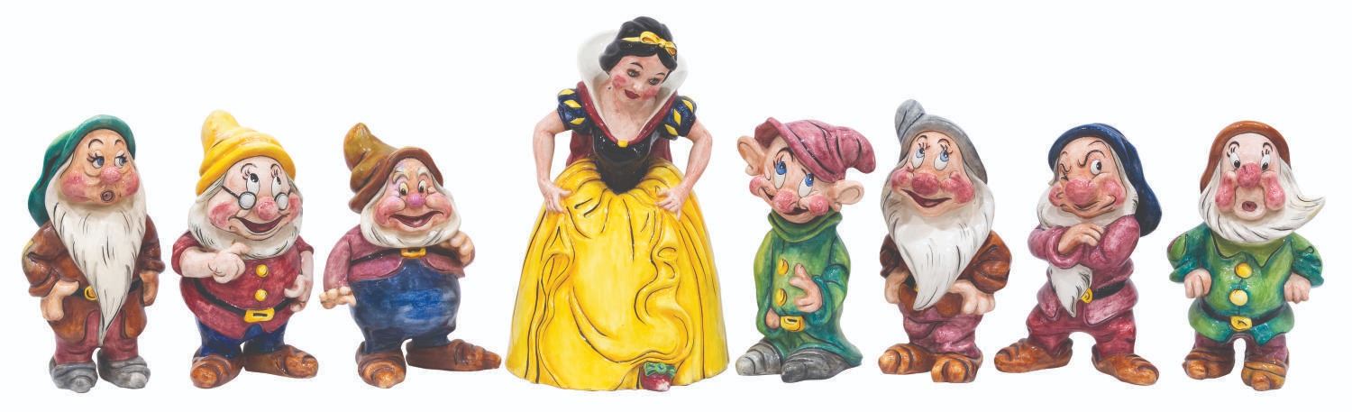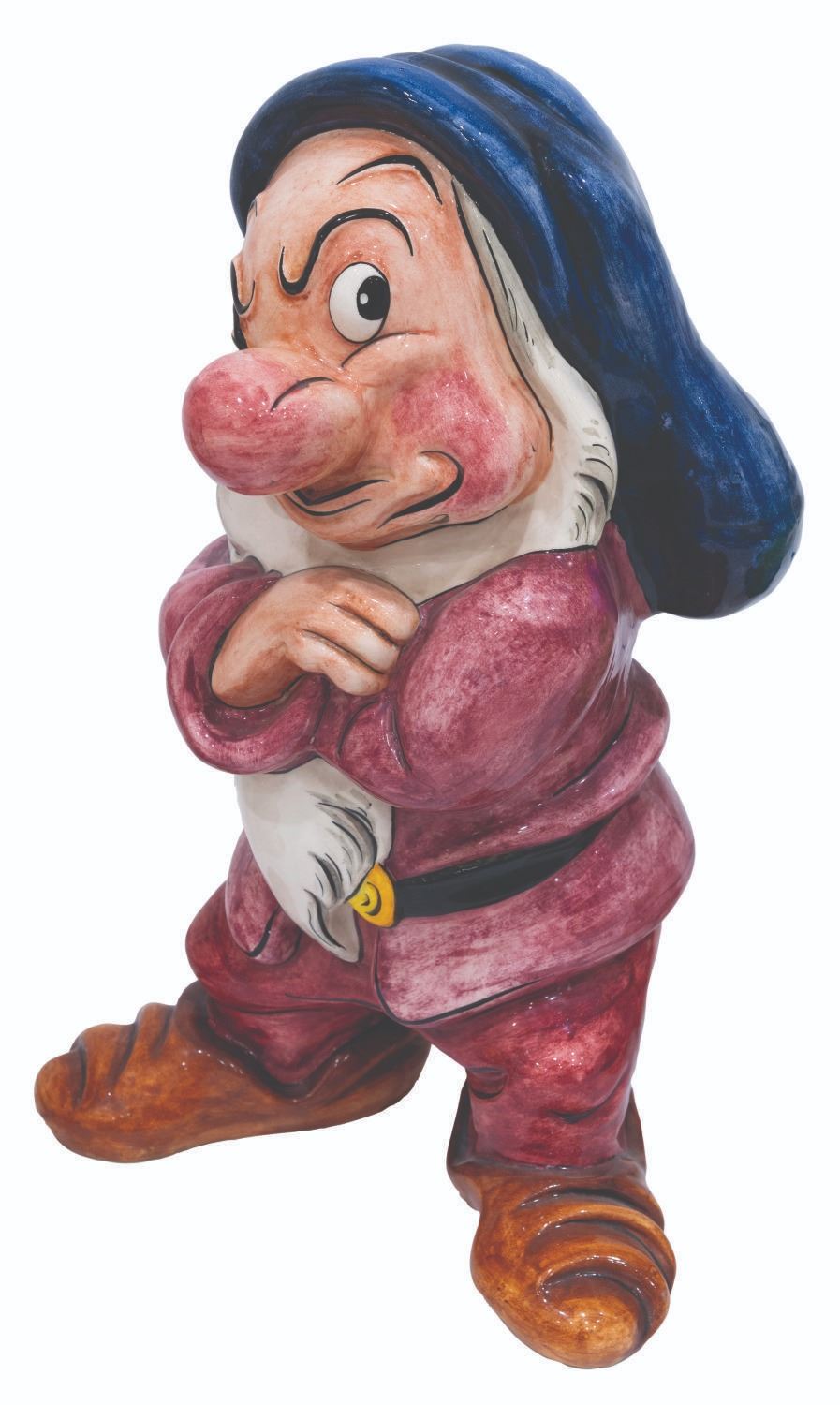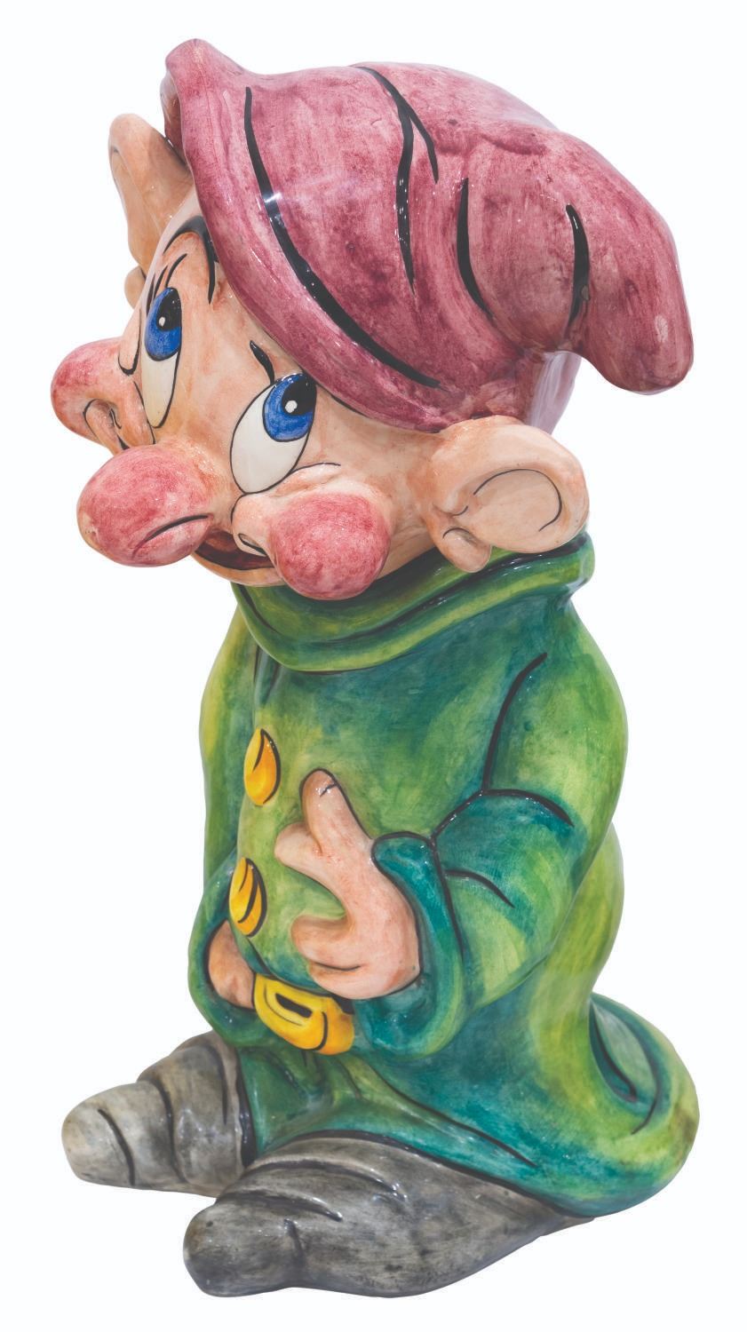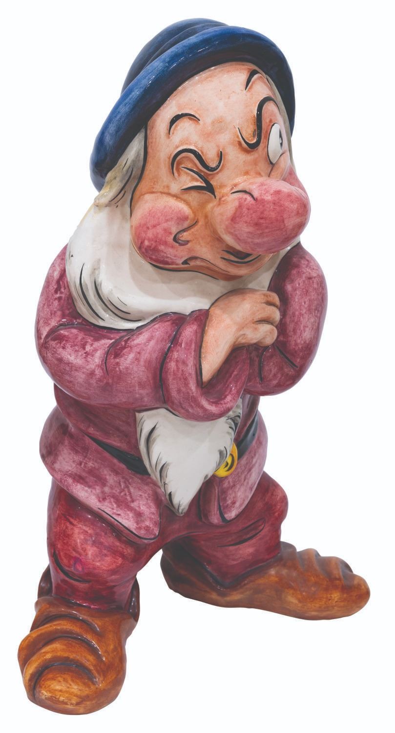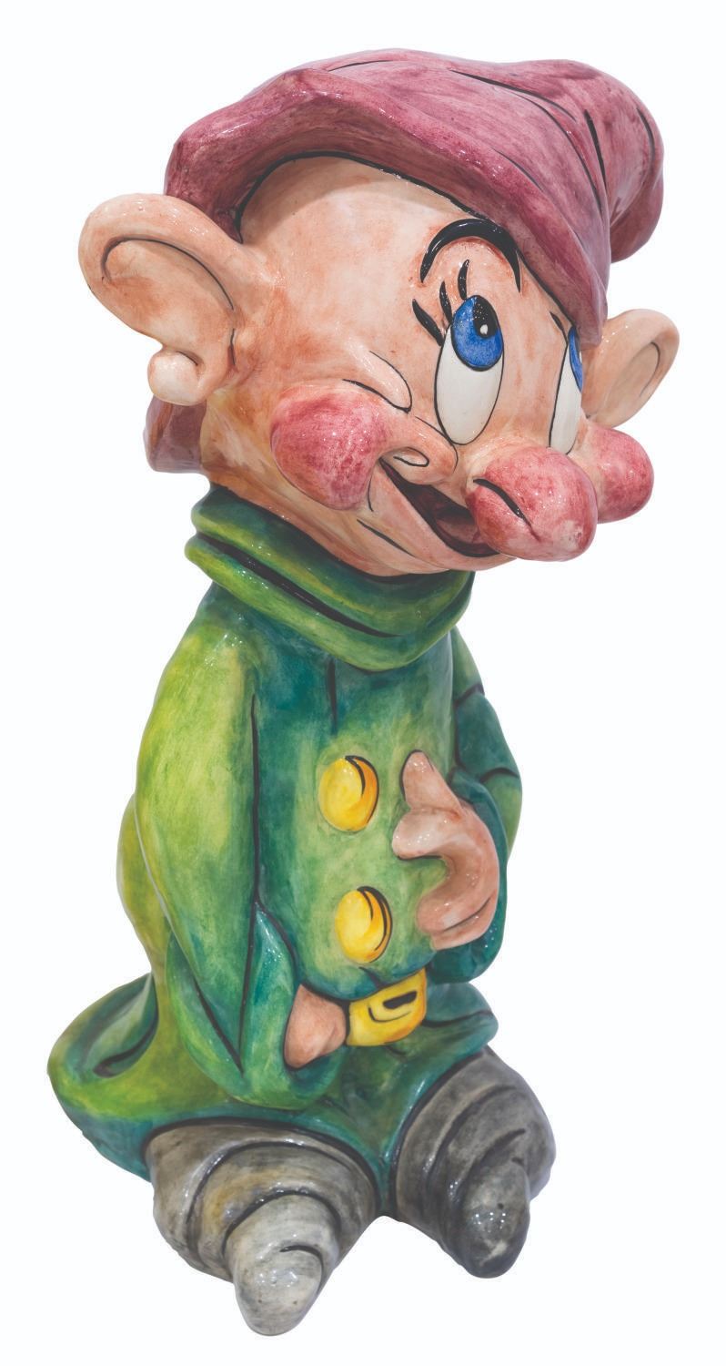 (Masse Freres, 1938/39) An incredible set of French ceramic “Snow White and The Seven Dwarfs” large figures. Manufactured using the Faience technique of earthenware and colored glazes in Desvres, France by Masse Freres, these amazing figures are some of the best we have ever seen. The Desvres region of France is known for its Faience and it is considered some of the highest quality in Europe. The Dwarfs measure between 21" and 23" tall. Each one has his French name in relief on his back. Snow White measures an amazing 31" tall. All have a maker mark as well as a Walt Disney copyright underneath. All eight figures are in fine condition with light wear and the original glazing still bright. These were only made for the European market and because of their size, might have been intended as lawn ornaments. This is one of only two intact sets we have ever seen. Because of size and weight, special shipping arrangements may be necessary. Please inquire before bidding.