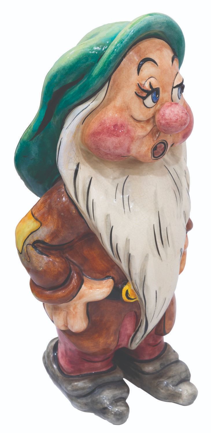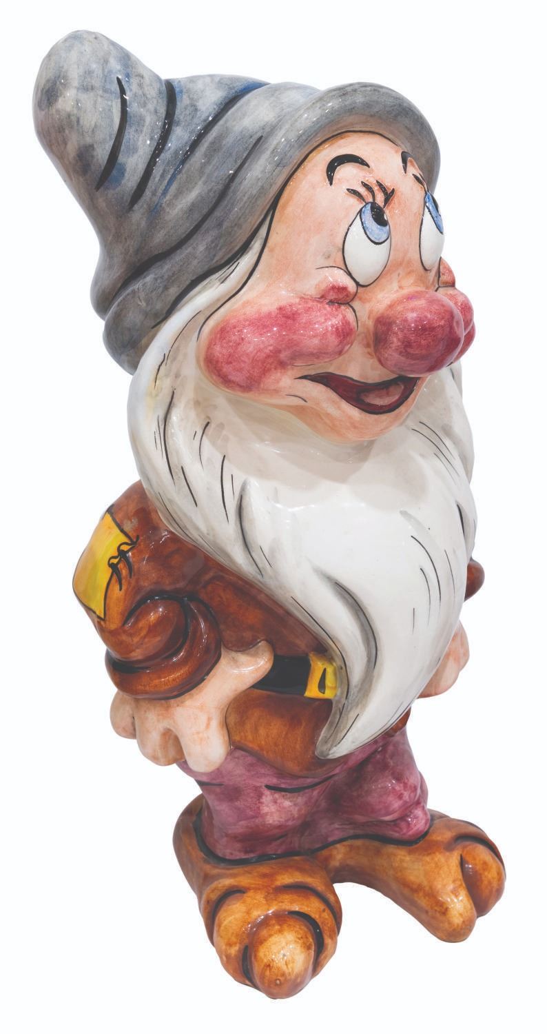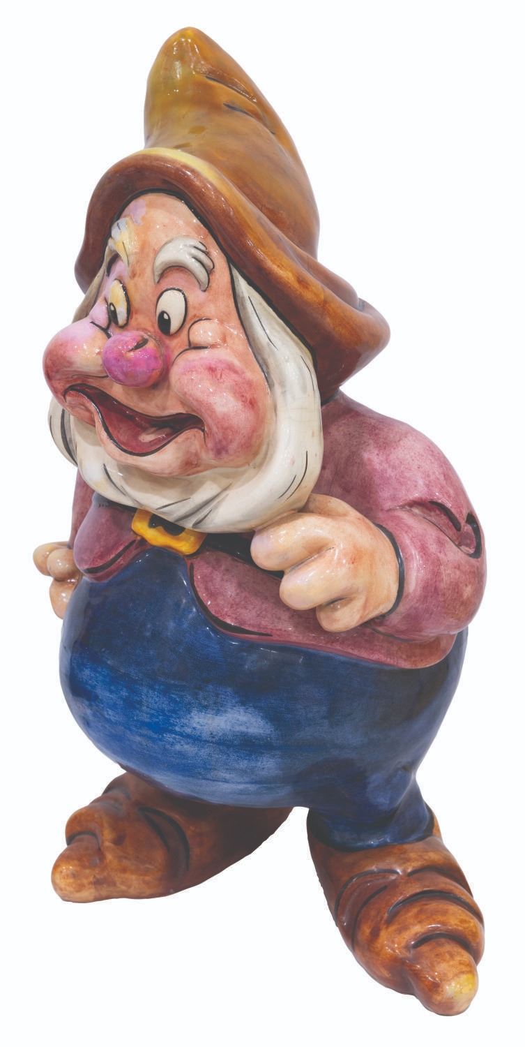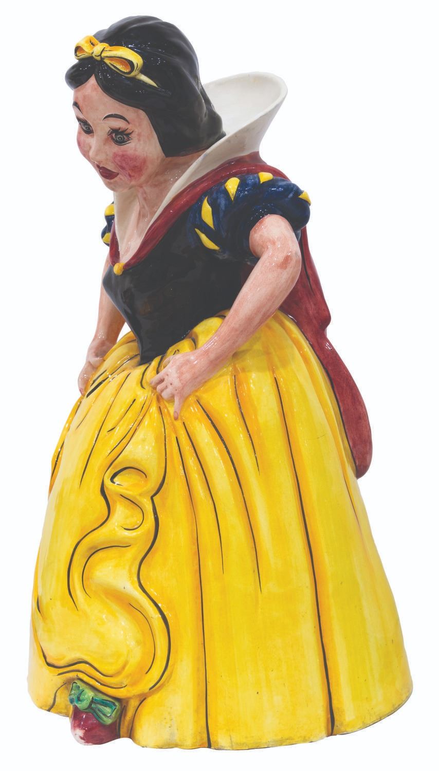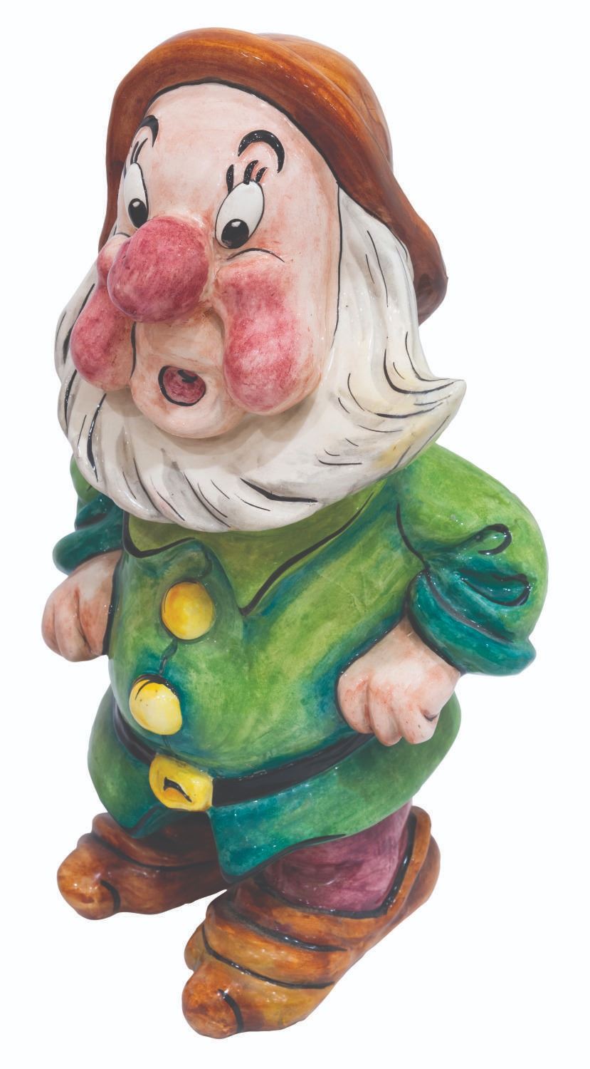 (Masse Freres, 1938/39) An incredible set of French ceramic “Snow White and The Seven Dwarfs” large figures. Manufactured using the Faience technique of earthenware and colored glazes in Desvres, France by Masse Freres, these amazing figures are some of the best we have ever seen. The Desvres region of France is known for its Faience and it is considered some of the highest quality in Europe. The Dwarfs measure between 21" and 23" tall. Each one has his French name in relief on his back. Snow White measures an amazing 31" tall. All have a maker mark as well as a Walt Disney copyright underneath. All eight figures are in fine condition with light wear and the original glazing still bright. These were only made for the European market and because of their size, might have been intended as lawn ornaments. This is one of only two intact sets we have ever seen. Because of size and weight, special shipping arrangements may be necessary. Please inquire before bidding.