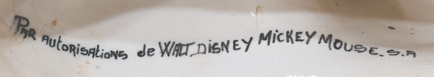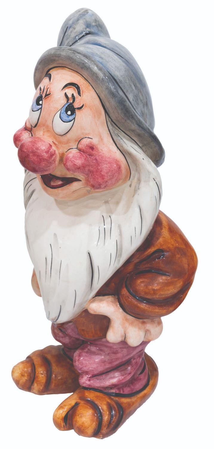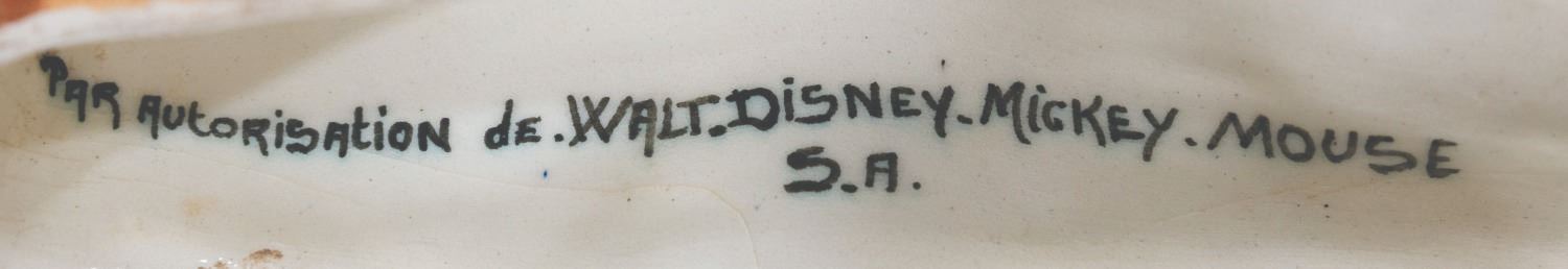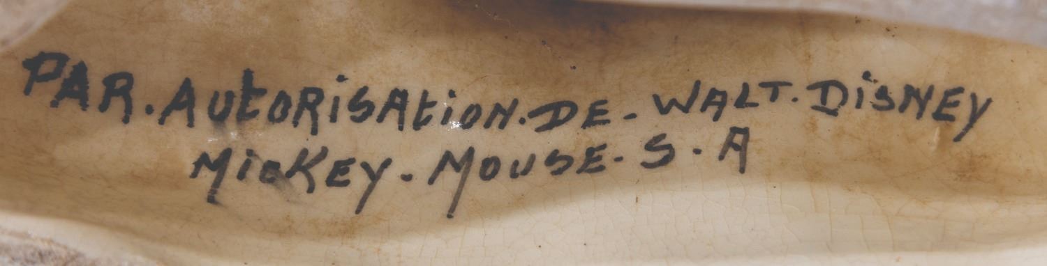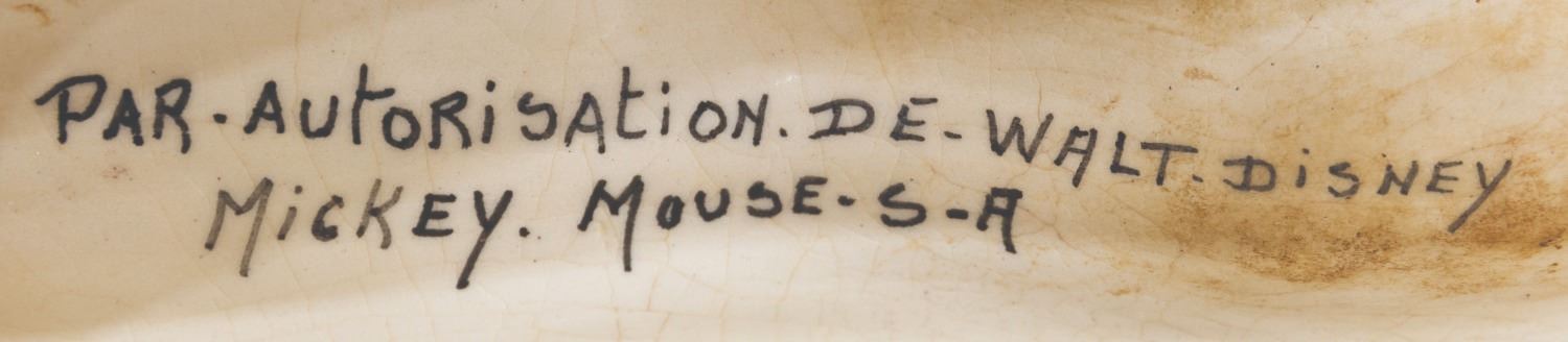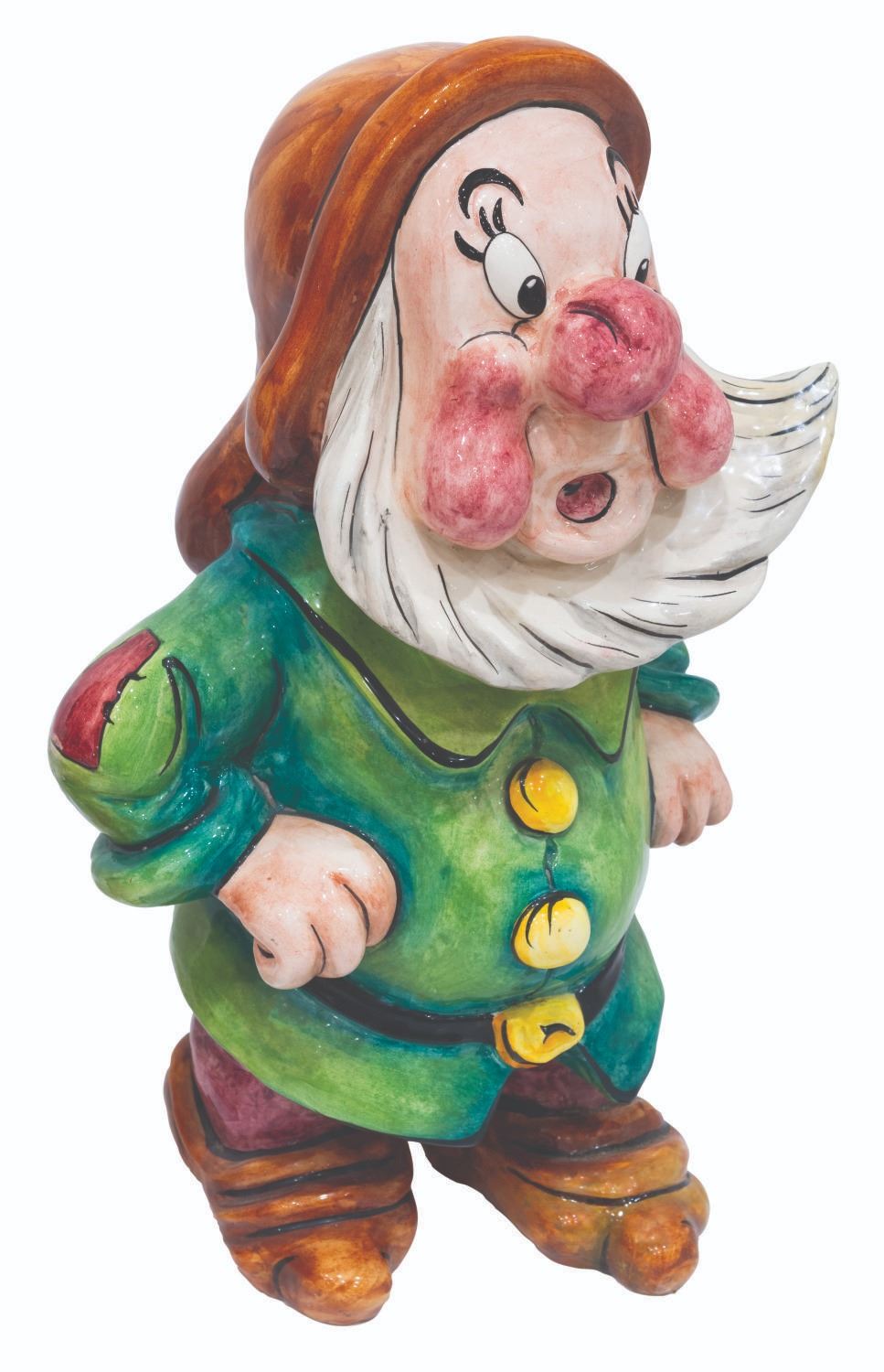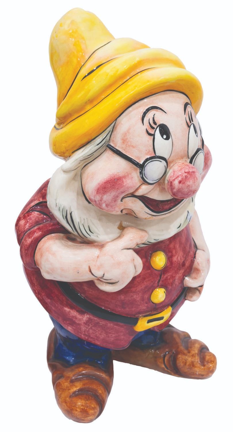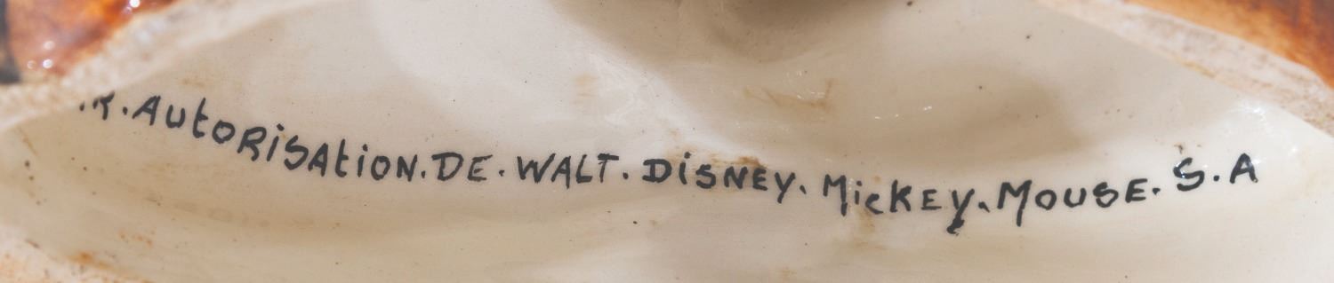 (Masse Freres, 1938/39) An incredible set of French ceramic “Snow White and The Seven Dwarfs” large figures. Manufactured using the Faience technique of earthenware and colored glazes in Desvres, France by Masse Freres, these amazing figures are some of the best we have ever seen. The Desvres region of France is known for its Faience and it is considered some of the highest quality in Europe. The Dwarfs measure between 21" and 23" tall. Each one has his French name in relief on his back. Snow White measures an amazing 31" tall. All have a maker mark as well as a Walt Disney copyright underneath. All eight figures are in fine condition with light wear and the original glazing still bright. These were only made for the European market and because of their size, might have been intended as lawn ornaments. This is one of only two intact sets we have ever seen. Because of size and weight, special shipping arrangements may be necessary. Please inquire before bidding.