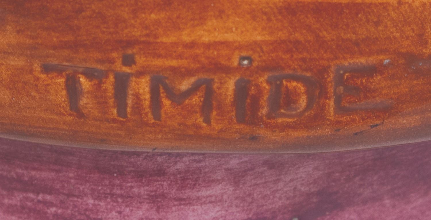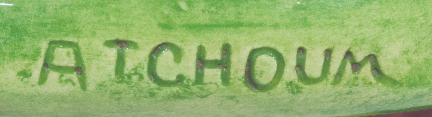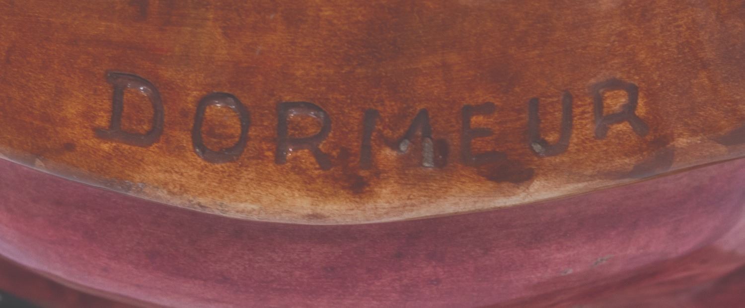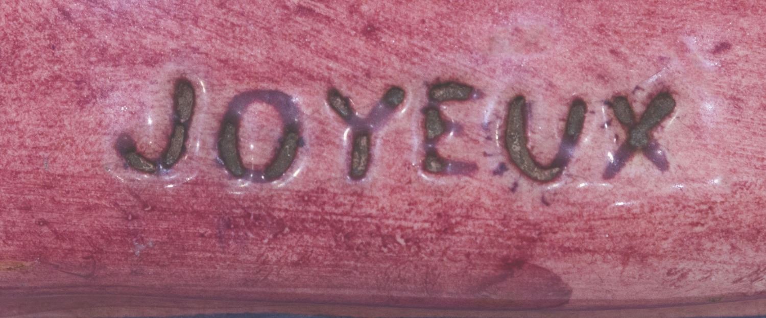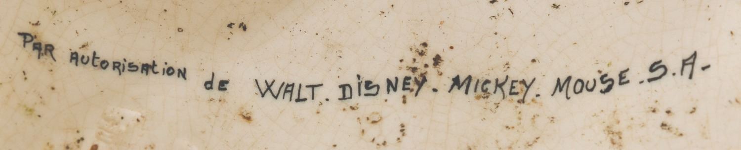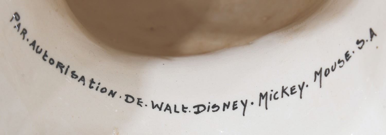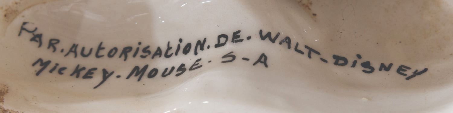 (Masse Freres, 1938/39) An incredible set of French ceramic “Snow White and The Seven Dwarfs” large figures. Manufactured using the Faience technique of earthenware and colored glazes in Desvres, France by Masse Freres, these amazing figures are some of the best we have ever seen. The Desvres region of France is known for its Faience and it is considered some of the highest quality in Europe. The Dwarfs measure between 21" and 23" tall. Each one has his French name in relief on his back. Snow White measures an amazing 31" tall. All have a maker mark as well as a Walt Disney copyright underneath. All eight figures are in fine condition with light wear and the original glazing still bright. These were only made for the European market and because of their size, might have been intended as lawn ornaments. This is one of only two intact sets we have ever seen. Because of size and weight, special shipping arrangements may be necessary. Please inquire before bidding.